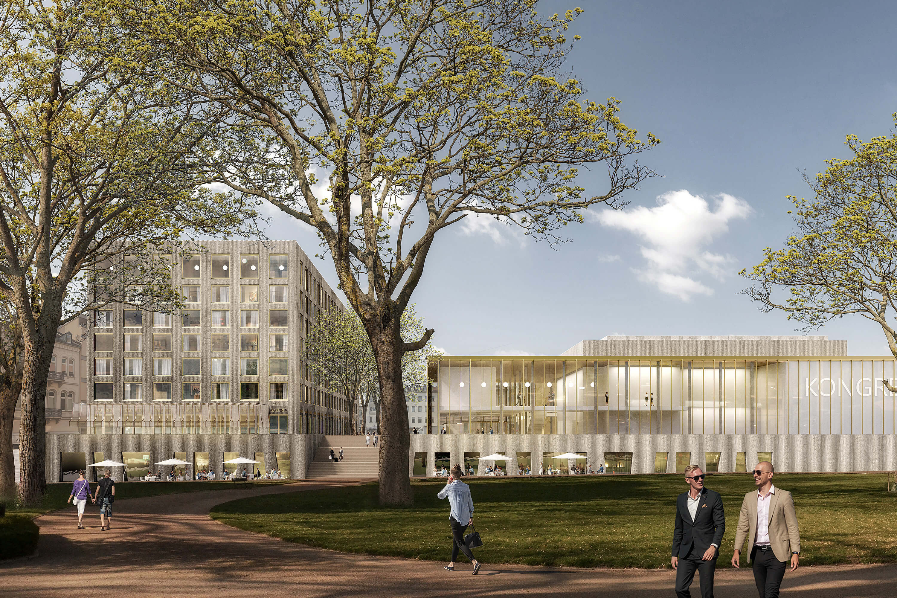 On a base that is conceived as an urban slab towards the city and as a pedestal towards the park, three buildings are grouped around a newly created city square that spatially and geometrically incorporates the opposite side of the historic post office. These three structures contain the three main functions of the complex: the hotel facing east, the conference center facing the park, and the theater facing the city and Louisenstrasse. Also facing Louisenstrasse is the two-story retail area housed in the hotel structure, with direct access from the street.