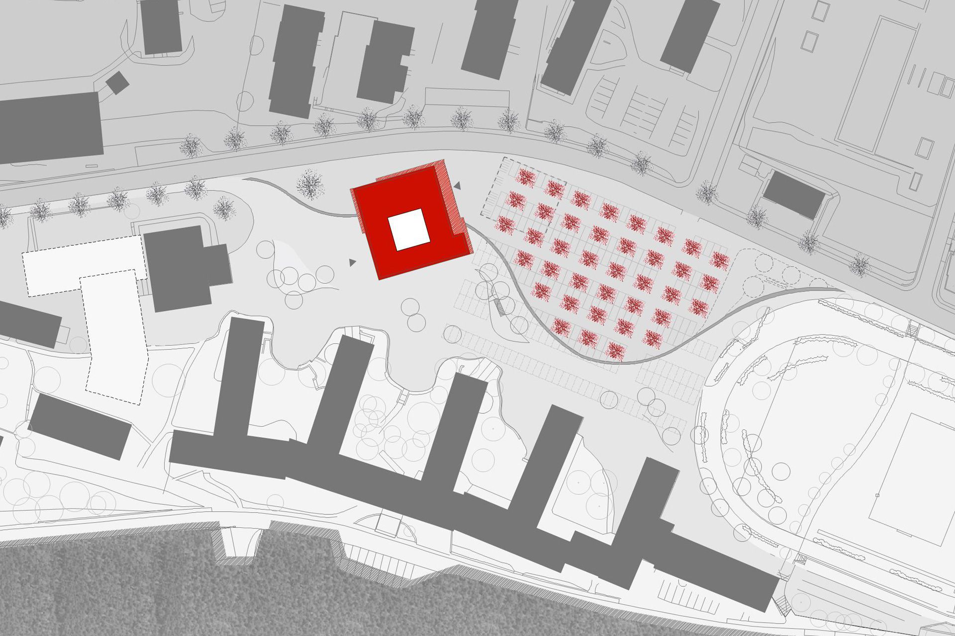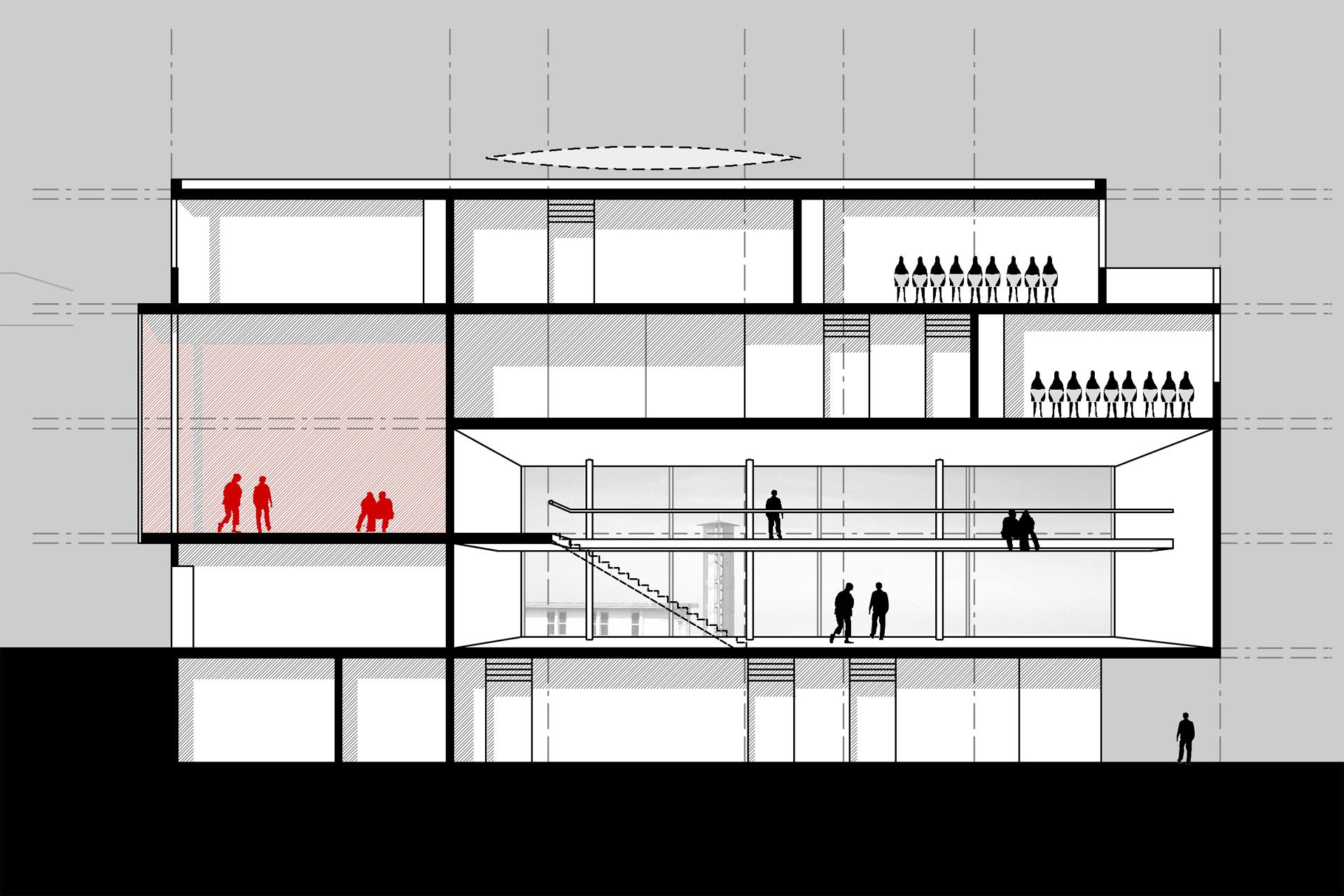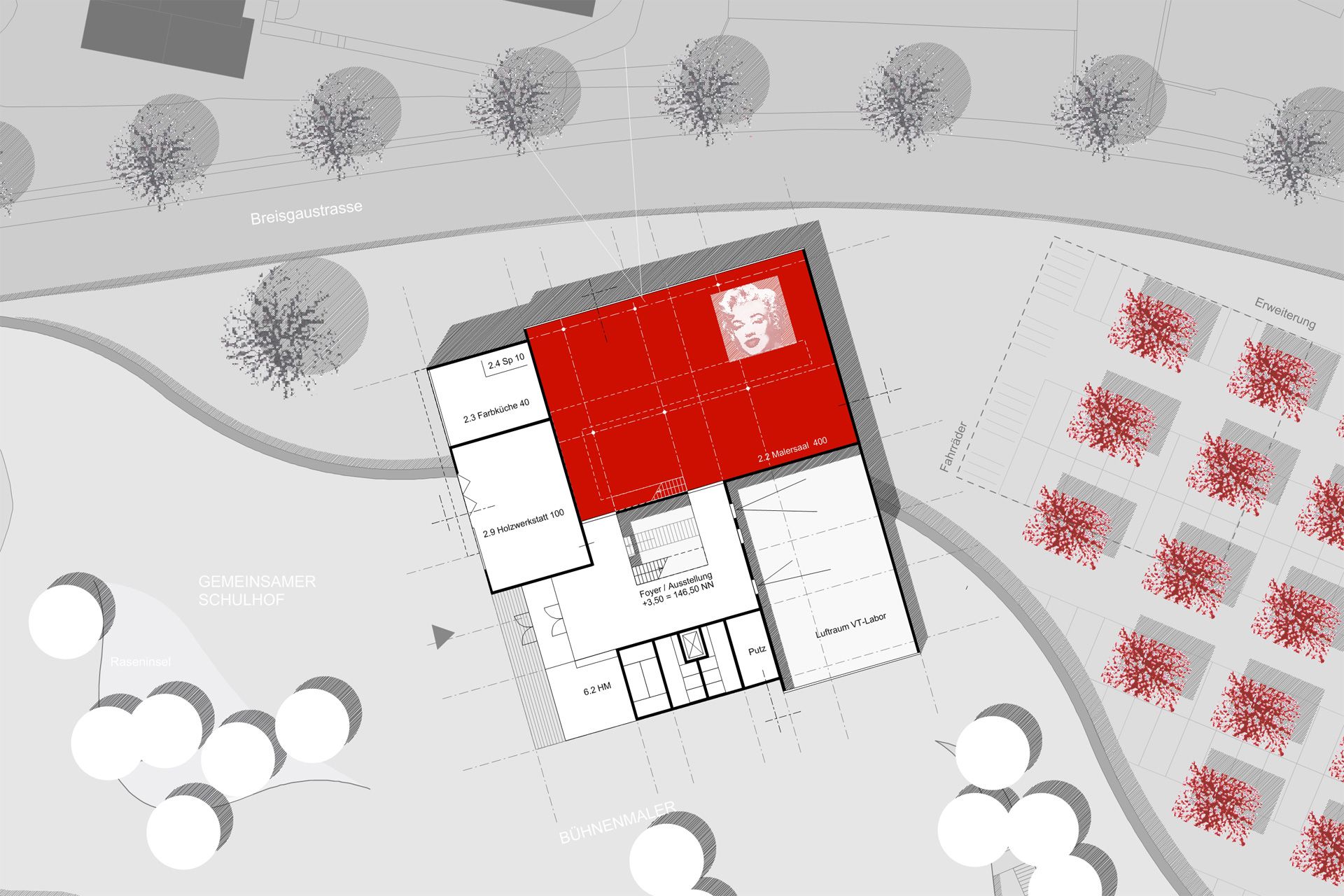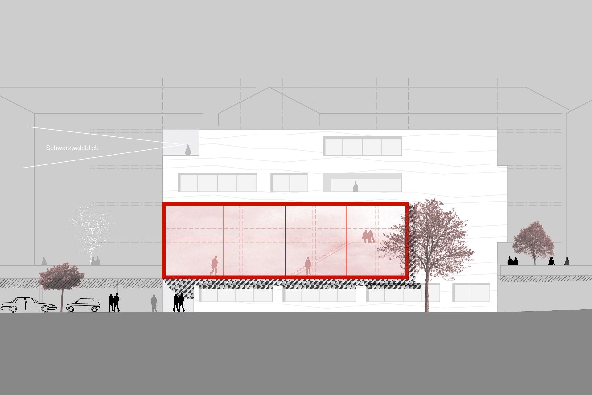 A solitary building, together with the terracing of the site, divides the property into open areas that can be used in a variety of ways. The striking five-finger building is given an appropriate apron, the curve of the balustrade becomes a belvedere with a view of the Black Forest. The parking areas disappear cost-effectively under a plane tree canopy. The building is conceived as a spatial and sculptural composition of the large lecture halls and is oriented around a centrally lit atrium. The individually designed common areas on each floor serve as circulation, break and communication areas.