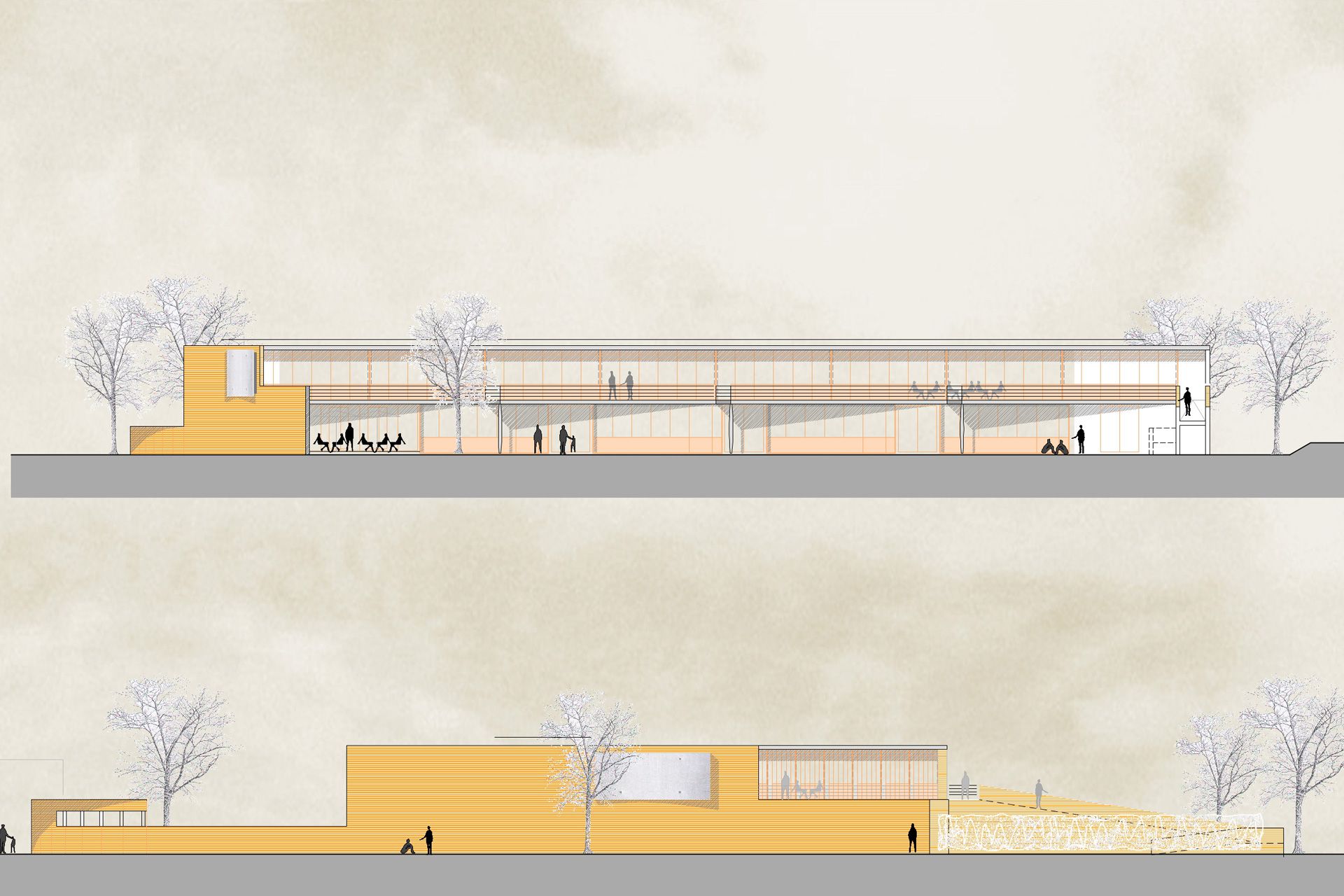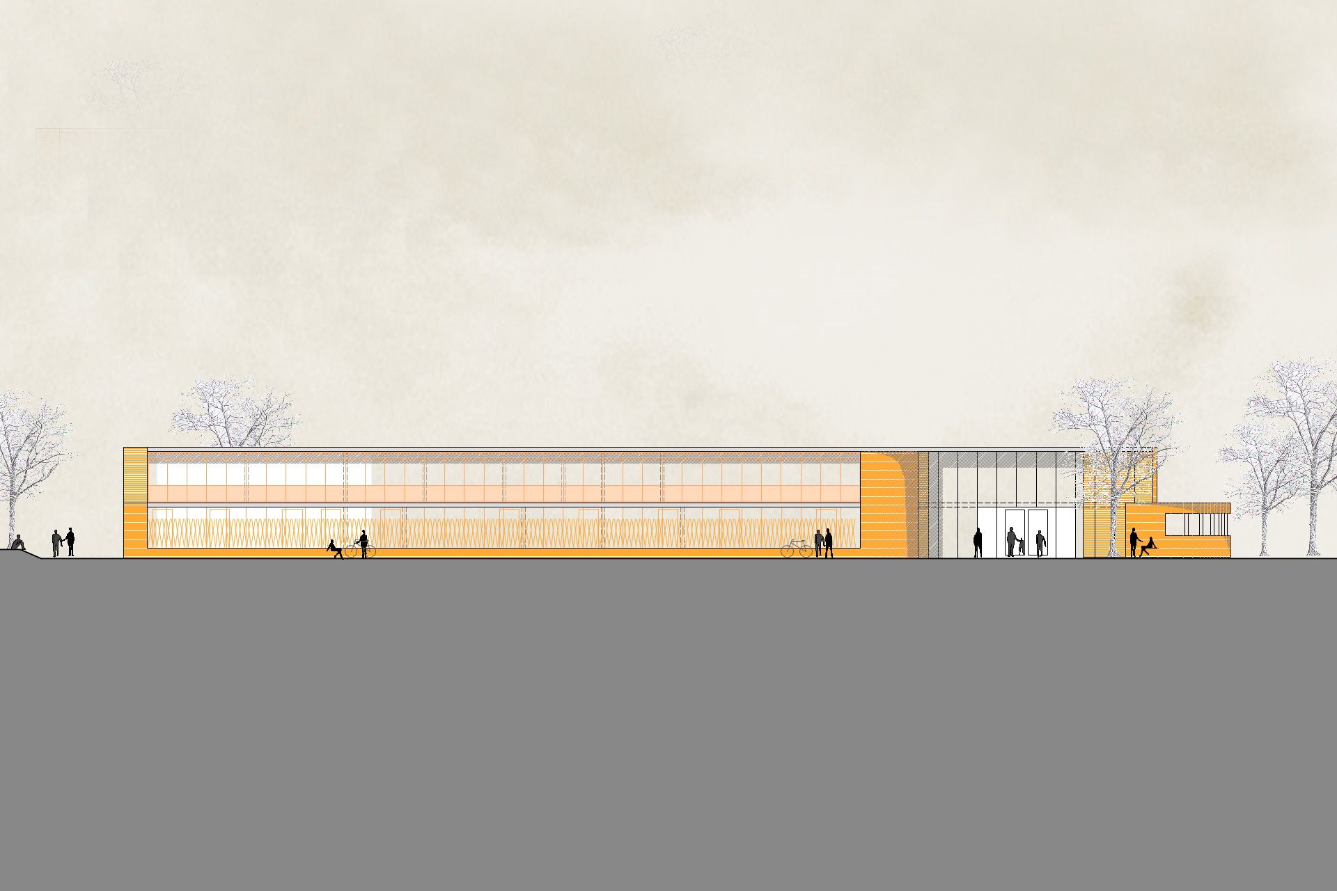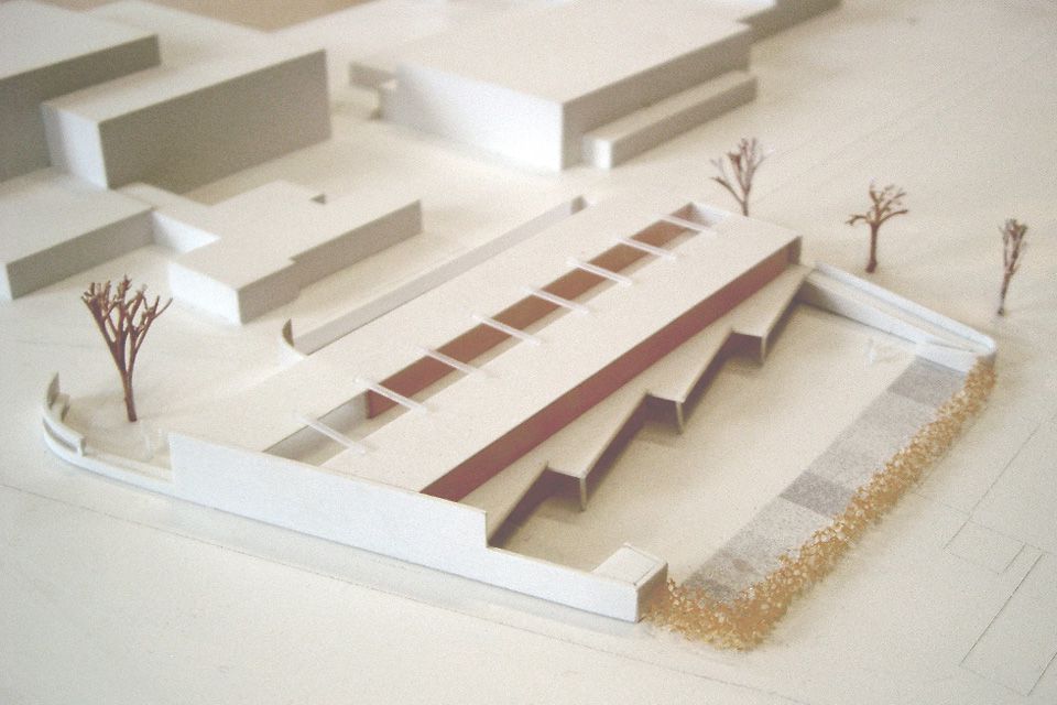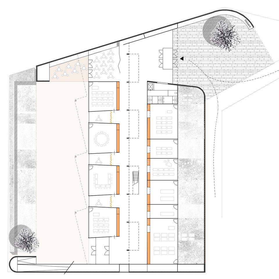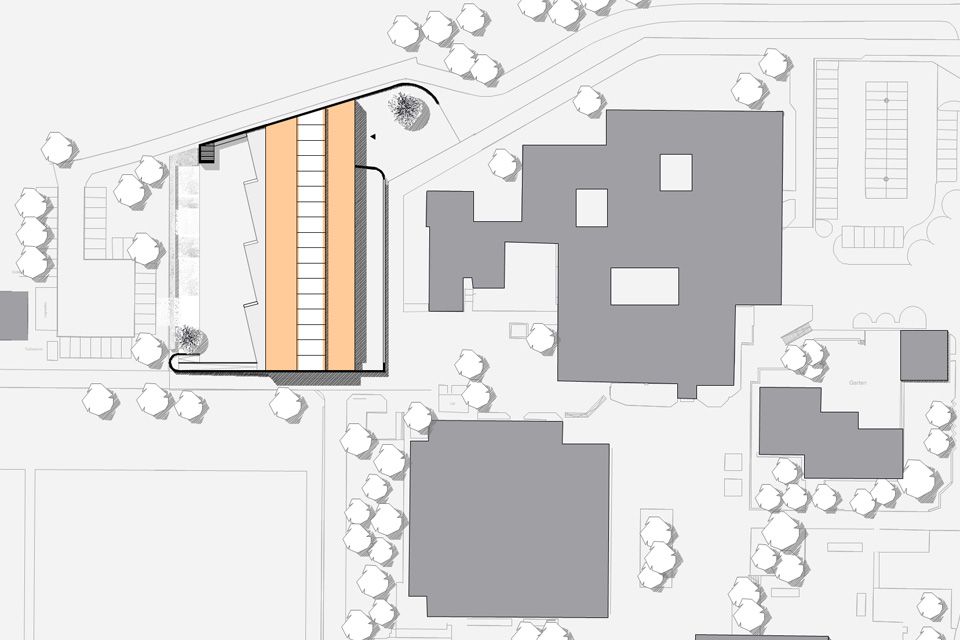 The school building divides the site into two different areas. On the east side, next to the forecourt, there is a garden protected by an enclosure, while the slightly larger schoolyard is located on the west side. A solid ramp also connects the classrooms on the upper floor directly to the schoolyard, giving it a sense of space and security.