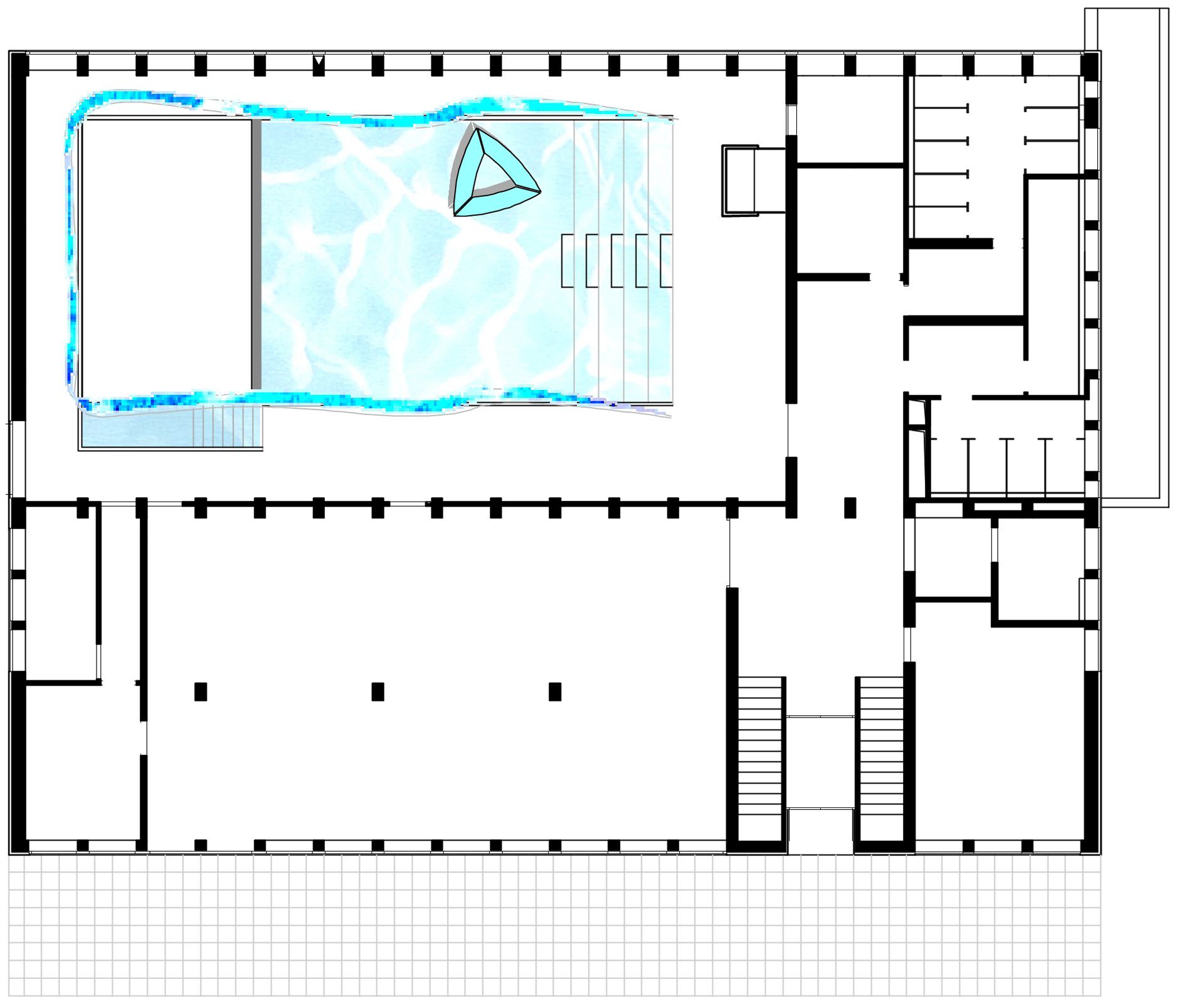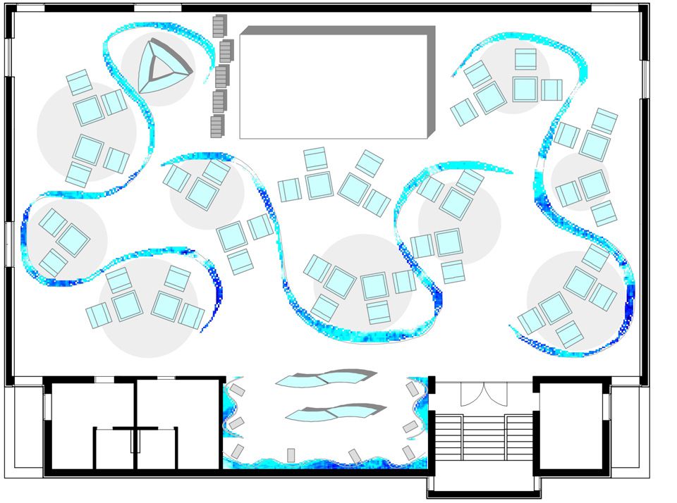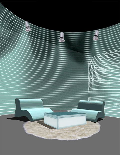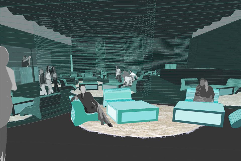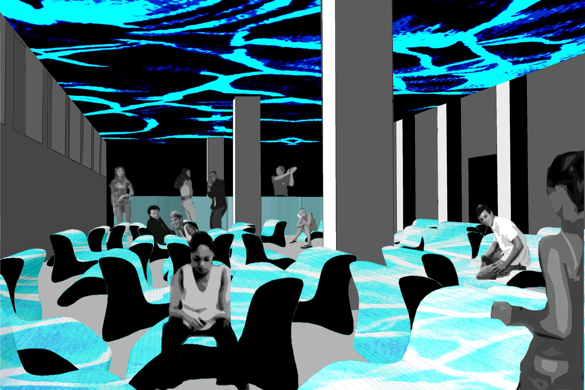 For the annual Poolbar Festival in Feldkirch/Austria, an existing swimming pool building from the 1960s is temporarily redesigned. The aim is to achieve maximum effect with a minimum budget. Our project interprets the theme of water in a figurative sense. A pulsating wave is projected onto the exposed concrete façade of the building using laser scanners. Flexible foam furniture and backlit mesh fabrics as room dividers create a unique space for a limited time.