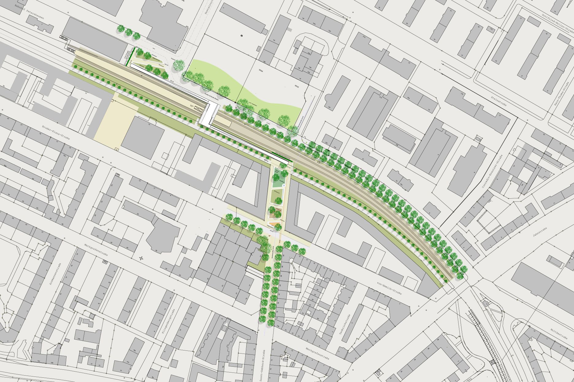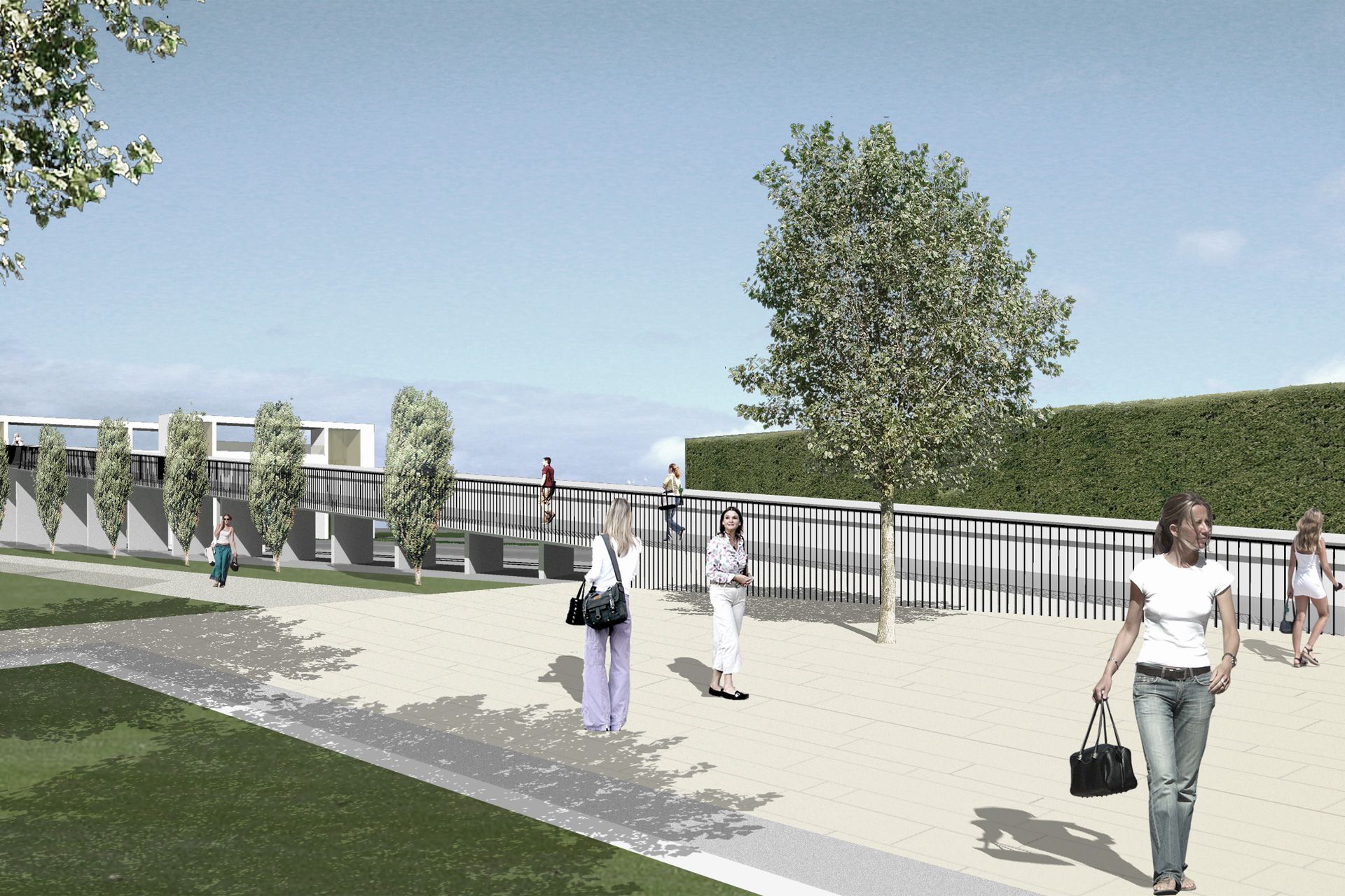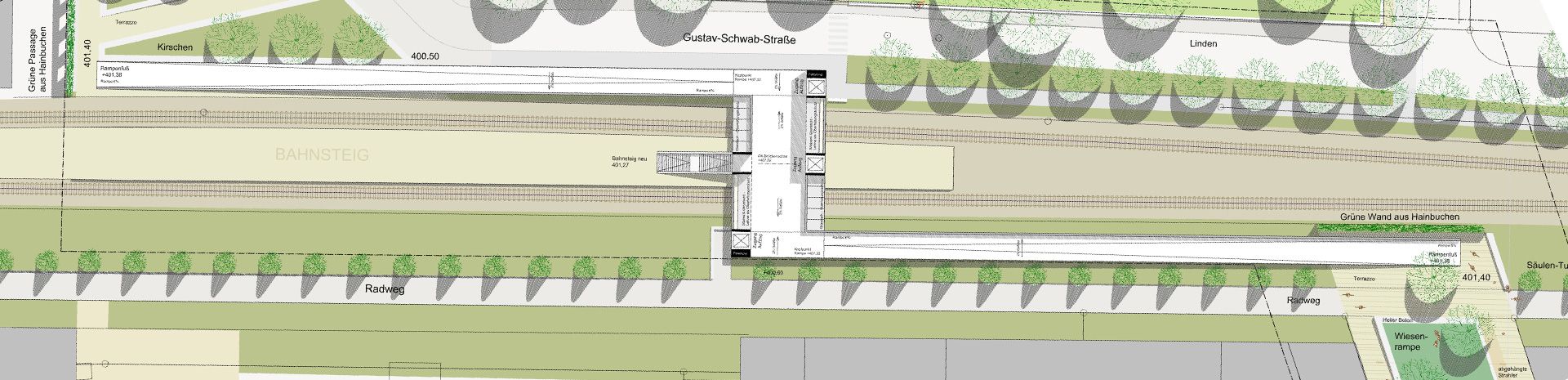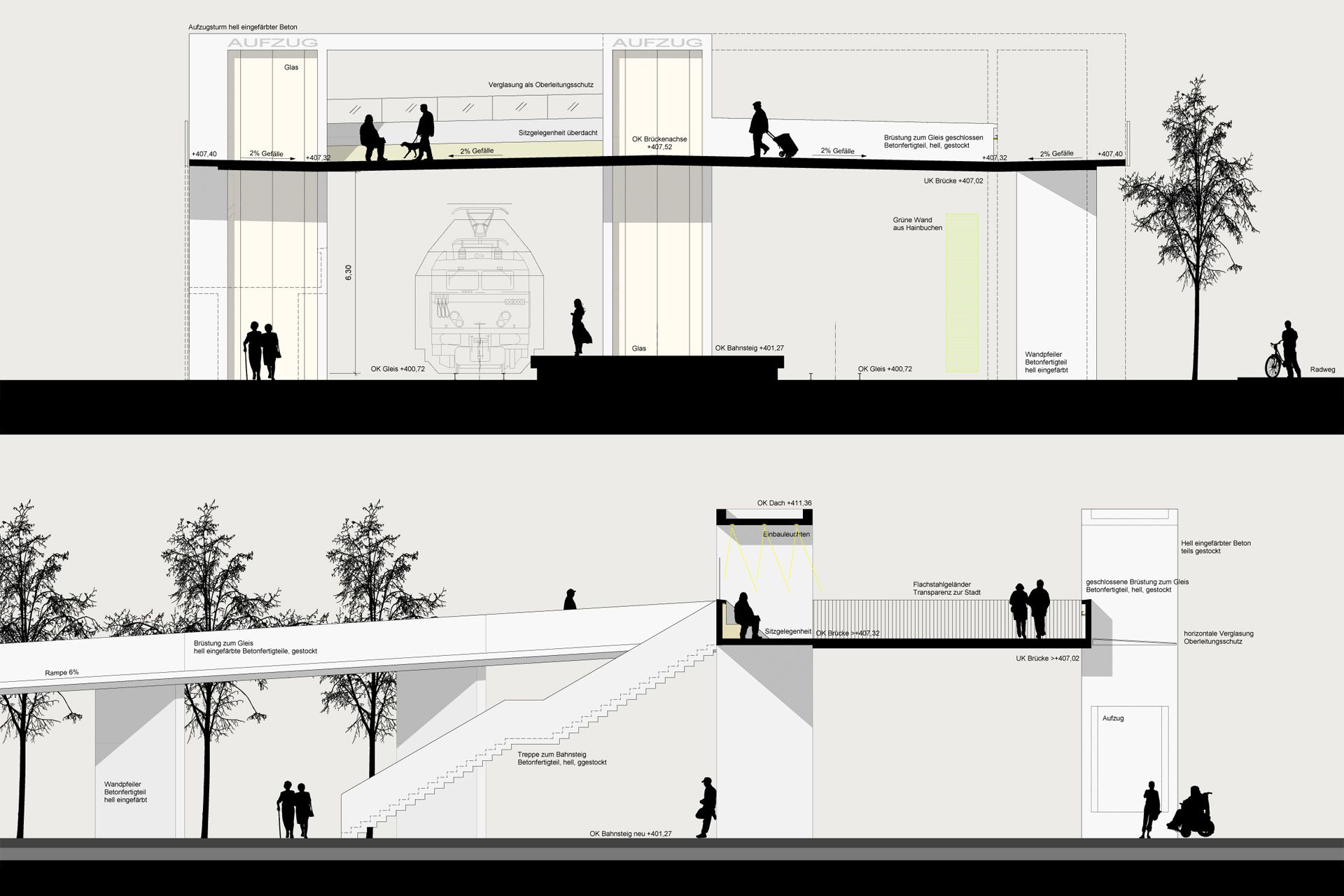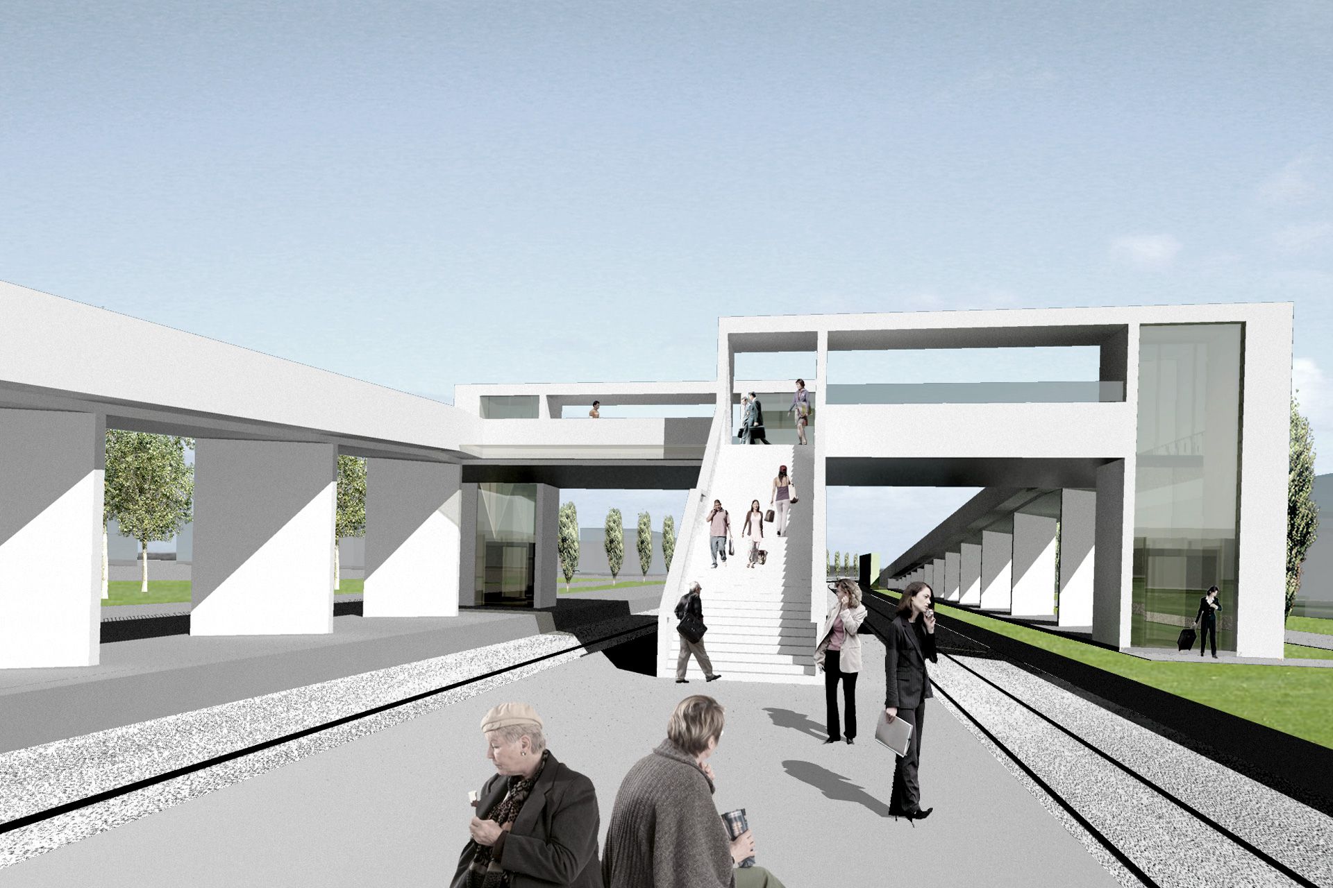 The very heterogeneous situation on both sides of Petershausen station is organized in terms of urban planning by a geometrically strict bridge structure, and attractive plazas are created at both bridgeheads. Two ramps arranged parallel to the tracks overcome the height for crossing the track system. These are connected by a widened bridge plateau, parts of which are covered and offer seating. Stairs and elevators link the plateau with the two adjacent districts and the platform. Diagonally positioned panes support the white concrete bridge, creating dynamic effects of transparency and unity through track-parallel perception.