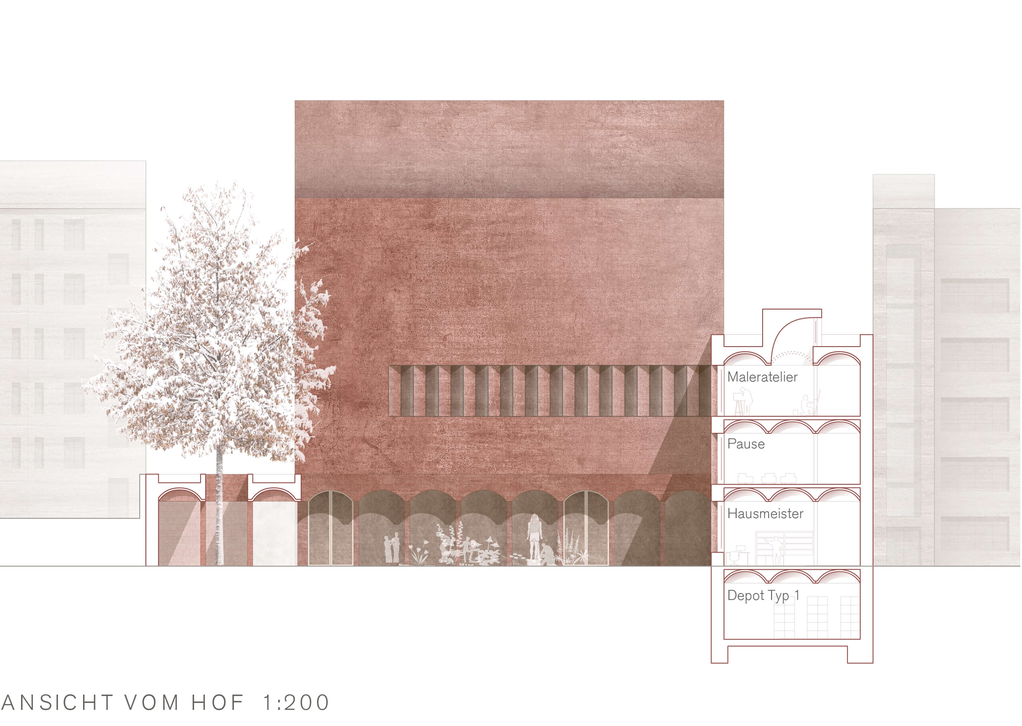 The historic existing building will remain the face and address of the Museum of Plaster Molding in the future. In the south wing, the store, exhibition and old forge areas, which are relevant to the public, will be made accessible. Here, the powerful architecture of the old building characterizes the space. Towards the front garden, higher-value uses such as offices and meeting rooms are arranged, while the north wing accommodates ancillary rooms and the packing plant and provides an interior transition to the new building. The upper floors of the existing building will house storage areas with lower climatic requirements. Interventions in the historic building are to be minimized so that the history of the site remains tangible for visitors.