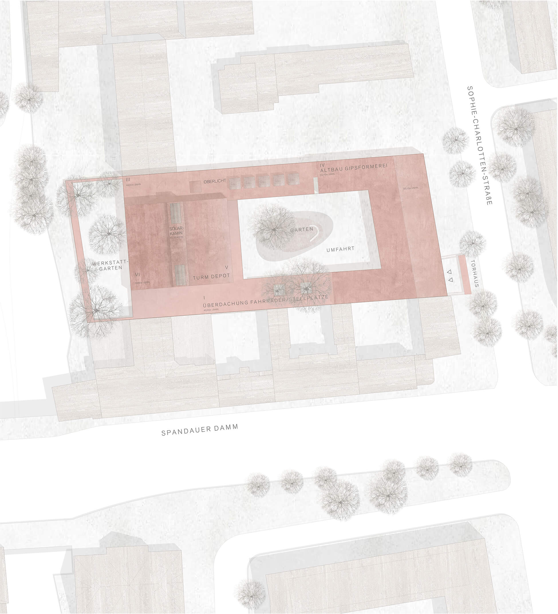 A free-standing gate building on Sophie-Charlottenstraße leads to a flatly sloped entrance forecourt and thus strengthens the currently little noticeable address of the Museum of Plaster Molding in the neighborhood. Further structural interventions on the listed old building façade are therefore unnecessary. Access to the historic gateway is via a narrow ramp that crosses the characteristic greened front garden of the building. This front garden will be reworked in accordance with the historic model.