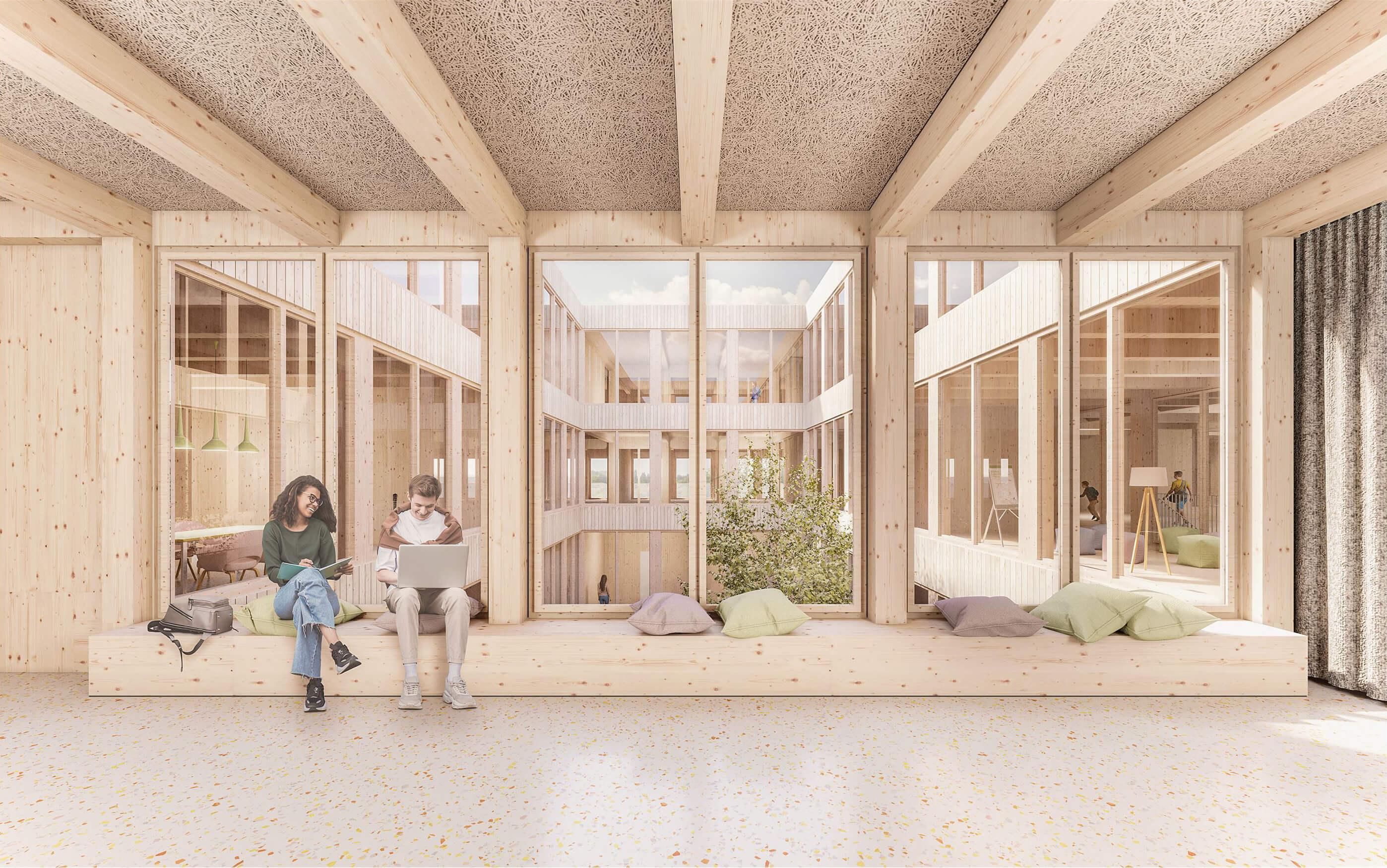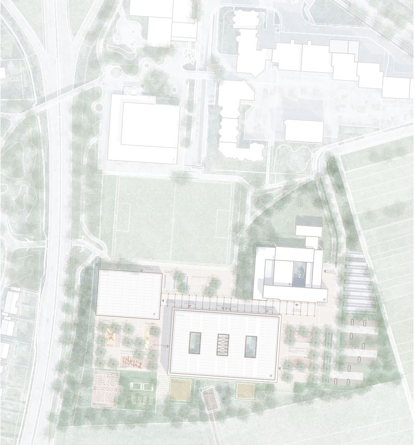 The existing school building will be extended by a three-story school building and the new gymnasium to form a clearly structured campus ensemble. The existing building will thus become an integral part of the future urban planning order. The three structures, which are offset against each other, are connected by an elongated pergola and yet the permeability from the address-forming north side to the adjacent landscape area to the south is preserved. The chosen arrangement results in three clearly dedicated and spatially defined open spaces. In the southwest the free play area for the elementary school, in the southeast the schoolyard of the community and secondary school and in the north a common address-forming forecourt, in which all three buildings participate. The existing path connections from the west, north and east are taken up and interwoven with the new situation.