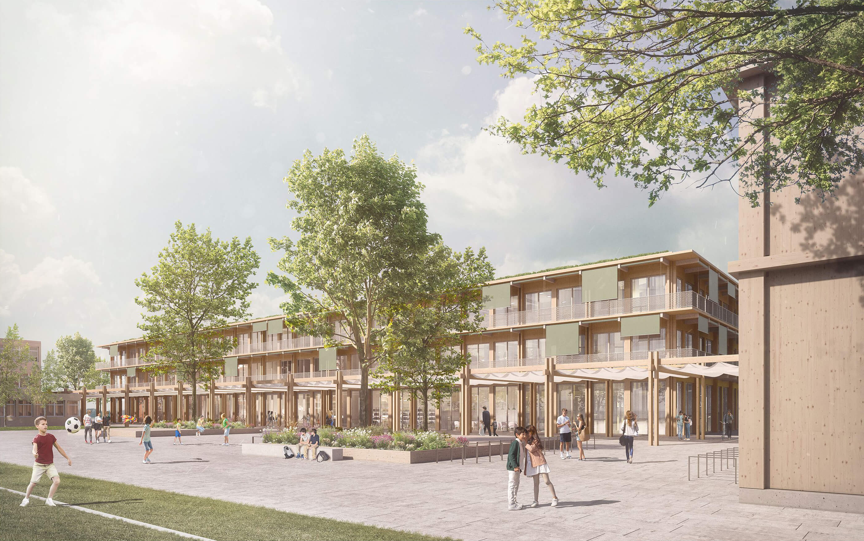 The existing school building will be extended by a three-story school building and the new gymnasium to form a clearly structured campus ensemble. The existing building will thus become an integral part of the future urban planning order. The three structures, which are offset against each other, are connected by an elongated pergola and yet the permeability from the address-forming north side to the adjacent landscape area to the south is preserved. The chosen arrangement results in three clearly dedicated and spatially defined open spaces. In the southwest the free play area for the elementary school, in the southeast the schoolyard of the community and secondary school and in the north a common address-forming forecourt, in which all three buildings participate. The existing path connections from the west, north and east are taken up and interwoven with the new situation.