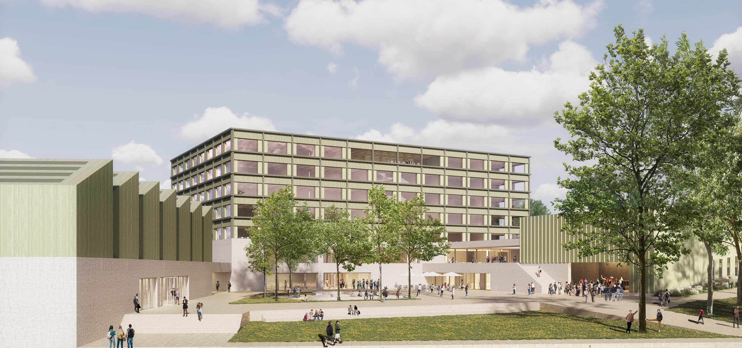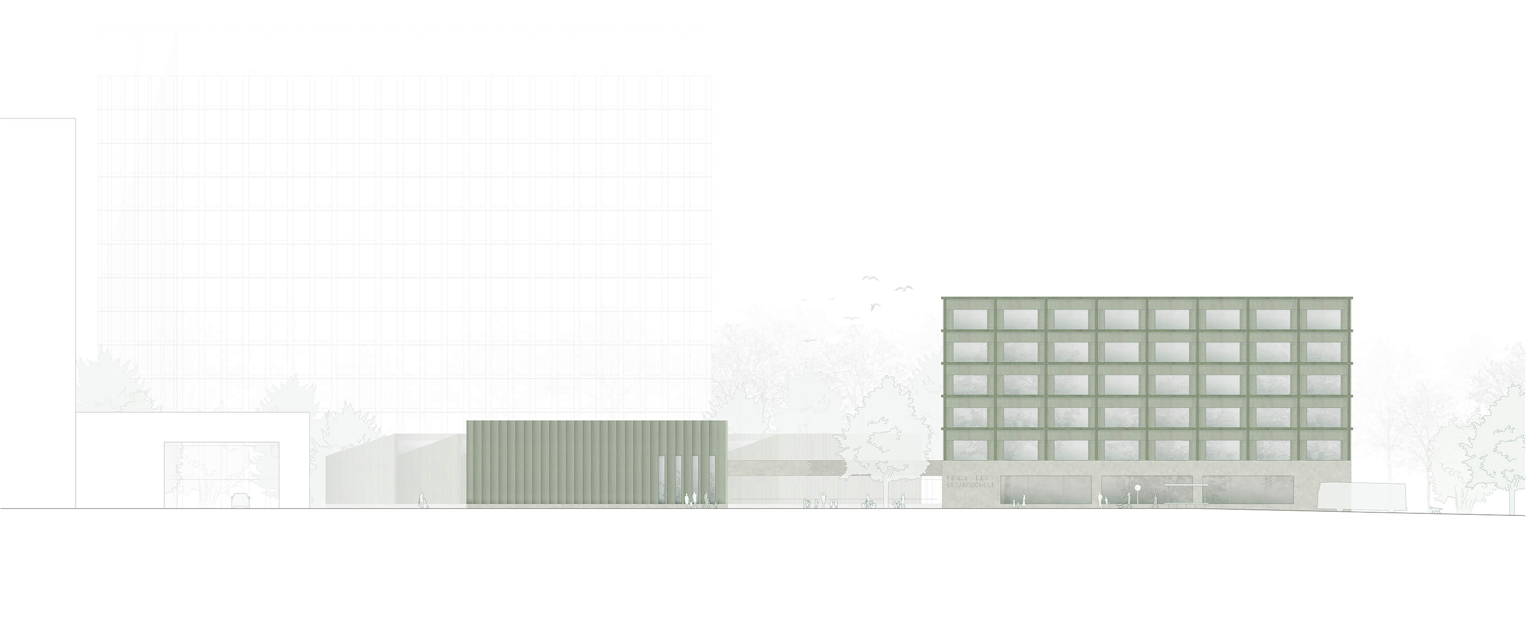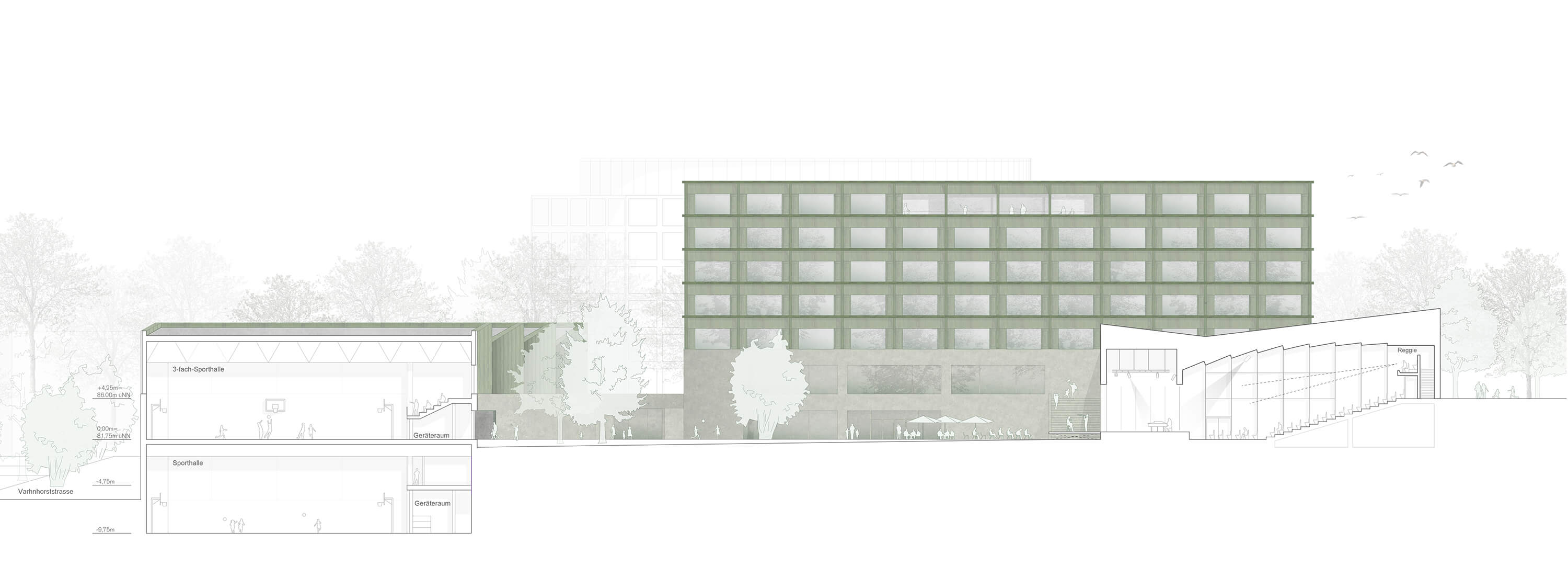 A composition of three wooden structures on a common and connecting exposed concrete base is placed on the site in such a way that, on the one hand, the block connection to Varnhorststraße, which is desirable for urban planning and noise protection reasons, is achieved and, on the other hand, the solitary character of a school building is preserved through the emphasis on the individual structures despite the "block edge" and the school thus remains perceptible as such in the urban space.
