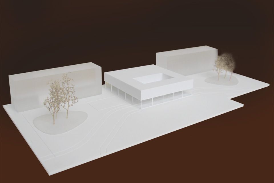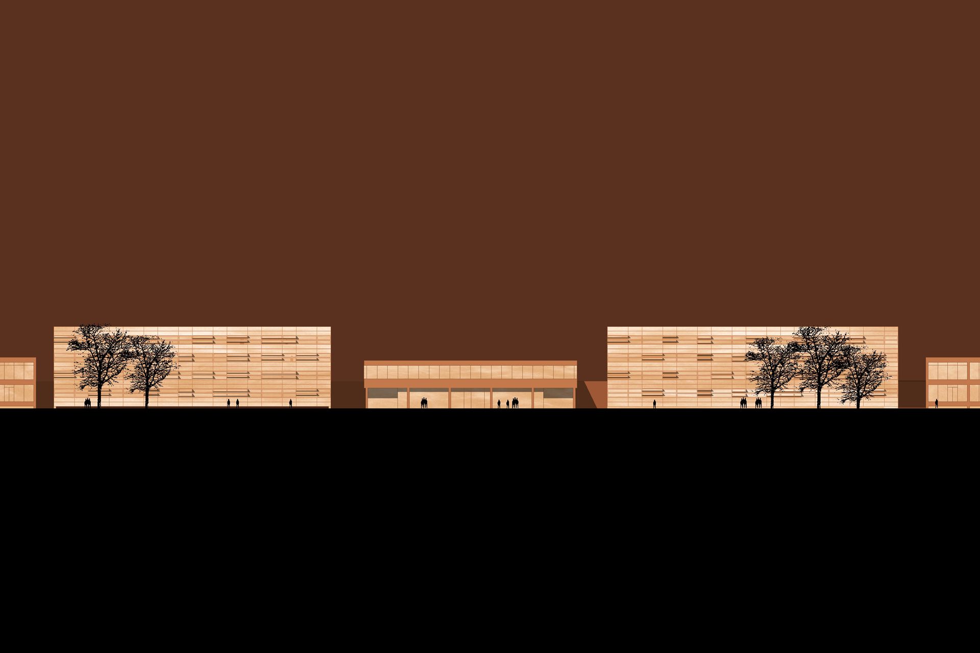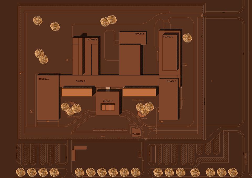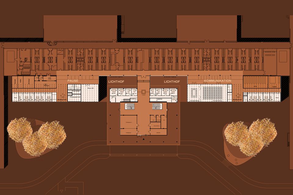 The almost symmetrical ensemble from the 1960s is supplemented by two four-storey administrative buildings, which are positioned on either side of the entrance building. The existing entrance situation will be retained and strengthened by minor interventions in the interior. The administrative buildings are accessed from the laboratory wings at the rear, which allows for short distances in the daily workflow. Higher-level meeting rooms are arranged on the first floor and provide attractive spatial expansions along the existing corridor. Black anodized aluminium panels with flush-mounted windows underline the urban restraint of the project.