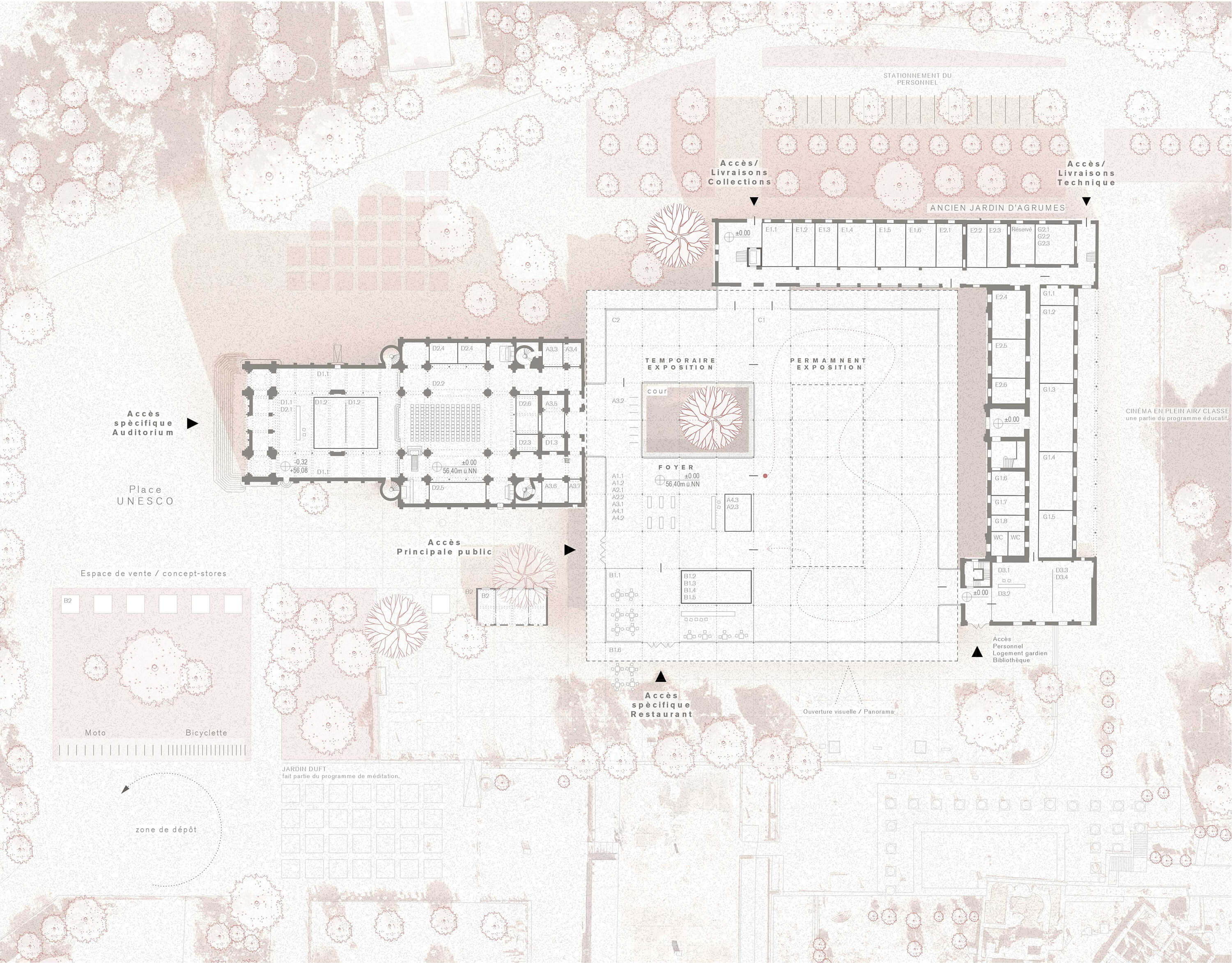 A key objective of the competition was to develop a concept for the upgrade and revitalization of the "Byrsa (Citadel) of Carthage" excavation and museum area. Located on the Gulf of Tunis, historic Carthage was founded at the end of the 9th century BCE. It covers an area of about 500 hectares and has been a UNESCO World Heritage Site since 1979. In our design, an existing courtyard located between a Catholic cathedral built on the citadel in the 19th century and a seminary built in the same period is proposed as the most suitable location for the new section of the National Museum of Carthage. The new museum will then stand at the center of the approximately 5 hectare site of the historic acropolis of Byrsa and will offer immediate access to all the main archaeological areas. In keeping with an approach that is appropriate to the historical-archaeological significance of the site and at the same time ecologically sensitive, new construction measures are kept to a minimum: Rather than creating a new building on top of the courtyard, a light and transparent umbrella-like structure covers the space, opening up to a view across the excavations to the Mediterranean Sea. With its gridded and modular order, the new structure fits with both confidence and restraint into the context of the neighboring buildings. Contact with and interventions into the ground are reduced to the unavoidable, reflecting the high archaeological significance of the site.