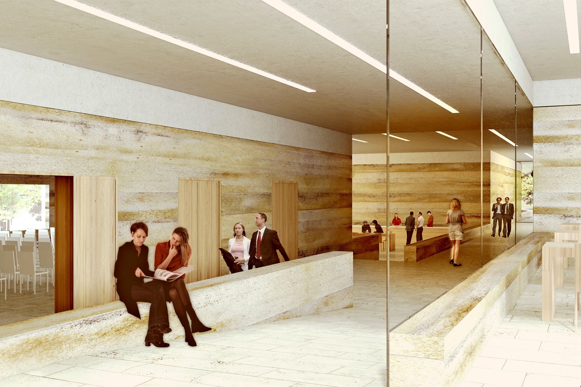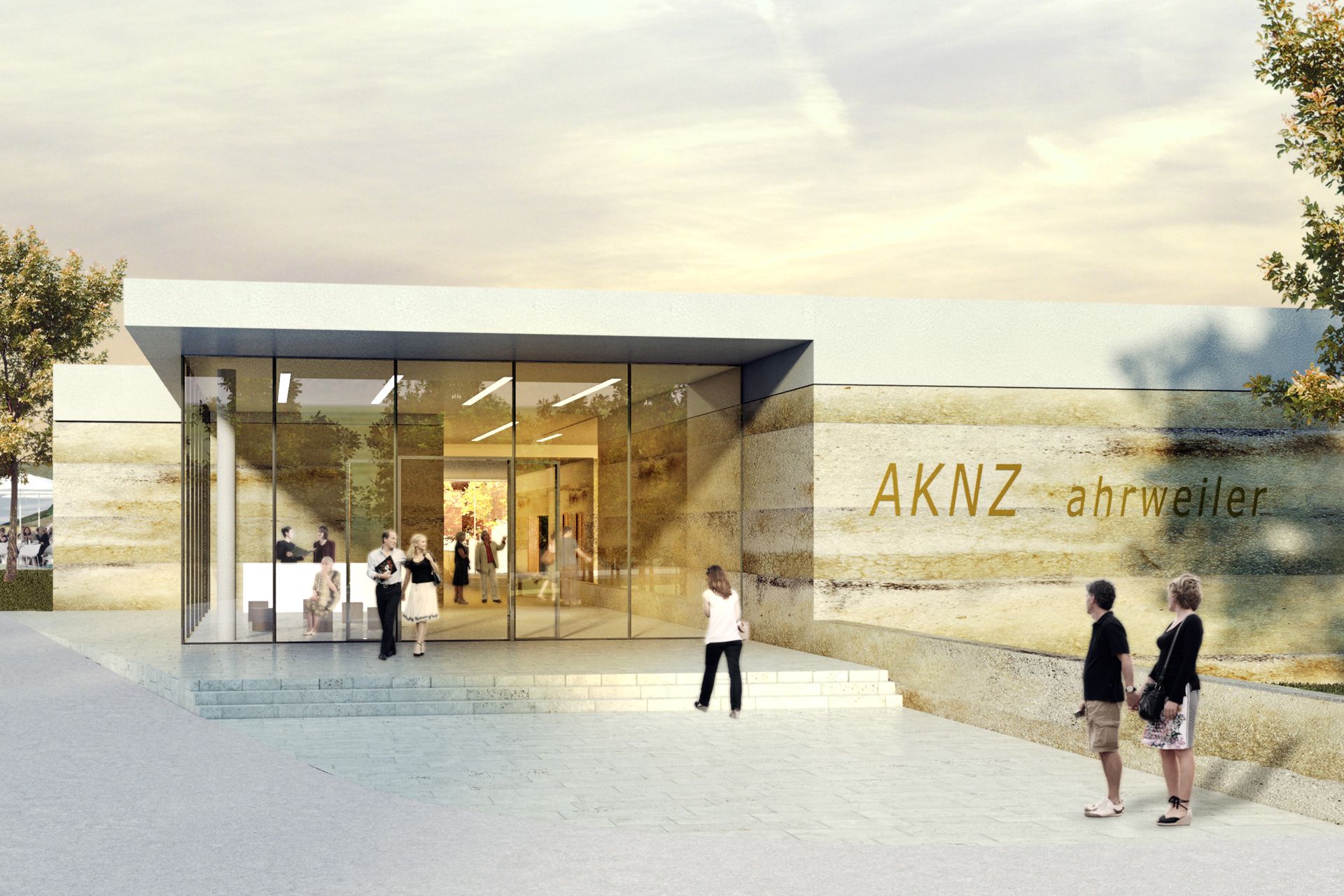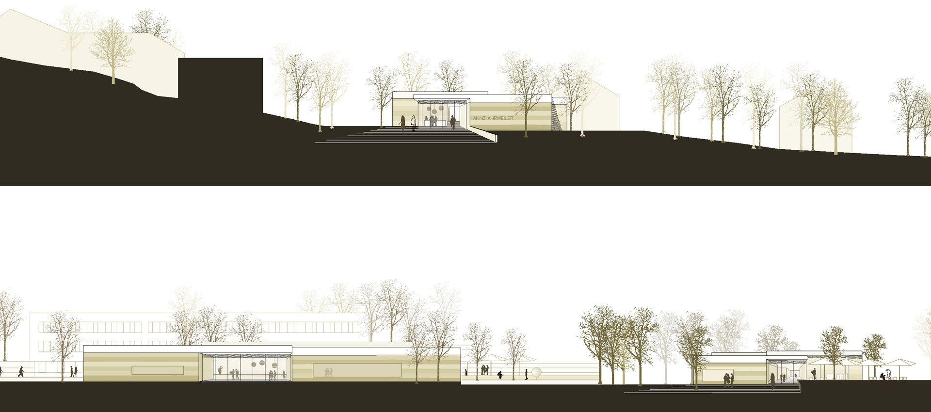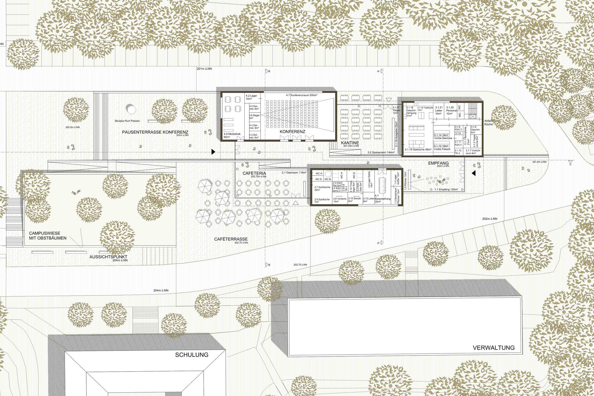 The AKNZ campus is characterized by its unique location within the green and wooded areas of the hilly landscape of the Ahr valley. The strong topography, as well as the terracing and cultivation of this landscape by its inhabitants, which is typical of the Ahr valley, is the starting point for the project. The rising plot is terraced and thus made usable by the arrangement of retaining walls and 3 cubes. The terracing makes it easy to connect the house to the surrounding elevation and naturally formulates an internal structure for the functions of the house. The staggered height of the roof follows the same theme, giving the house a pleasant sense of scale and making it easier to fit into the acute-angled plot. Roof overhangs create sheltered outdoor areas for the dining hall, cafeteria and reception and emphasize the entrance to the building as the new face of the AKNZ.