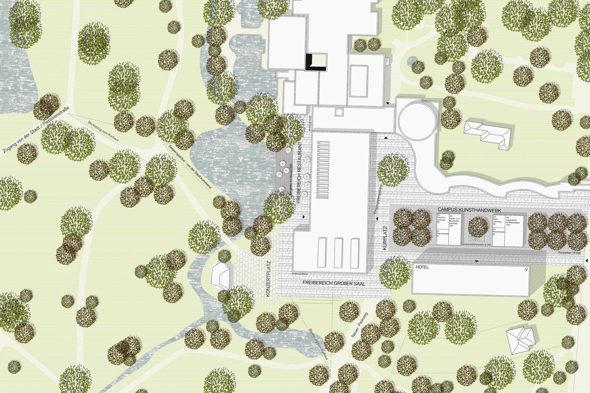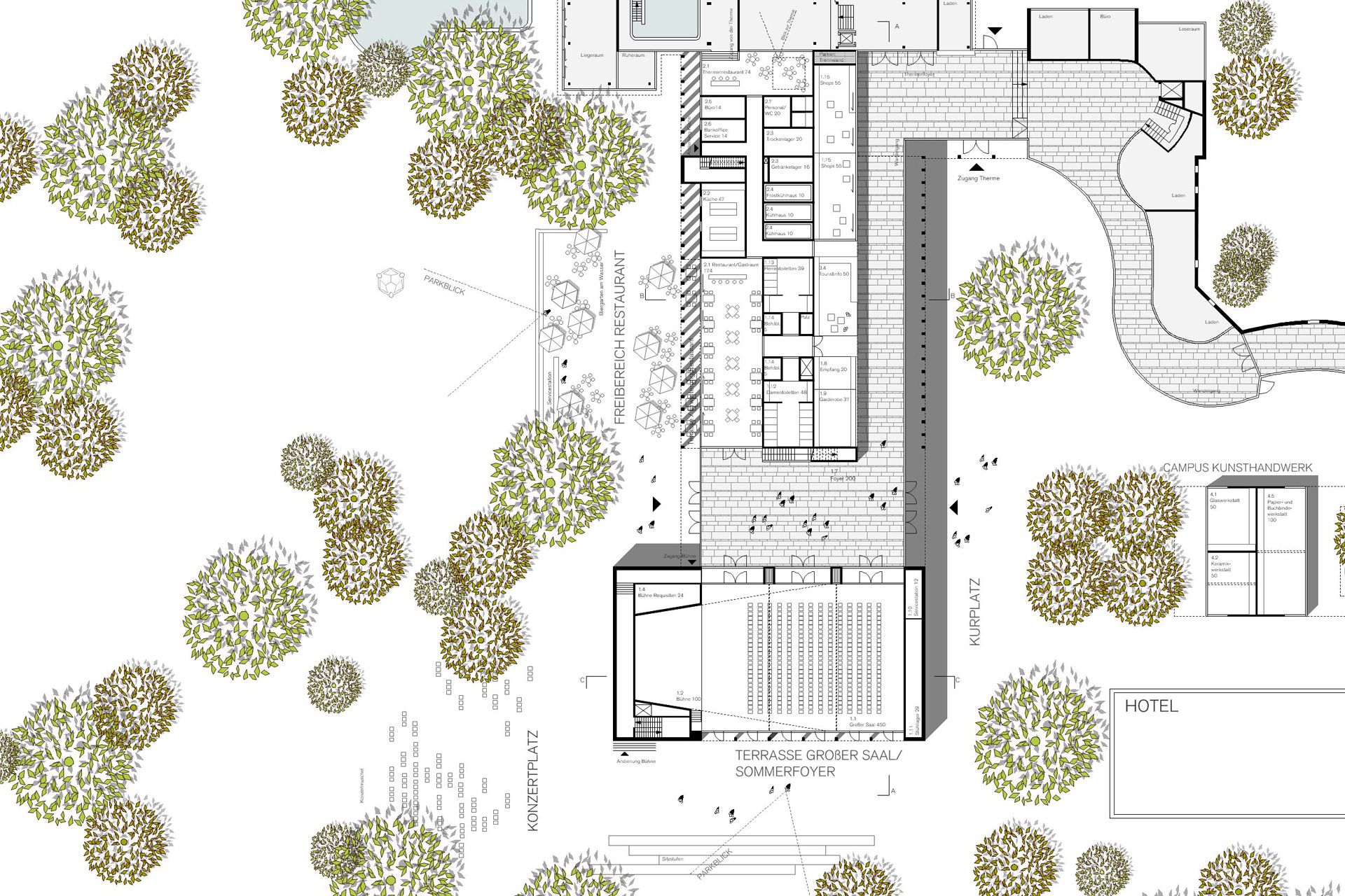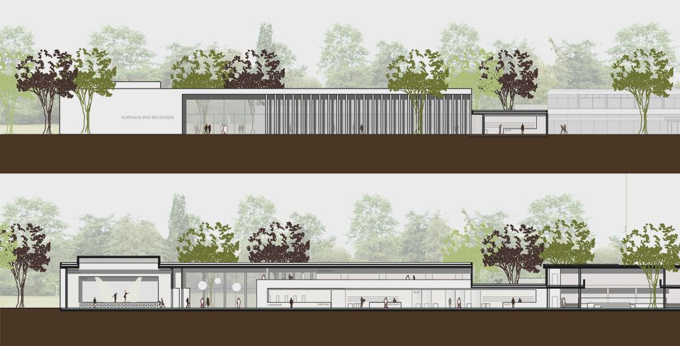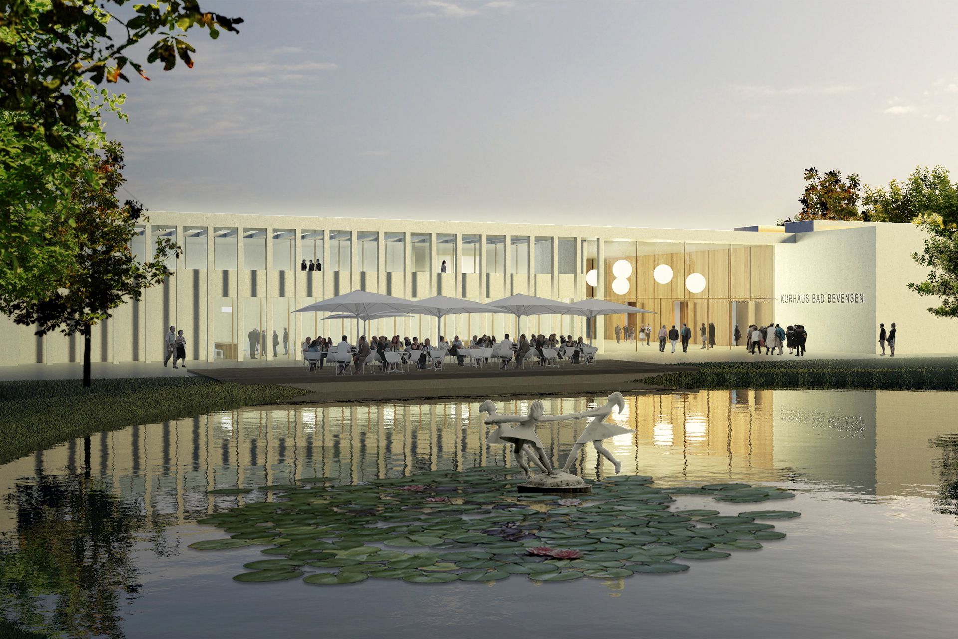 The aim of the project is to find the right balance between the careful further development of the existing building in Bad Bevensen's spa gardens and the desired formal independence of the new Kursaal. The angular structure adjoins the existing spa on one storey and defines clearly assigned outdoor spaces through its cubature. Together with the hotel and promenade, the Kurhaus encloses the new spa square on its eastern side. To the west, the large hall, which is turned at a right angle, creates a sheltered open space by the water, from which the restaurant in particular benefits. A screen of slender white concrete columns supports the roof of the building. Its subtle rhythm creates an attractive multi-layered façade and also creates versatile covered forecourts for the foyer and restaurant.