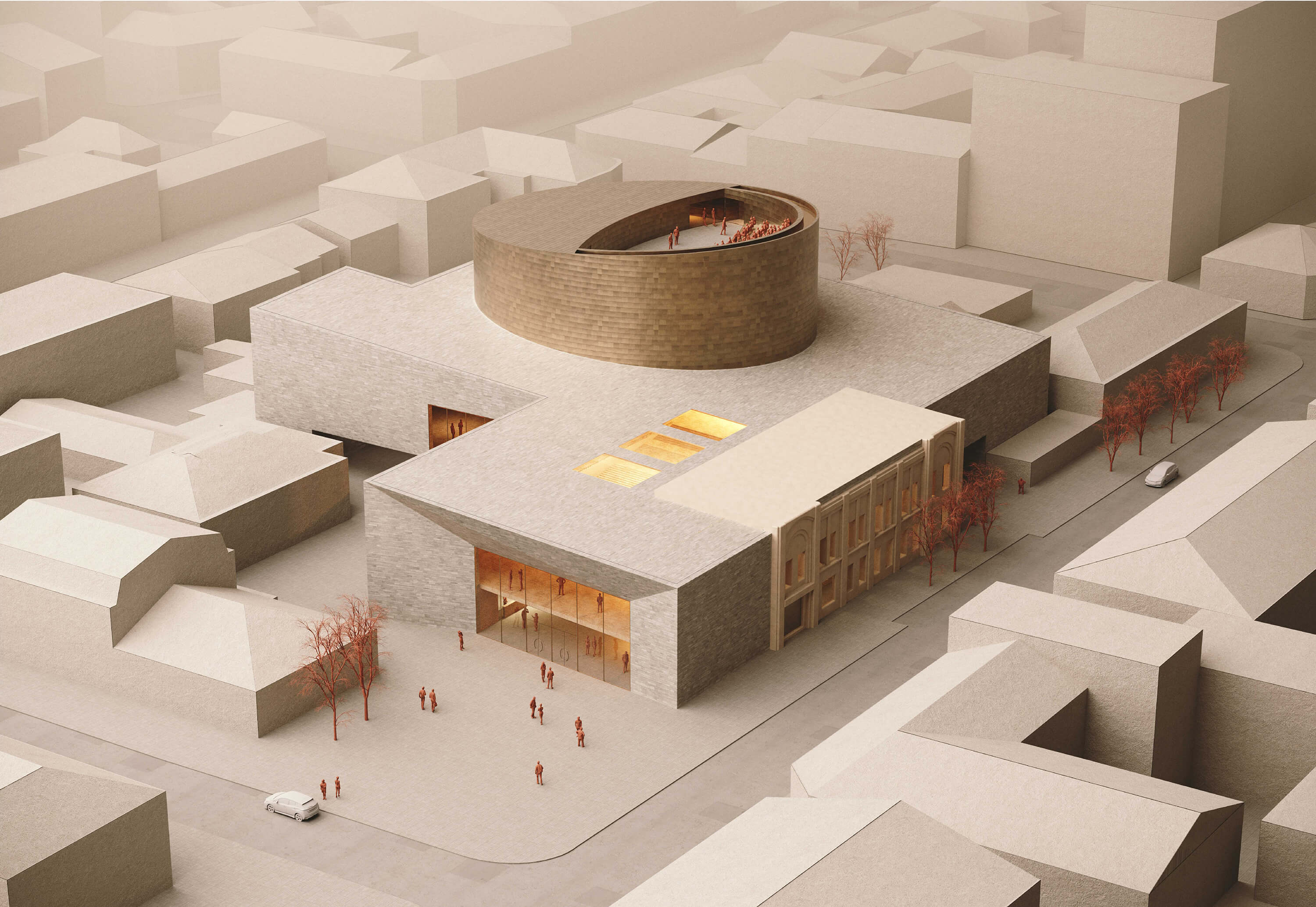 A flat, sloped roof structure ties into the existing figure-ground scheme and completes the broken urban geometries. From this compositional background emerge two precisely cut volumes, one a cuboid derived from the salvaged historic façade of the former circus, the second an extruded ellipse that encloses the Major Hall. These become the governing elements of the overall sculpture. The Philharmonic Plaza with the Carl-Schmidt-Monument remains intact and in function. Oriented toward this plaza, the portal-like entrance façade provides an inviting gesture towards city as well as a look-in / look-out motif for visitors. Further elaborating on the notion of “inside-outside”, the lobby is treated as an in between of two buildings: “Major Hall” and “Circus - Minor Hall”. Local stone clads the façade and establishes a dignified distinction to the historic plaster facade of the circus building.