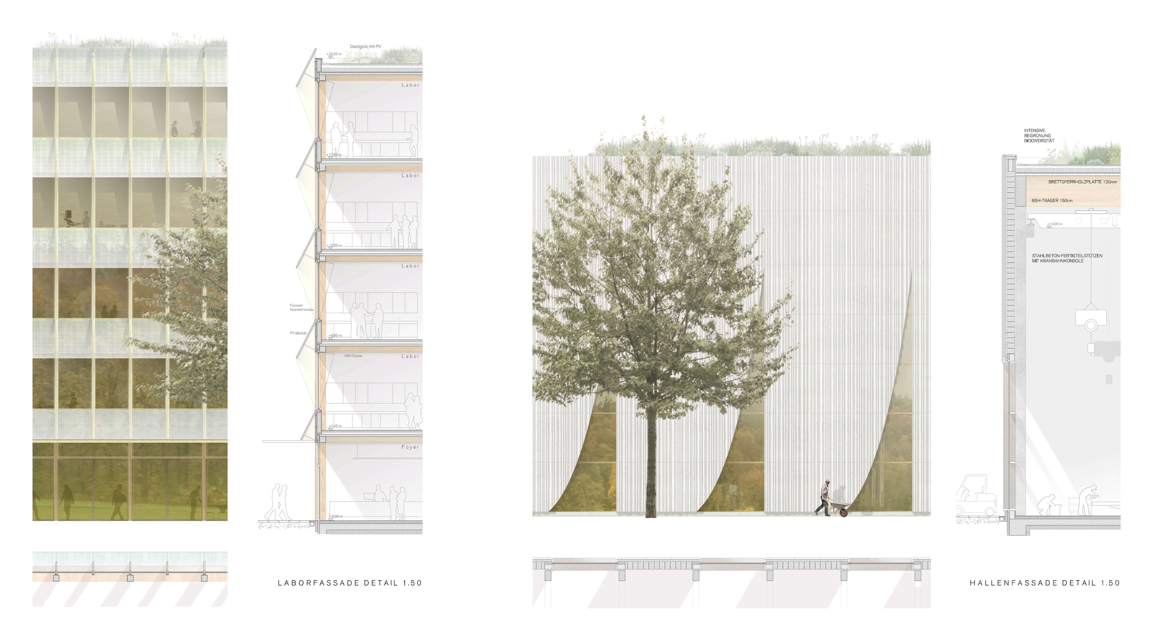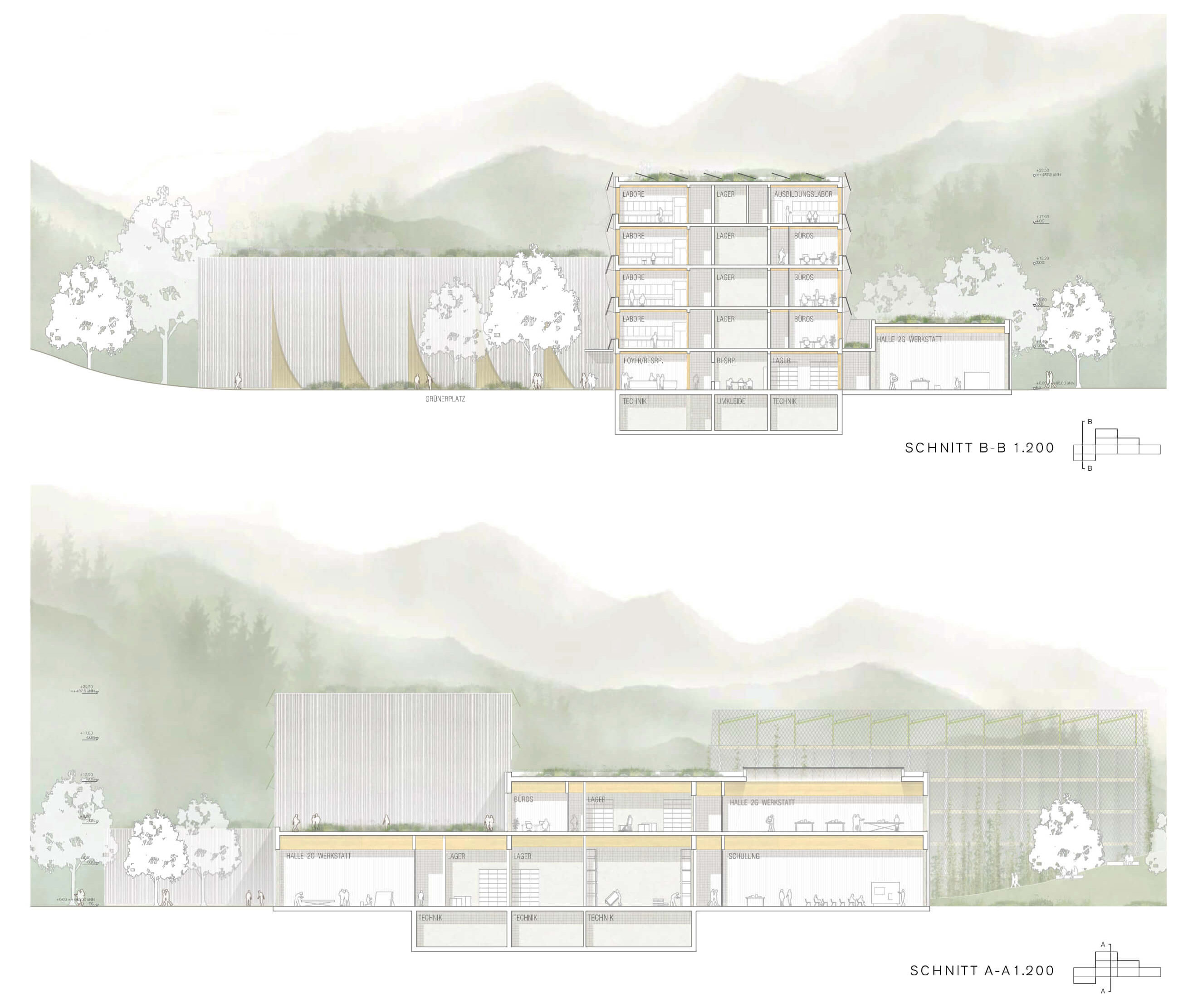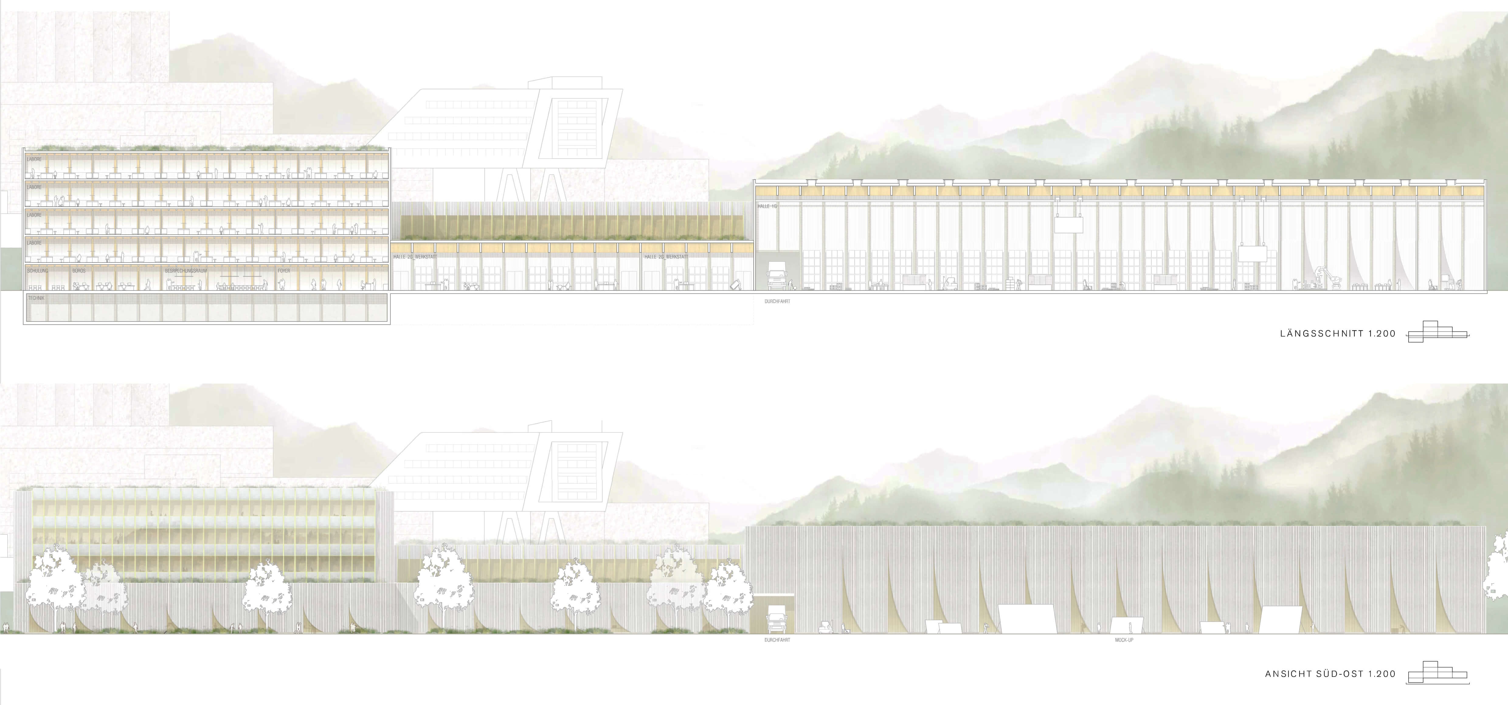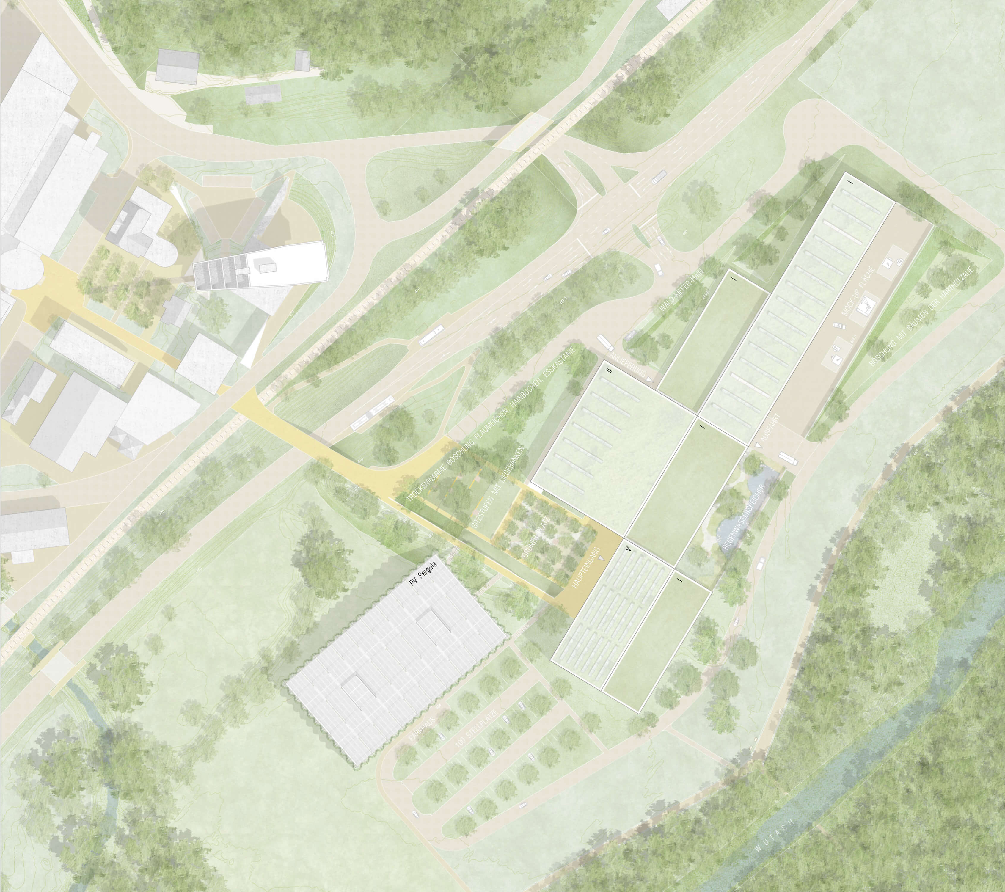 The three volumes, staggered in plan and elevation, face the main road with their striking front side. The staggered floor plan mediates between the different directions of the main road and the urban axis system. The result is a concise composition of cubes, which is pushed into the field of vision of passing cars and thus contributes to an effective corporate identity of the Sto site. The extensive spatial program of the Innovation Campus is divided into eight rectangular modules arranged on an imaginary grid. Despite the large building mass, the staggered heights of the individual modules result in a structured volume that blends in harmoniously with the scale of the site. The intensive greening of the roof surfaces and the green façade of the parking garage contribute to a good integration into the landscape of the Wutach Valley, which is also visible from the adjacent hills.