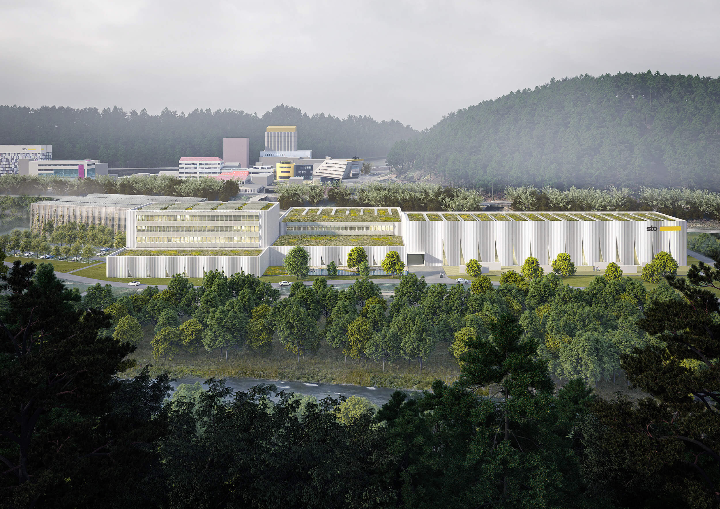 The three volumes, staggered in plan and elevation, face the main road with their striking front side. The staggered floor plan mediates between the different directions of the main road and the urban axis system. The result is a concise composition of cubes, which is pushed into the field of vision of passing cars and thus contributes to an effective corporate identity of the Sto site. The extensive spatial program of the Innovation Campus is divided into eight rectangular modules arranged on an imaginary grid. Despite the large building mass, the staggered heights of the individual modules result in a structured volume that blends in harmoniously with the scale of the site. The intensive greening of the roof surfaces and the green façade of the parking garage contribute to a good integration into the landscape of the Wutach Valley, which is also visible from the adjacent hills.