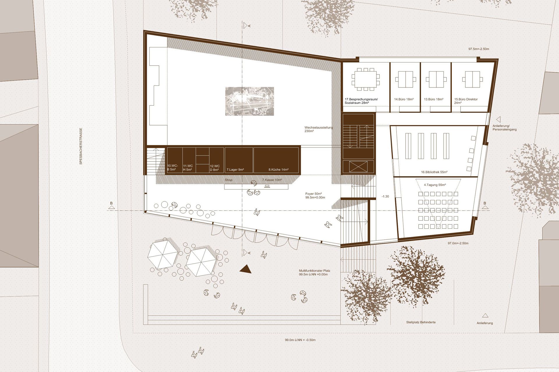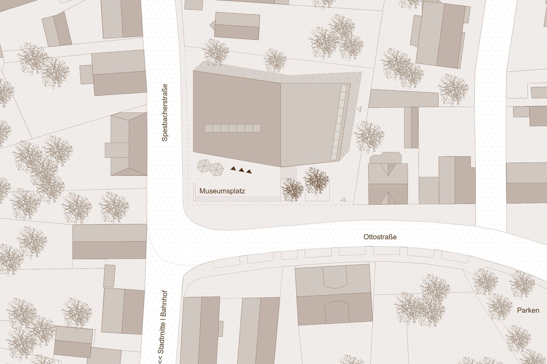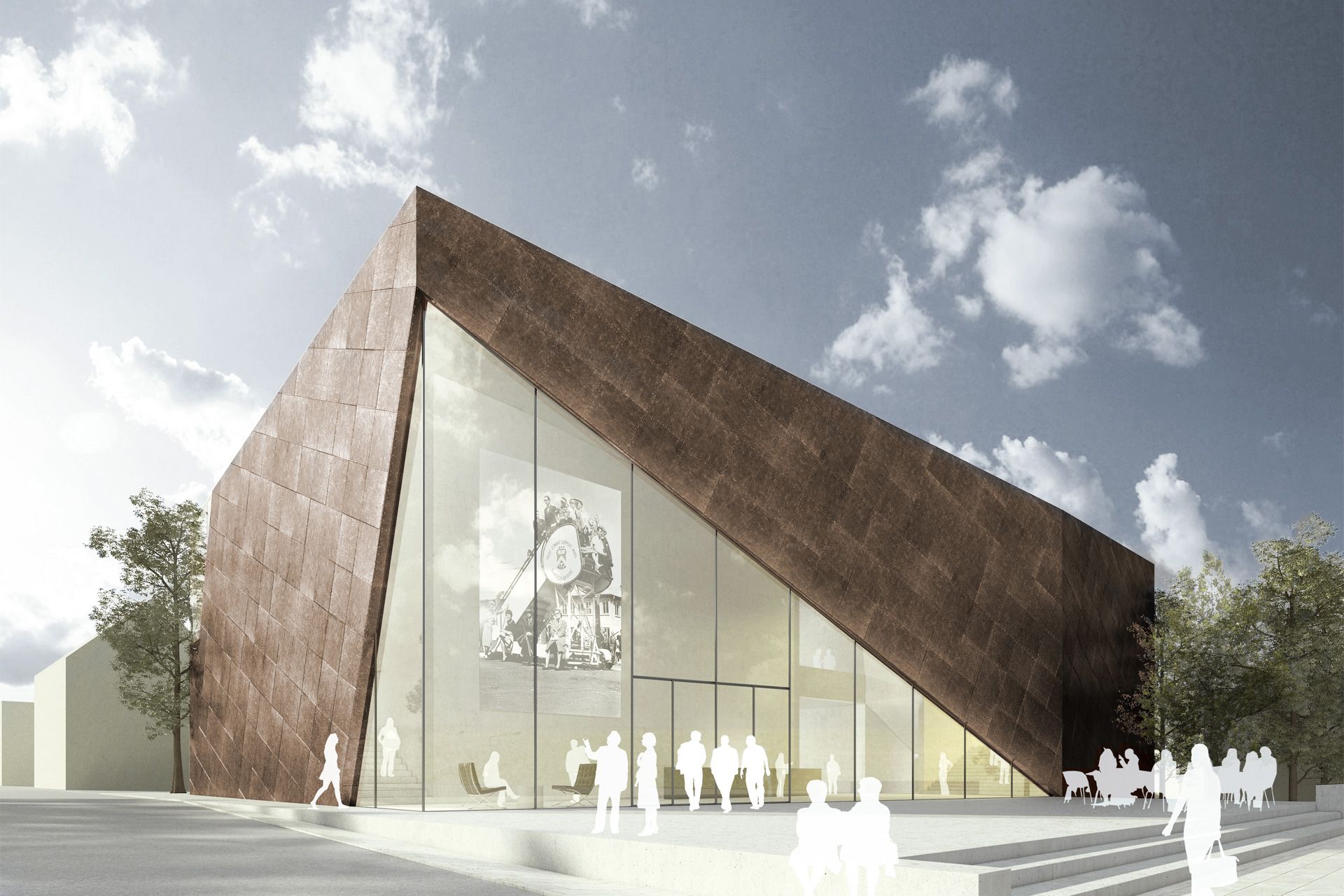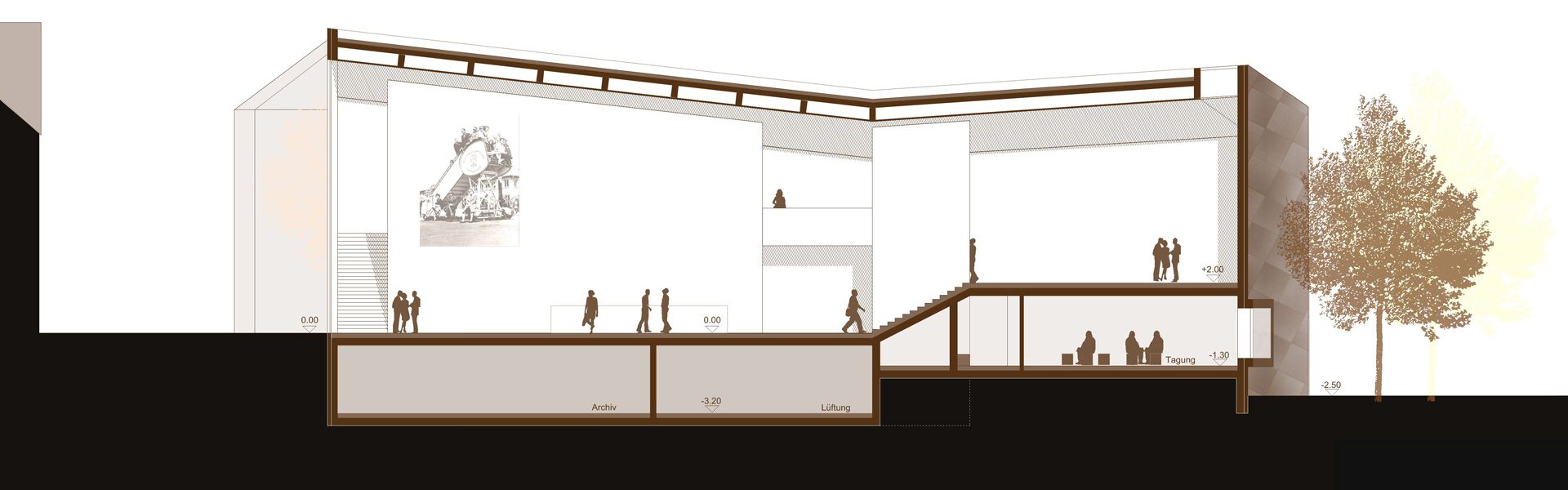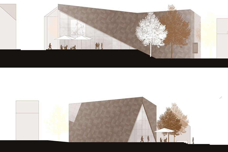 In many respects, the task of designing a documentation and exhibition center on the history of Americans in Rhineland-Palatinate requires the development of a prototypical building for which there are no structural references. It would be wrong to regard the building as a classic museum that presents valuable exhibits in as neutral a shell and sacred form as possible. Nor are the numerous documentation centers, which strive to come to terms with Germany's past with a serious attitude, any good as a reference. We set out to find a new, lively type of building that could meet the requirements of the building task. Our aim was to provide a flexible setting for the very diverse exhibits and at the same time to give the building an unmistakable appearance, both inside and out, that would stick in visitors' memories. We were not looking for a neutral shell, but a place whose independent character would emerge directly from the building task.