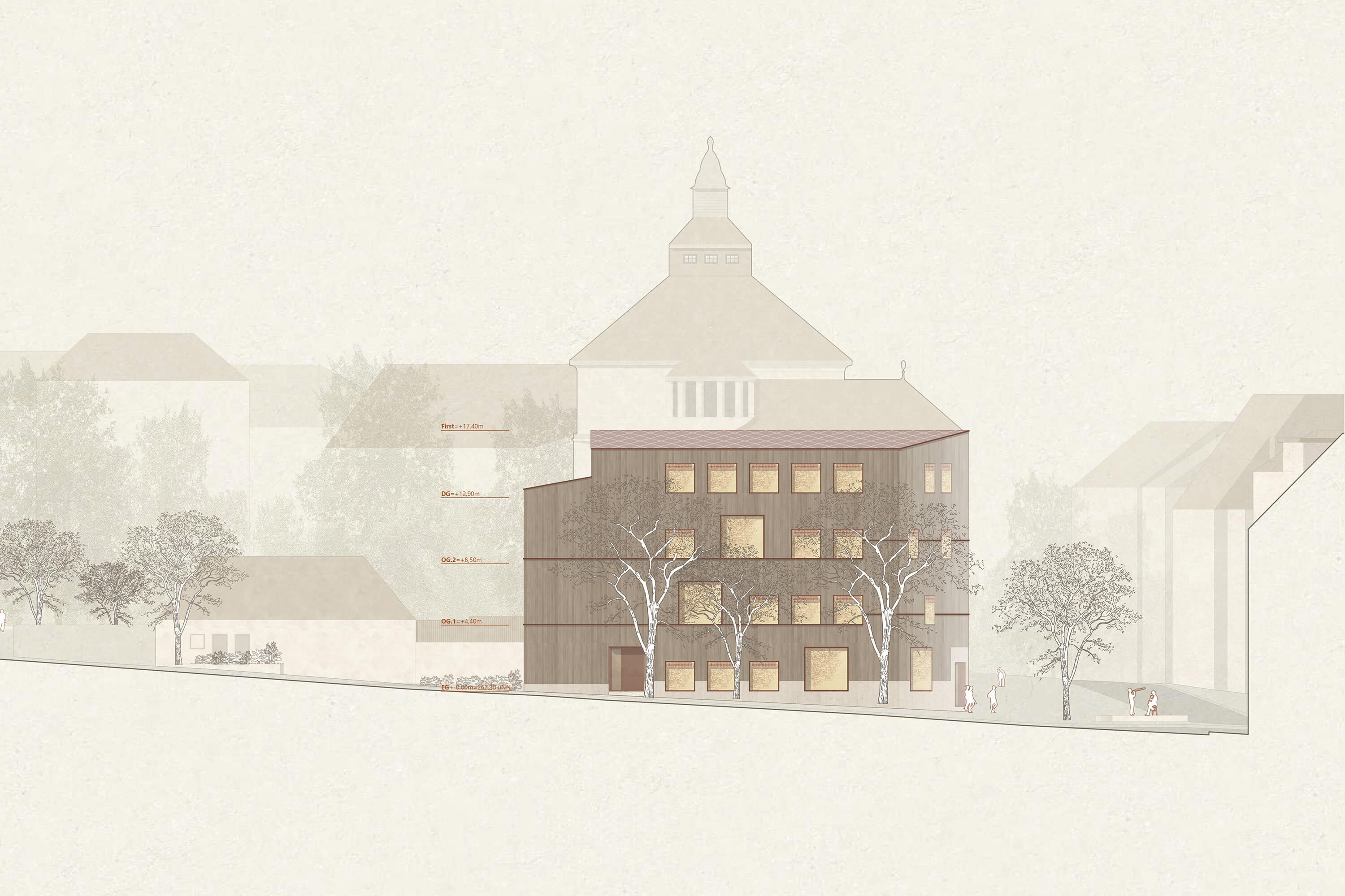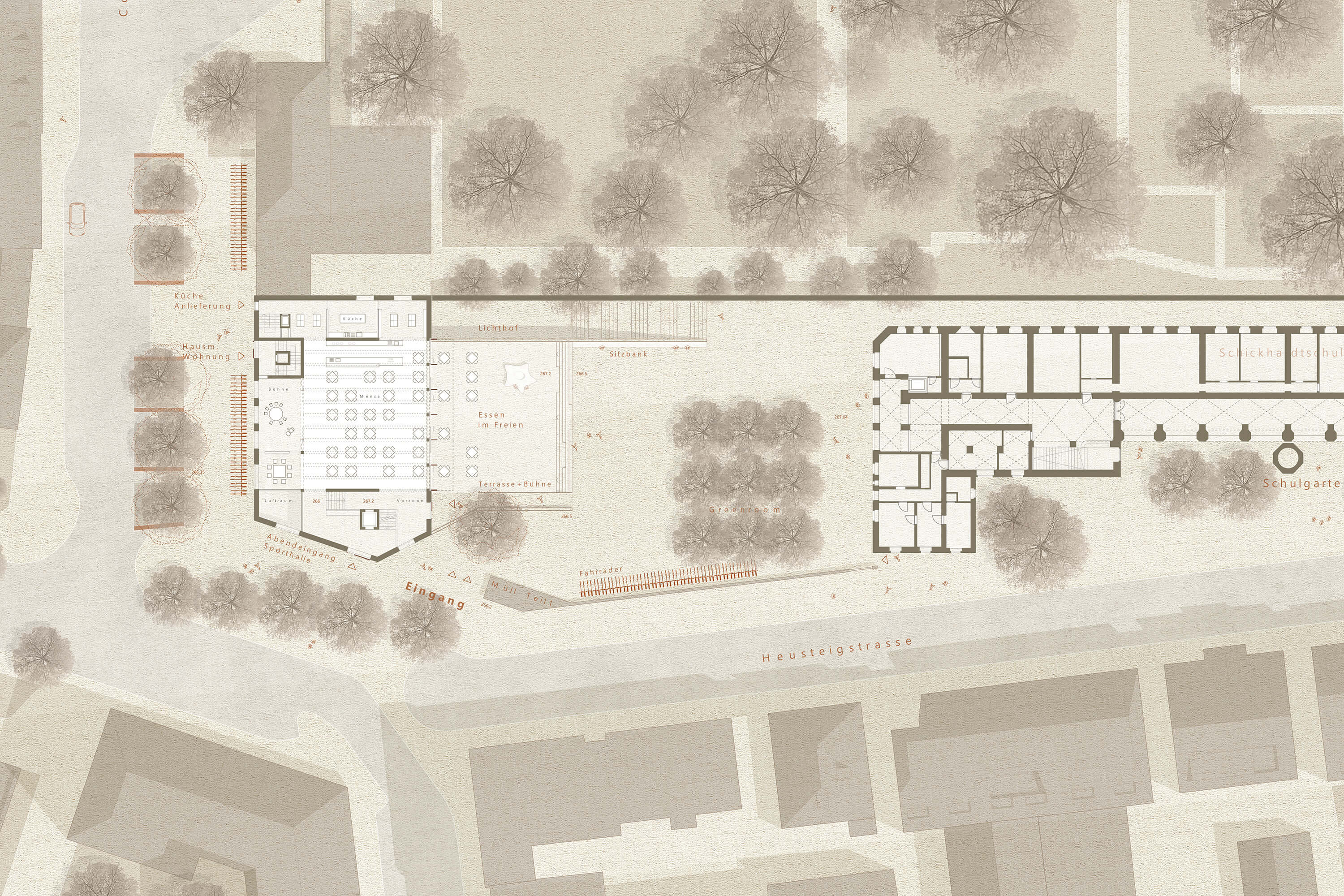 The new building occupies the corner of the inner-city block at the intersection of Cottastraße and Heusteigstraße as a striking polygonal structure. In addition to the volumetric completion of the city block, it will become a defining public building on a lively square in Stuttgart's Heusteig district that can be used in a variety of ways. Last but not least, the building, together with the listed Theodor Fischer building, creates a clearly contoured schoolyard that can also be used as an extension of the adjacent public urban space. By upgrading the design of the surrounding streets, which will be traffic-calmed in future, it will be possible to create a generous network of street space and schoolyard. A great benefit for the residents of the neighborhood.