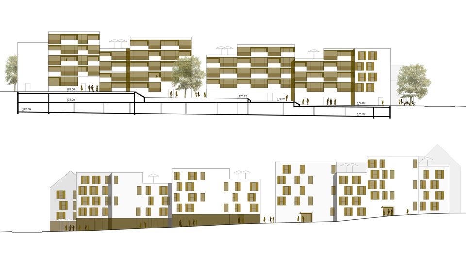 The area surrounding the residential complex on Goethestrasse is characterized by a relatively small-scale and staggered perimeter block development. This initially appears to be in contrast to the large scale of the planning task at hand, but forms the design starting point for this project. The volumes of the new building tie in with the existing scale and are plastically structured in plan and elevation. The projections and recesses along Goethestrasse and the staggered heights of the buildings ensure that they blend in well with their surroundings, while the closure of the block edge leads to the desired urbanization of the district. In addition, the volumetric staggering allows a flexible approach to the topographical situation. A key design feature is the remaining gaps between the three buildings. Despite the volumetric closure of the block edge, they allow pedestrians to cross the block along a quiet and leafy terrace path.