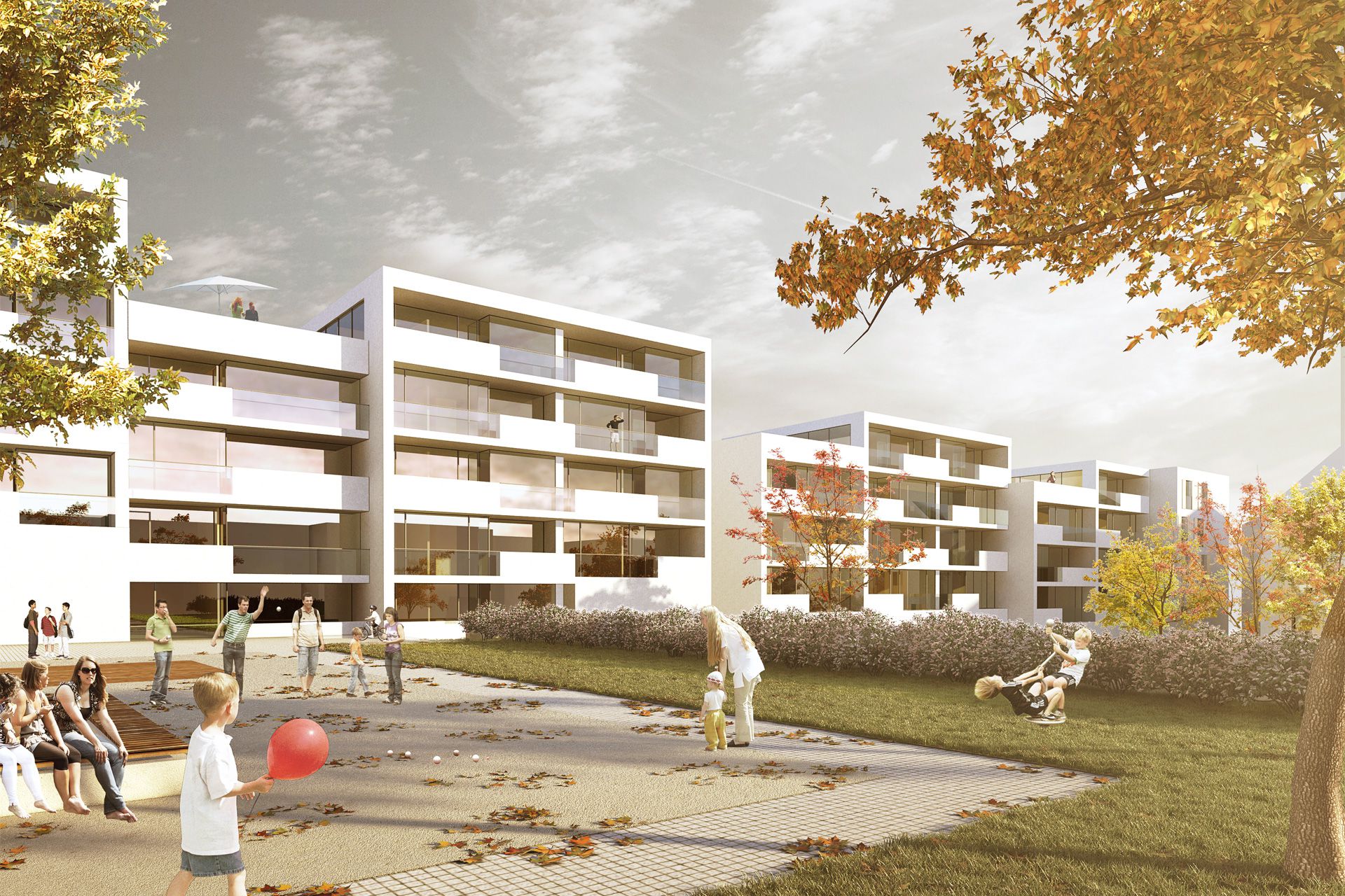 The area surrounding the residential complex on Goethestrasse is characterized by a relatively small-scale and staggered perimeter block development. This initially appears to be in contrast to the large scale of the planning task at hand, but forms the design starting point for this project. The volumes of the new building tie in with the existing scale and are plastically structured in plan and elevation. The projections and recesses along Goethestrasse and the staggered heights of the buildings ensure that they blend in well with their surroundings, while the closure of the block edge leads to the desired urbanization of the district. In addition, the volumetric staggering allows a flexible approach to the topographical situation. A key design feature is the remaining gaps between the three buildings. Despite the volumetric closure of the block edge, they allow pedestrians to cross the block along a quiet and leafy terrace path.