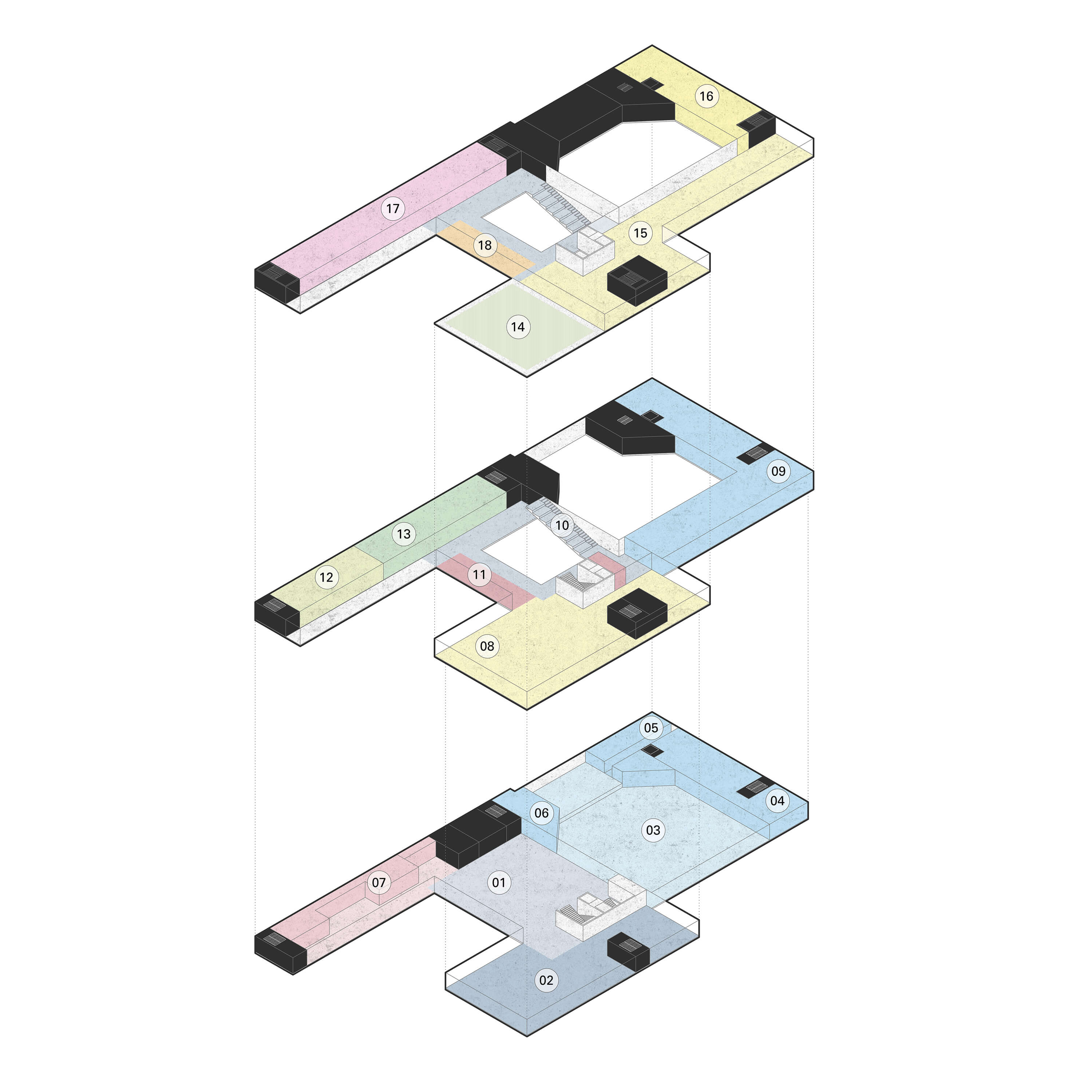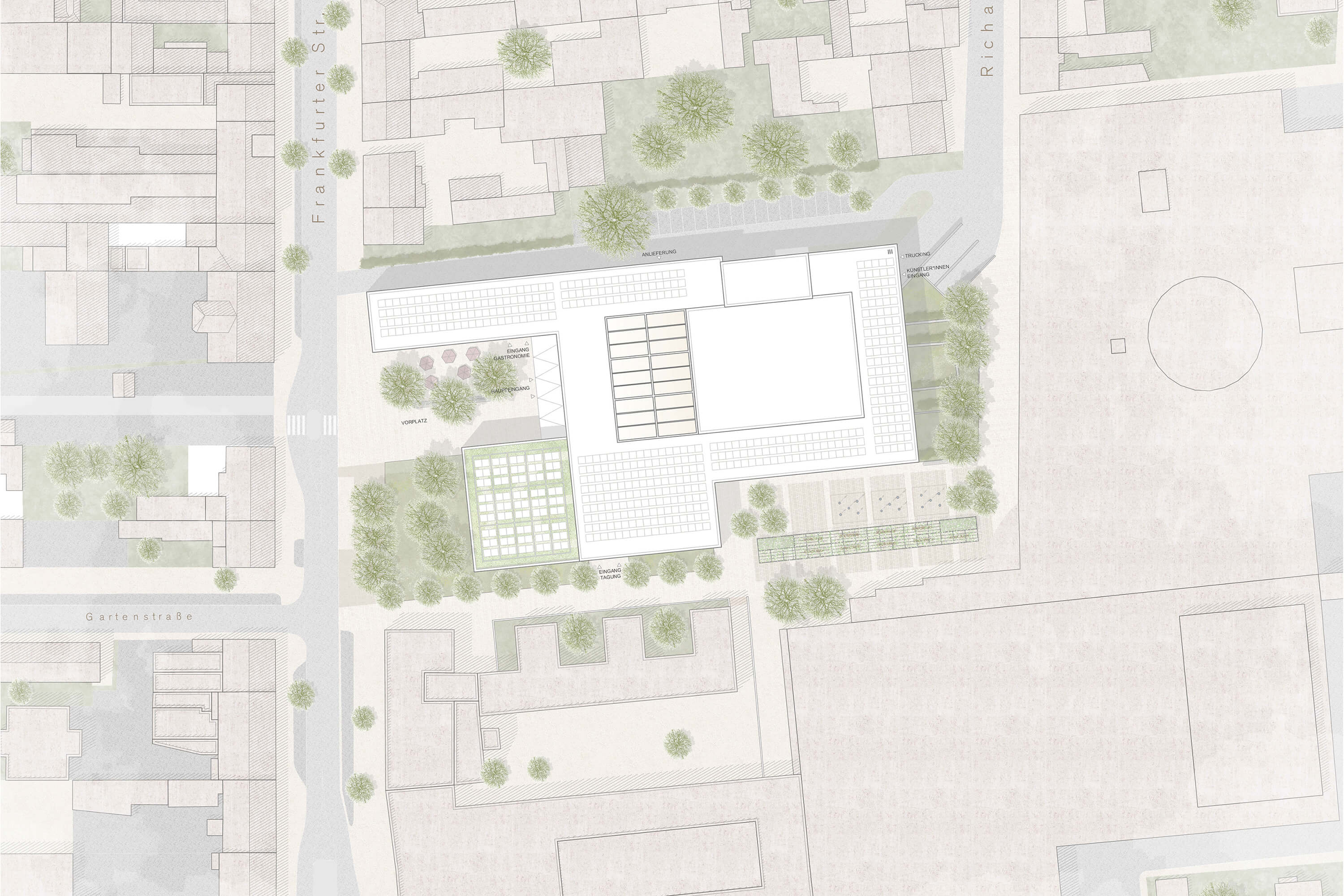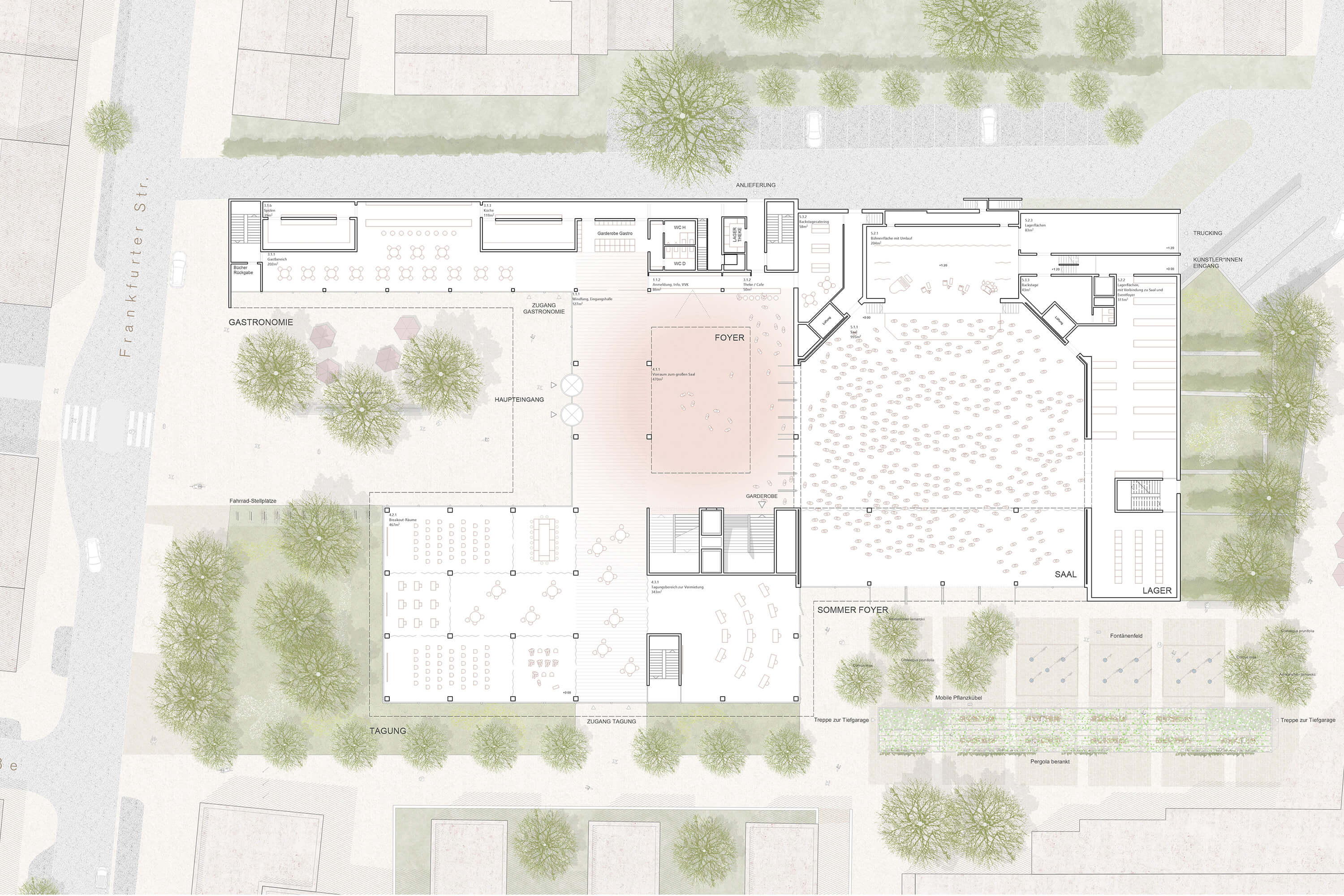 An essential basis for the revitalization of the Hugenottenhalle is its urban consolidation and the strengthening of its urban presence towards the address-forming Frankfurter Strasse. To this end, the necessary extension of the hall is proposed primarily on the west side and as an increase in the height of the existing building, so that its completely renovated face moves closer to this important urban axis. A slender wing of the building on the northern edge of the forecourt frames the future entrance together with the current library building. The gastronomy located here on the first floor is oriented towards the south and ensures that the square is enlivened. The rather heterogeneous neighboring buildings to the north will no longer play a role in the future formation of the square and will thus gain more privacy. The flexible conference area will be located on the first floor of the current library. Its ground-floor location and separate access from the south will ensure that it can be used independently. The main structure will be extended by one axis to the west to create space for an appropriately spacious foyer and to strengthen the visibility of the Hugenottenhalle in the urban space.