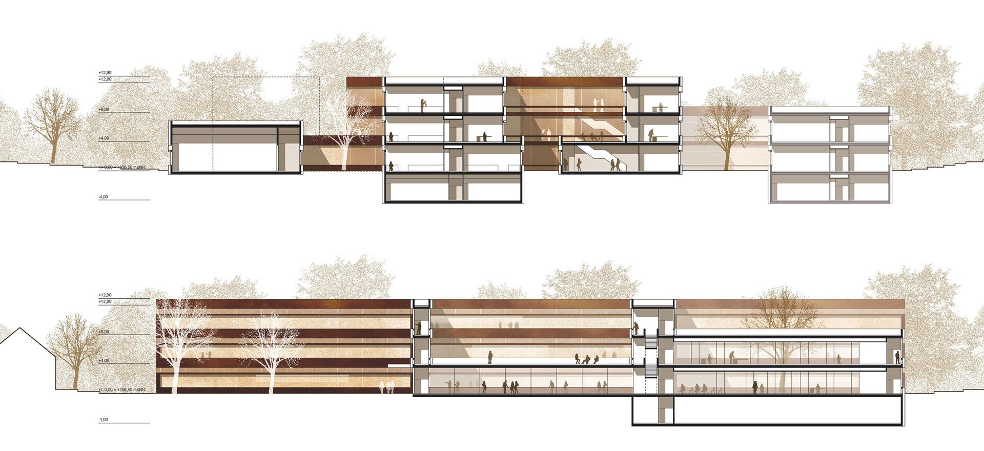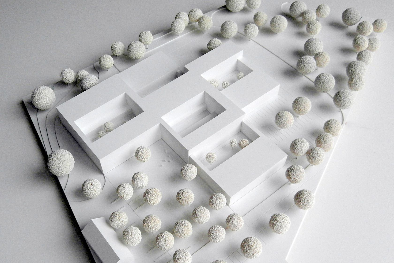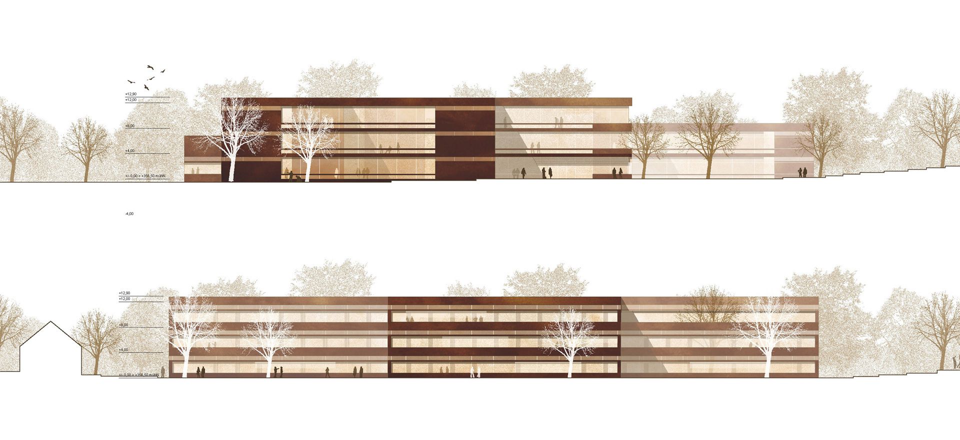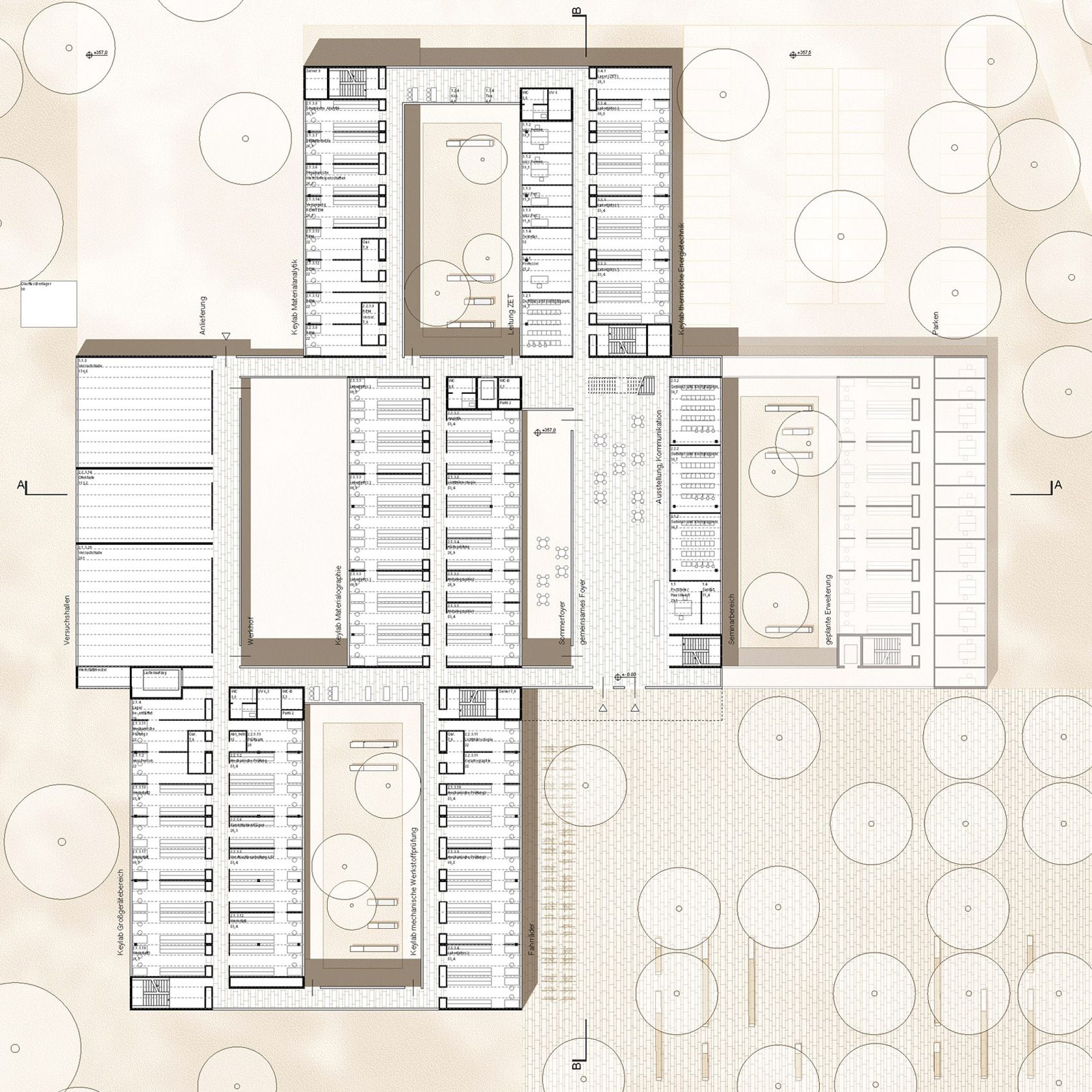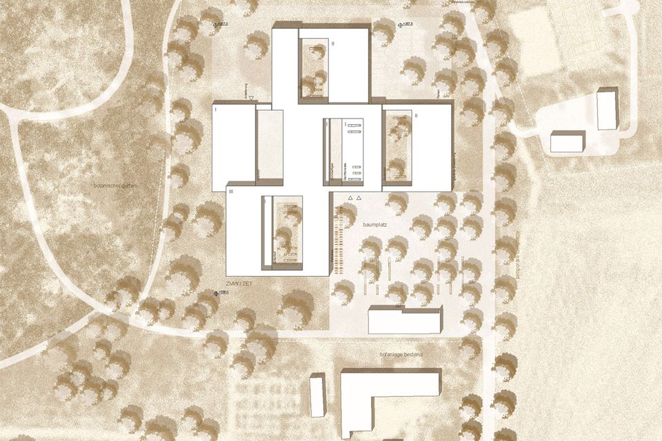 The aim of the concept is to develop building structures and open spaces that can be used in a variety of ways, as well as to create an address for the existing campus. The building structure makes it possible to react very flexibly to different boundary conditions within a single system. Thanks to its spatial staggering, the structure is able to follow the curved contours of the site. Thanks to the underlying grid and its variable number of storeys, the urban planning principle offers a high degree of flexibility and at the same time provides a stable urban planning framework. As the first building block in the expansion area, the institute plays a decisive role. It occupies the interface between the existing campus and its extension. The two to three-storey structure is divided into seven modules, which are linked to each other by pathways. This modularity and four courtyards give the new building a clear and functional internal structure.