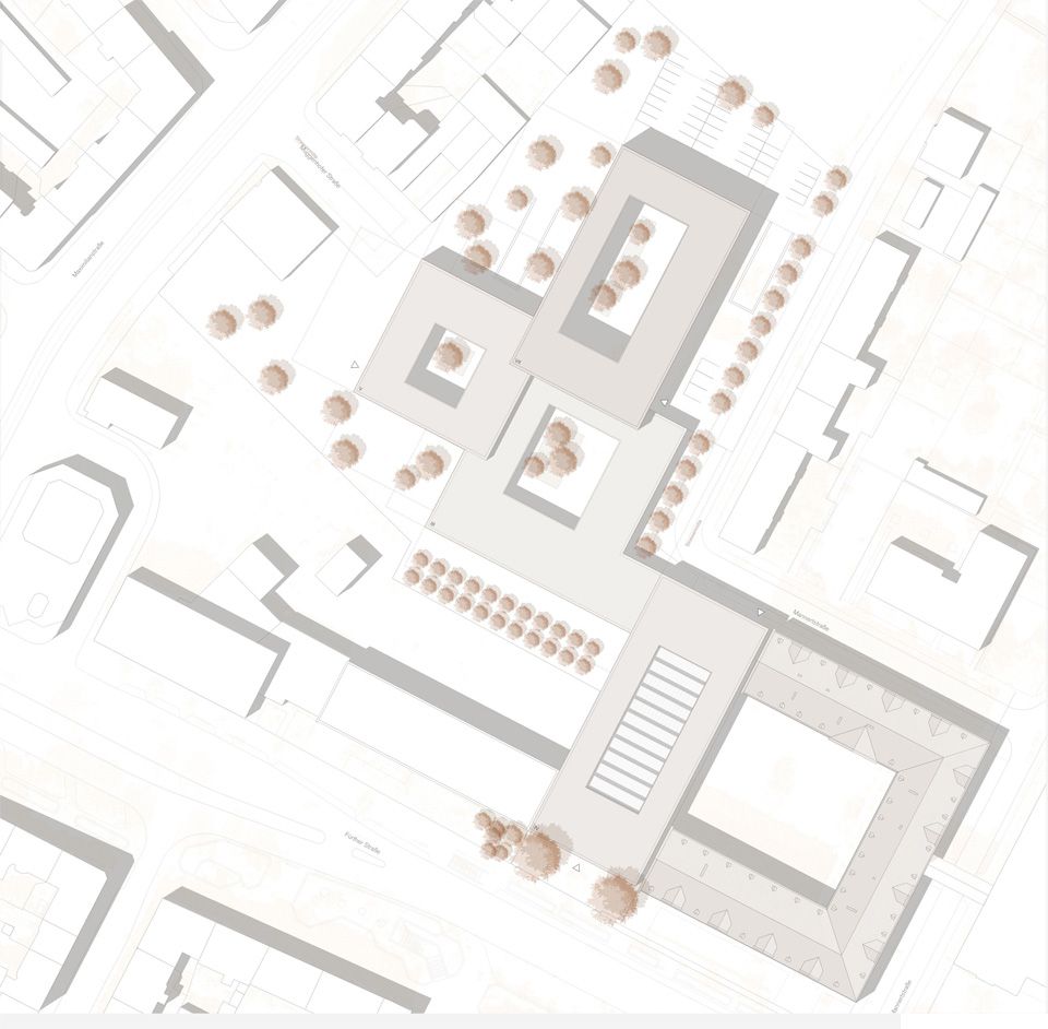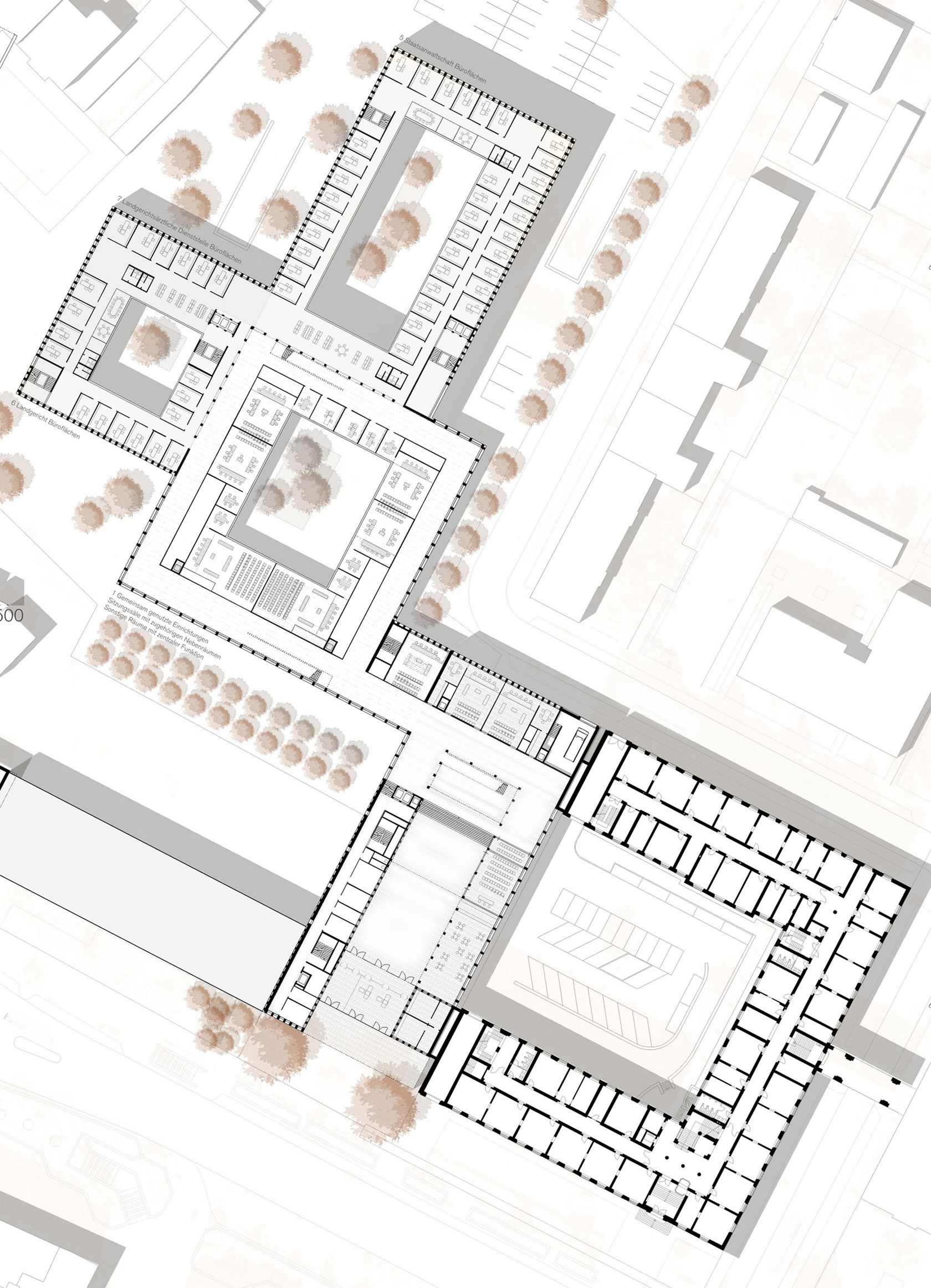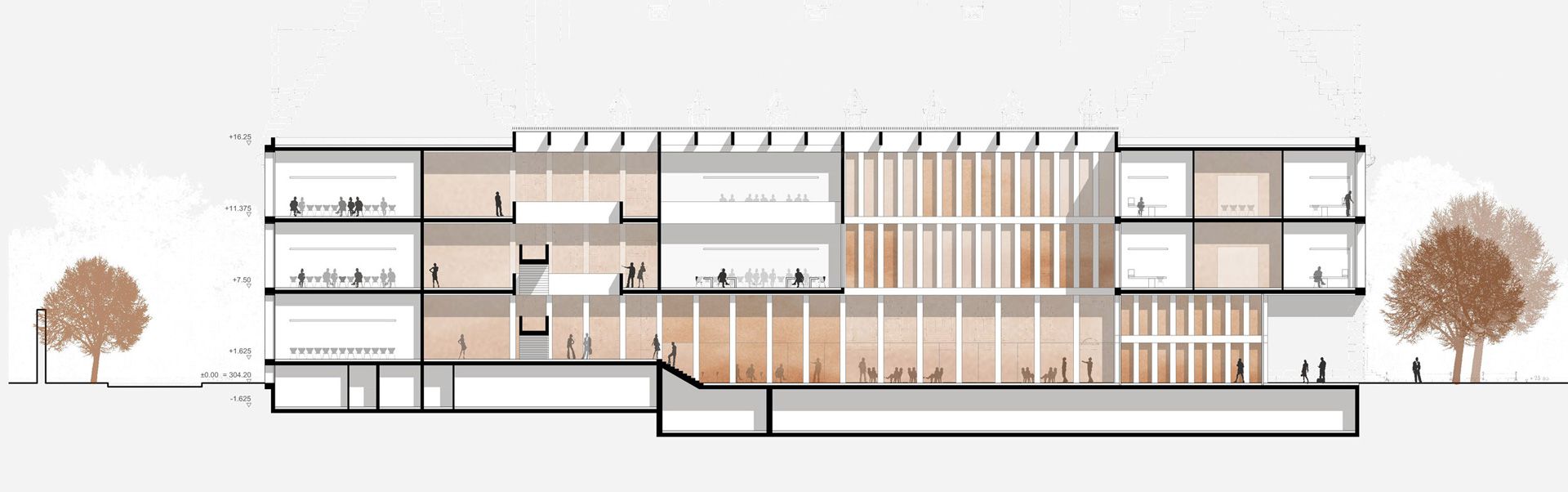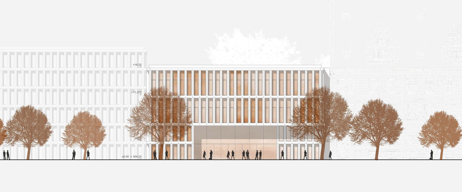 A chain of rectangular buildings forms the new criminal justice center in Nuremberg. The first construction phase is oriented in proportion and location to the existing justice center, rounds off the existing building and is the visible prelude to the new criminal justice center. The building's front formulates a clear entrance gesture. The public reaches the hall area via an atrium, where the cafeteria and meeting room are located. A wide staircase provides access to the elevated foyer of the hall area, which extends over three floors. The large conference room is centrally located on the second floor. The façade is structured by a carefully proportioned rhythm of windows and pillars, which develops a calm and independent style thanks to the different storey heights and varying pillar widths. The appearance of the building is characterized by a few materials, such as prefabricated white concrete elements for the façade and red oak wood for the wall cladding, furniture and hall floors.
