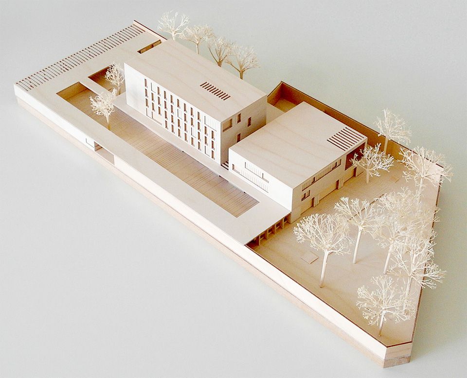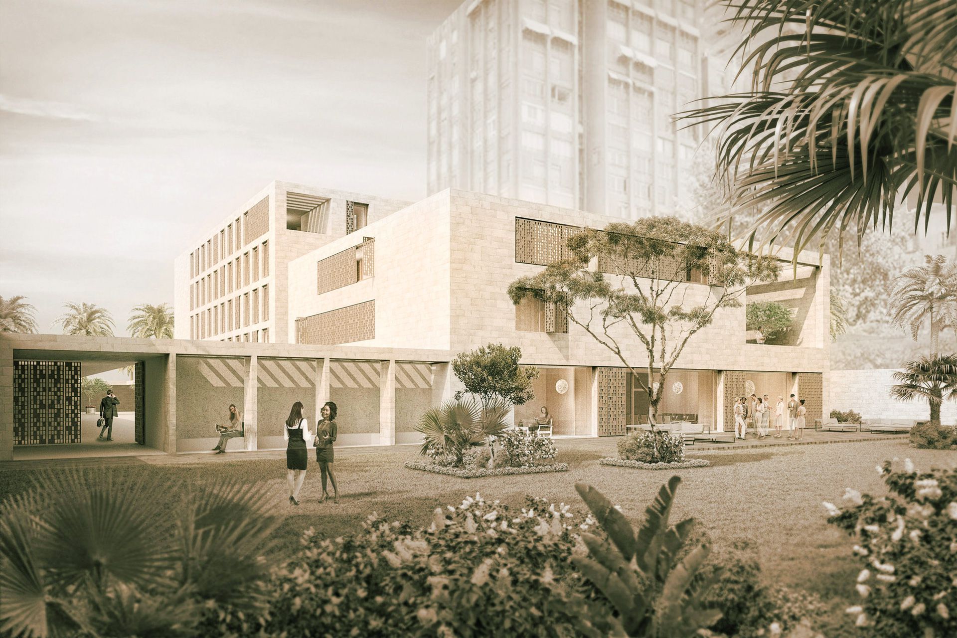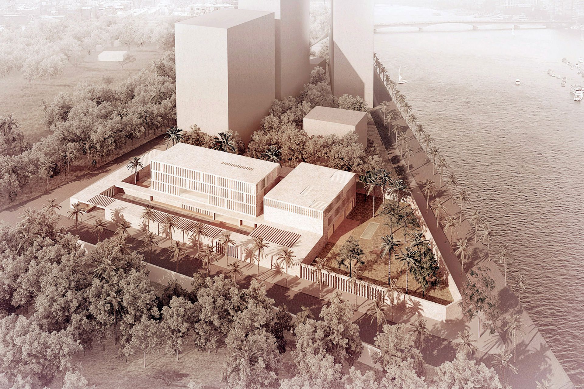 The site of the German embassy in Cairo is divided into the buildable part facing the city and the residence garden facing the Nile. Two structures are projected upwards from a horizontal roof slab, and three rectangular inner courtyards are pressed into the slab. This creates the Visahof, the Kanzleigarten and the Repräsentationshof. The two structures form the chancellery and the residence facing the park, thus enabling a spatial division of uses despite the narrow plot. The façade cladding made of flamed Egyptian limestone gives the building a dignified appearance and anchors it to the site. Three-part elements consisting of office windows, sliding shading elements and niches incorporated into the stone façade for the shutters create a lively façade interplay of light and shadow.