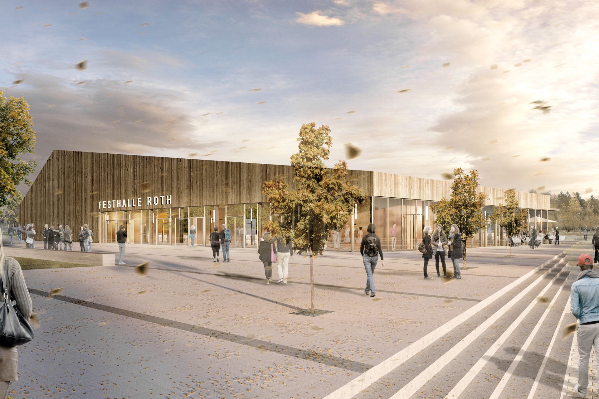 The new festival hall presents a striking silhouette to the city center to the north and to the adjoining city garden to the south. The paved forecourt deliberately separates itself from the existing fairground and creates an appropriately designed apron for the festival hall. On the south side of the hall is a wooden deck overlooking the lake, which can be used by the hall and gastronomy. The glazed foyer lies across the forecourt, formulating a welcoming gesture for arriving visitors. From the foyer there is a generous transition into the banquet hall. The glass front of the hall opens up to a charming view of the adjacent open spaces to the south. The local building material wood dominates the surfaces outside and inside. Careful craftsmanship creates a house with regional reference and pleasant atmosphere.