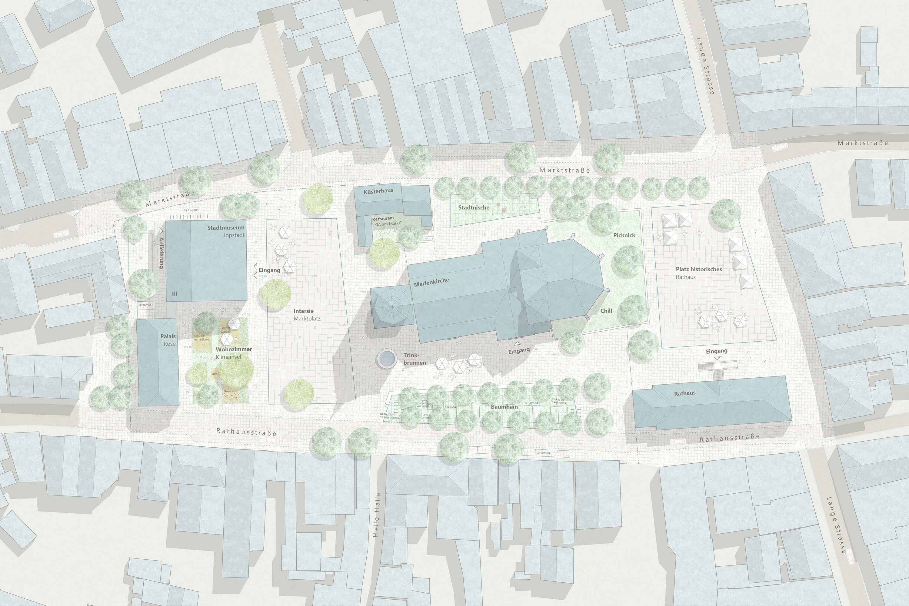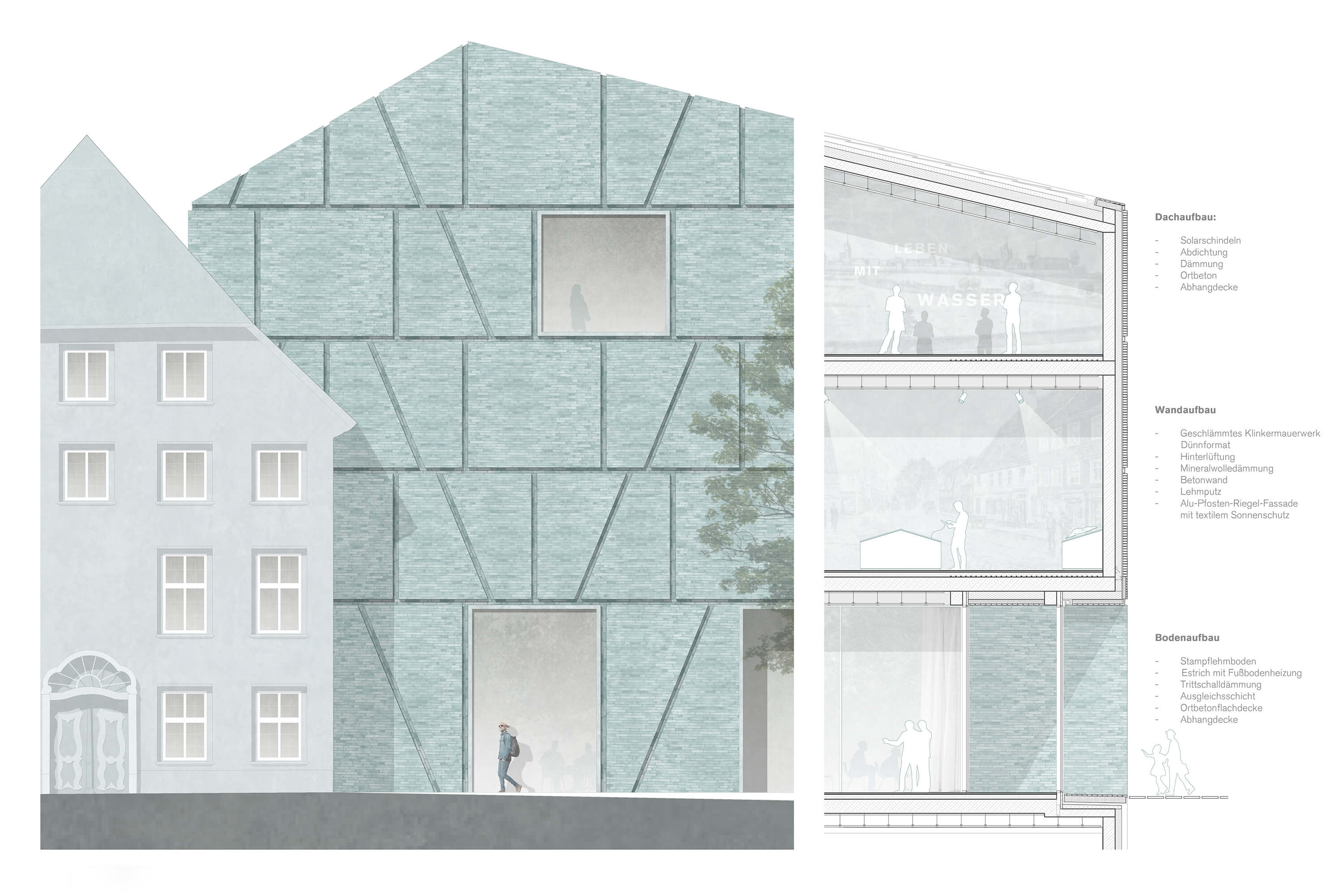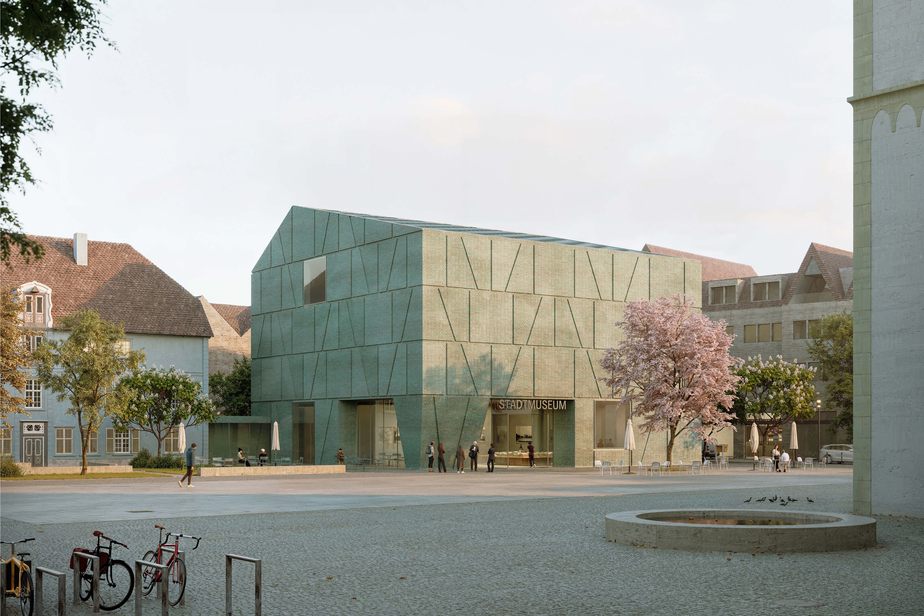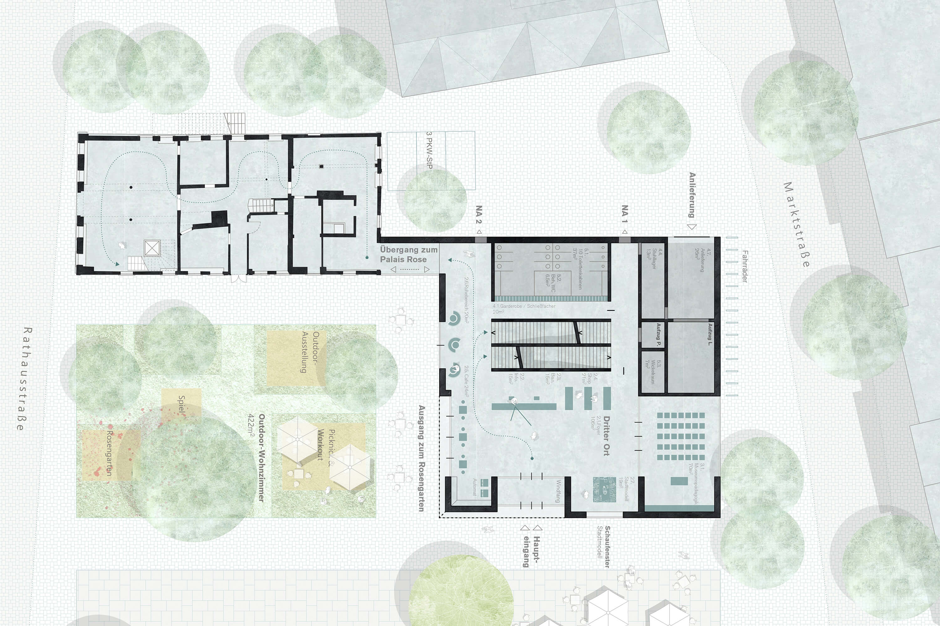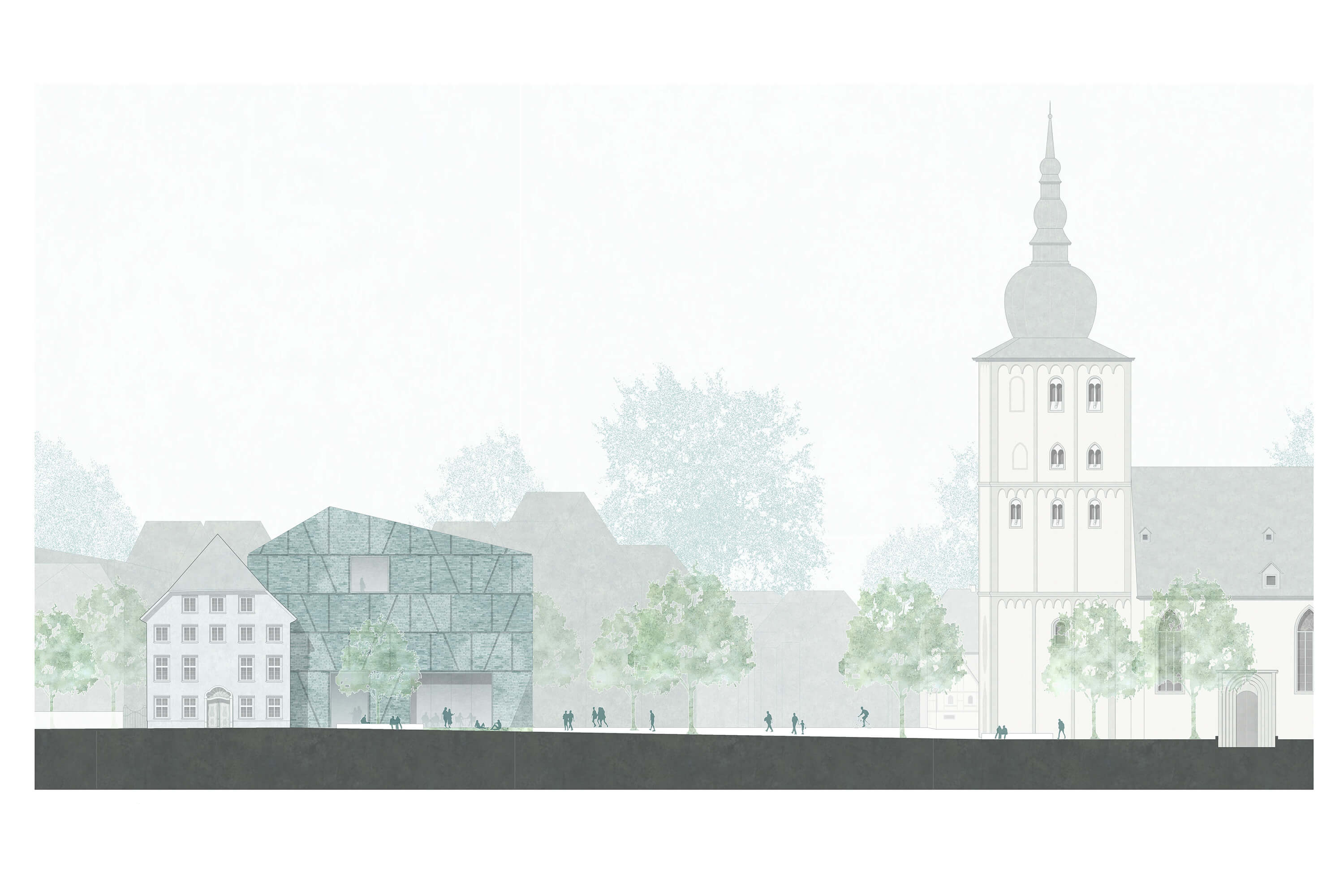 Together with the historic palace, the new museum building stands out against the striking backdrop of Lippstadt's old town around St. Mary's Church, thus enlivening the public urban space. The newly created market square forms the urban counterpart to the town hall square on the east side of the church. The square new building docks onto the northeast corner of the Palais Rose, thus zoning the surrounding urban space. By placing the new building on the corner, the historic palace will retain its solitary role and charisma on the market square in the future. The gable of the asymmetrical gable roof gives the new building the desired prominence of a cultural building opposite Lippstadt's St. Mary's Church. At the same time, the lowered eaves lines reduce the perceived volume of the building and give it an appropriate scale in the neighborhood. The entrance to the museum leads directly into the spacious foyer with a ticket counter and shop. The museum education center to the north can be connected to the foyer to create a versatile space.
