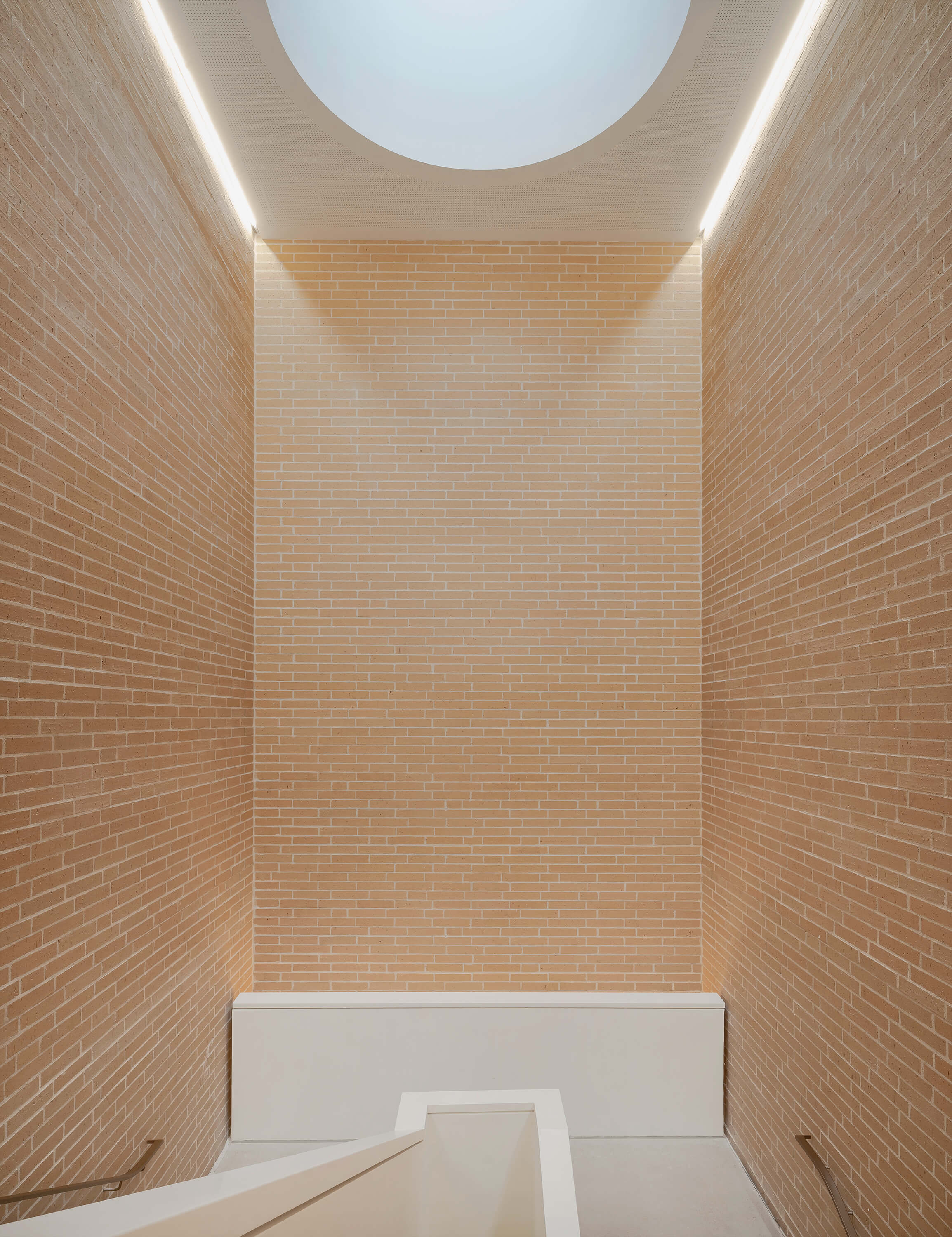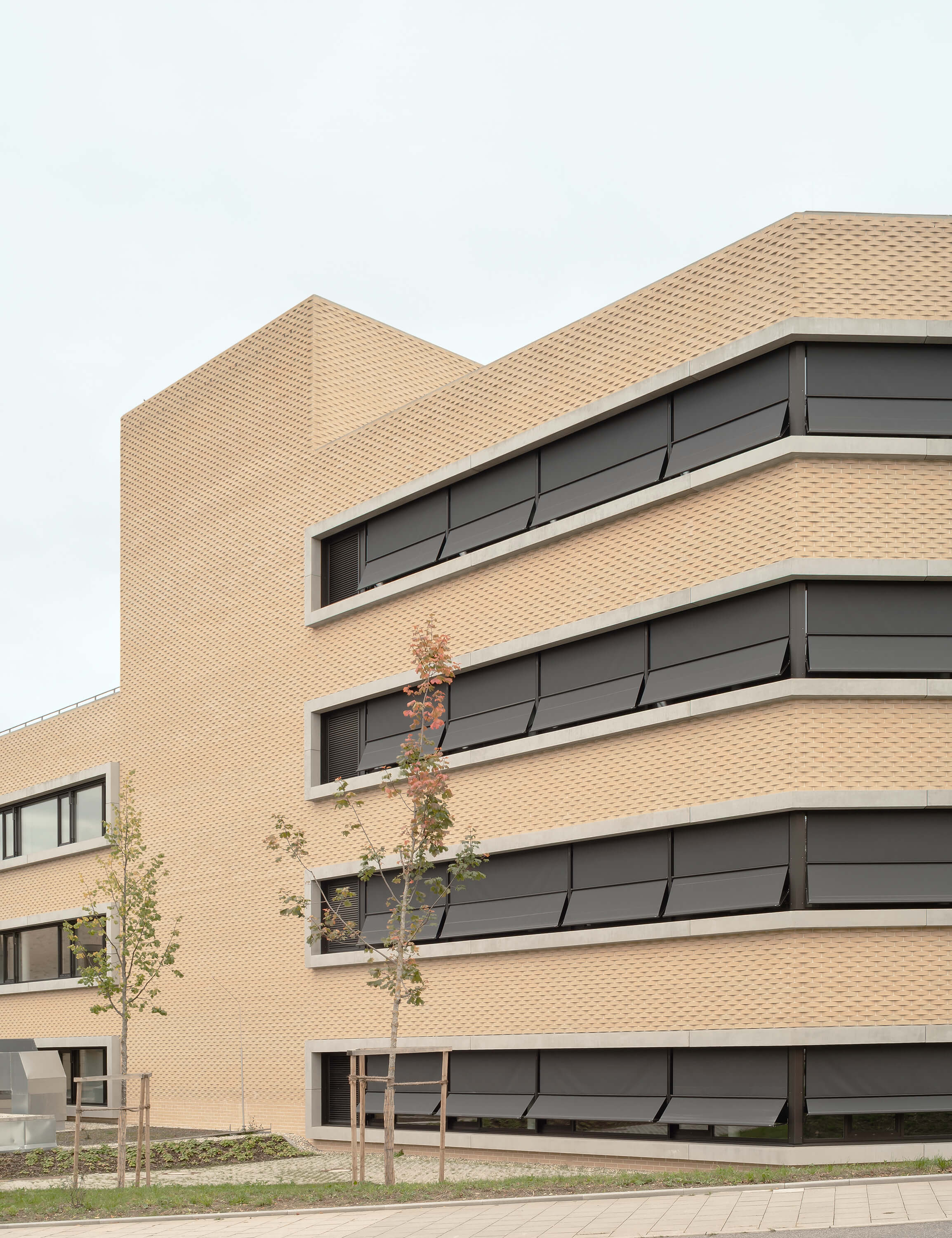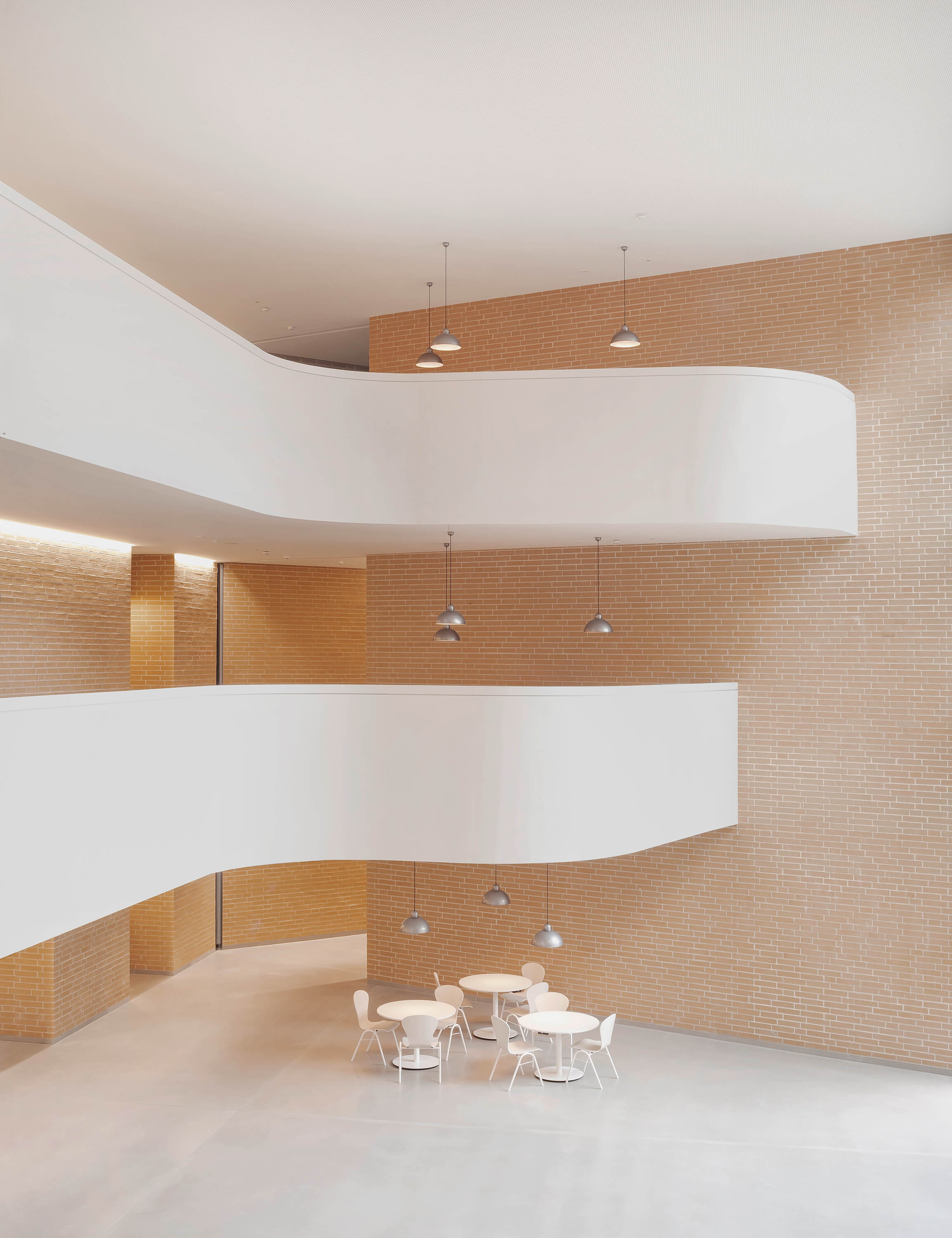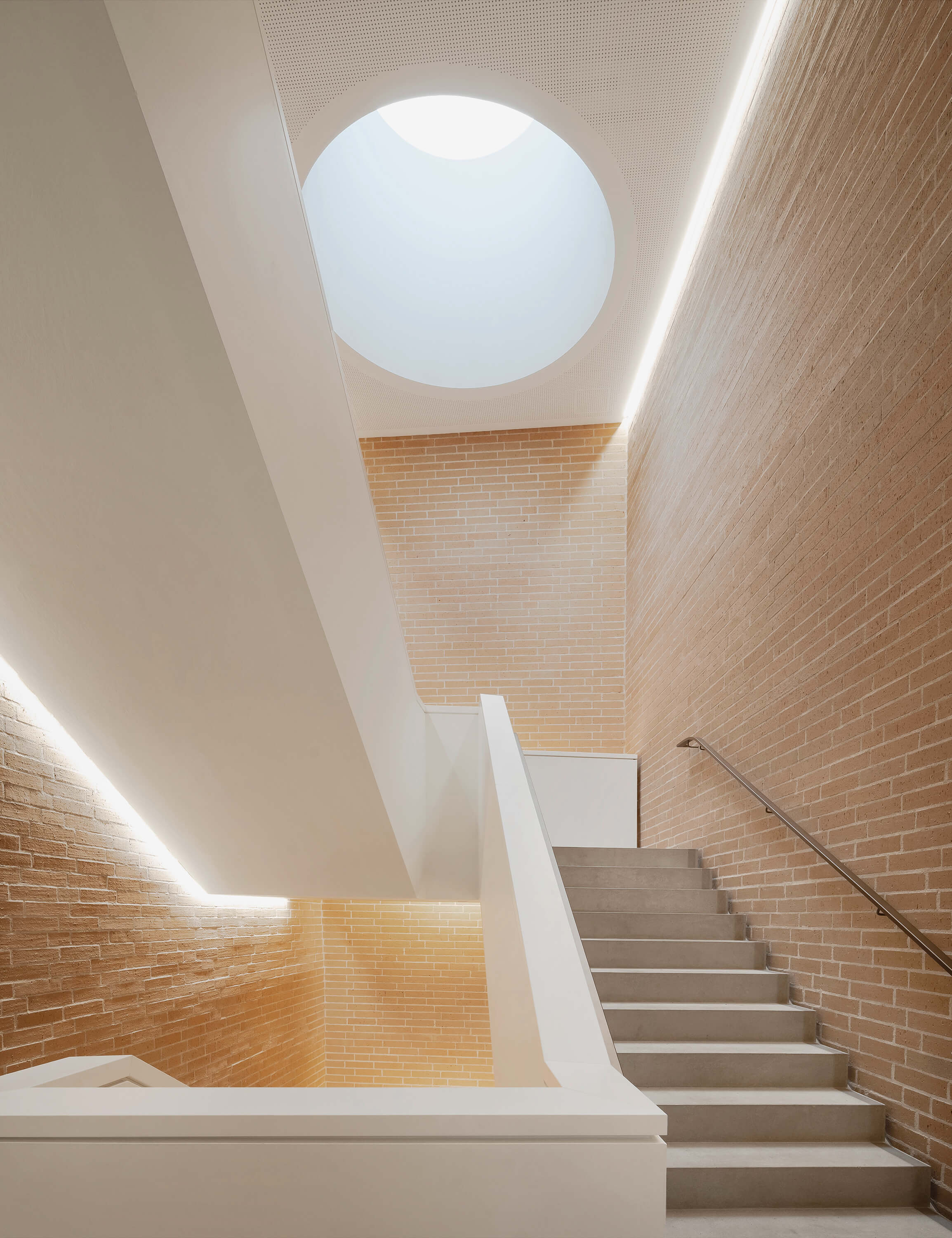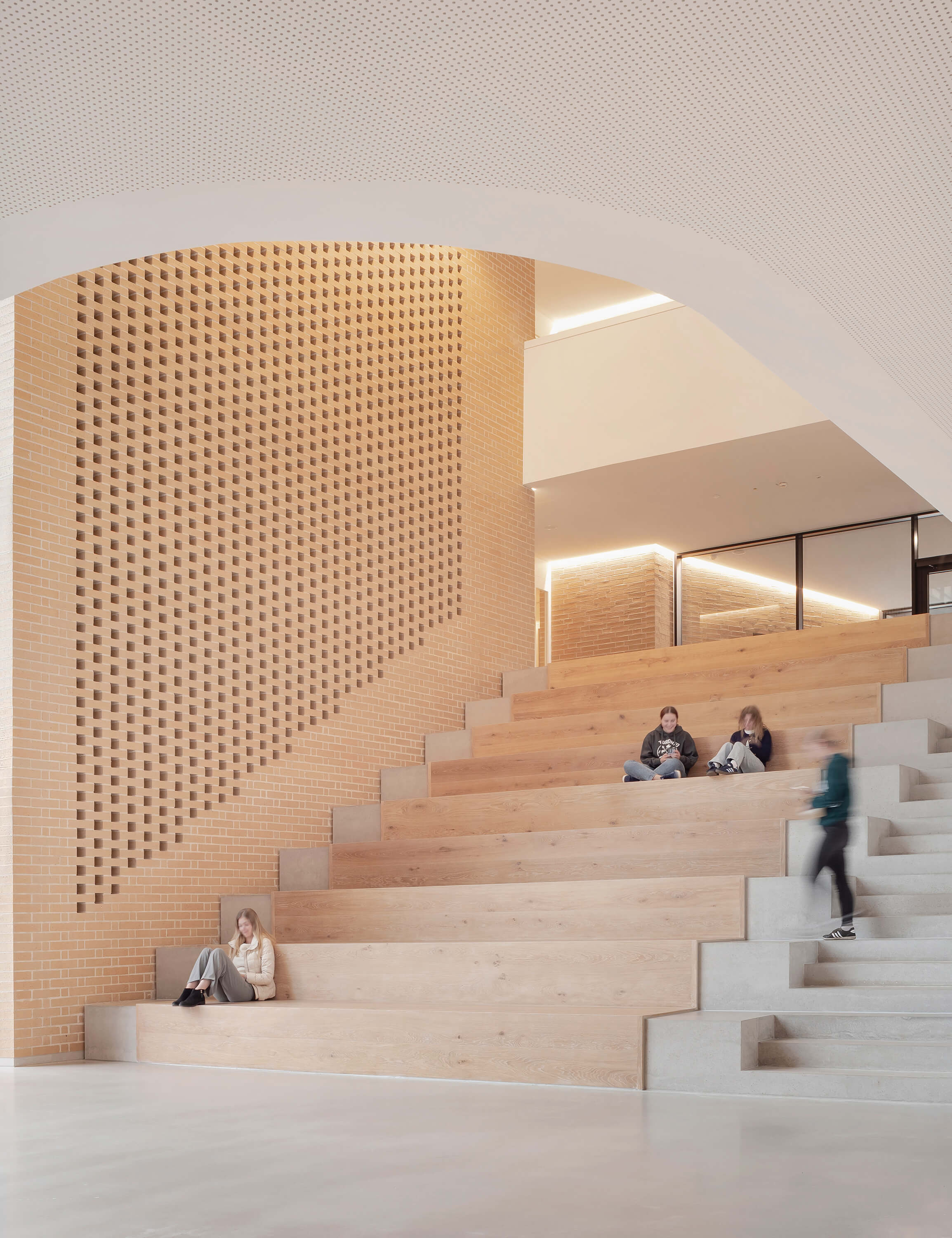 In terms of its materials, the new building ties in with the carefully detailed clinker brickwork of the existing building and develops this further. The pentagonal bricks, which were fired especially for the new building, were laid in layers offset against each other, creating a fine facade relief with an almost textile-like appearance. The sunlight conjures up a delicate play of light and shadow on the relief masonry. The exposed masonry of the facades is also continued inside. Here, the grazing light from the strip lights accentuates the handcrafted character of the masonry, creating a high-quality and robust atmosphere in the new vocational school.