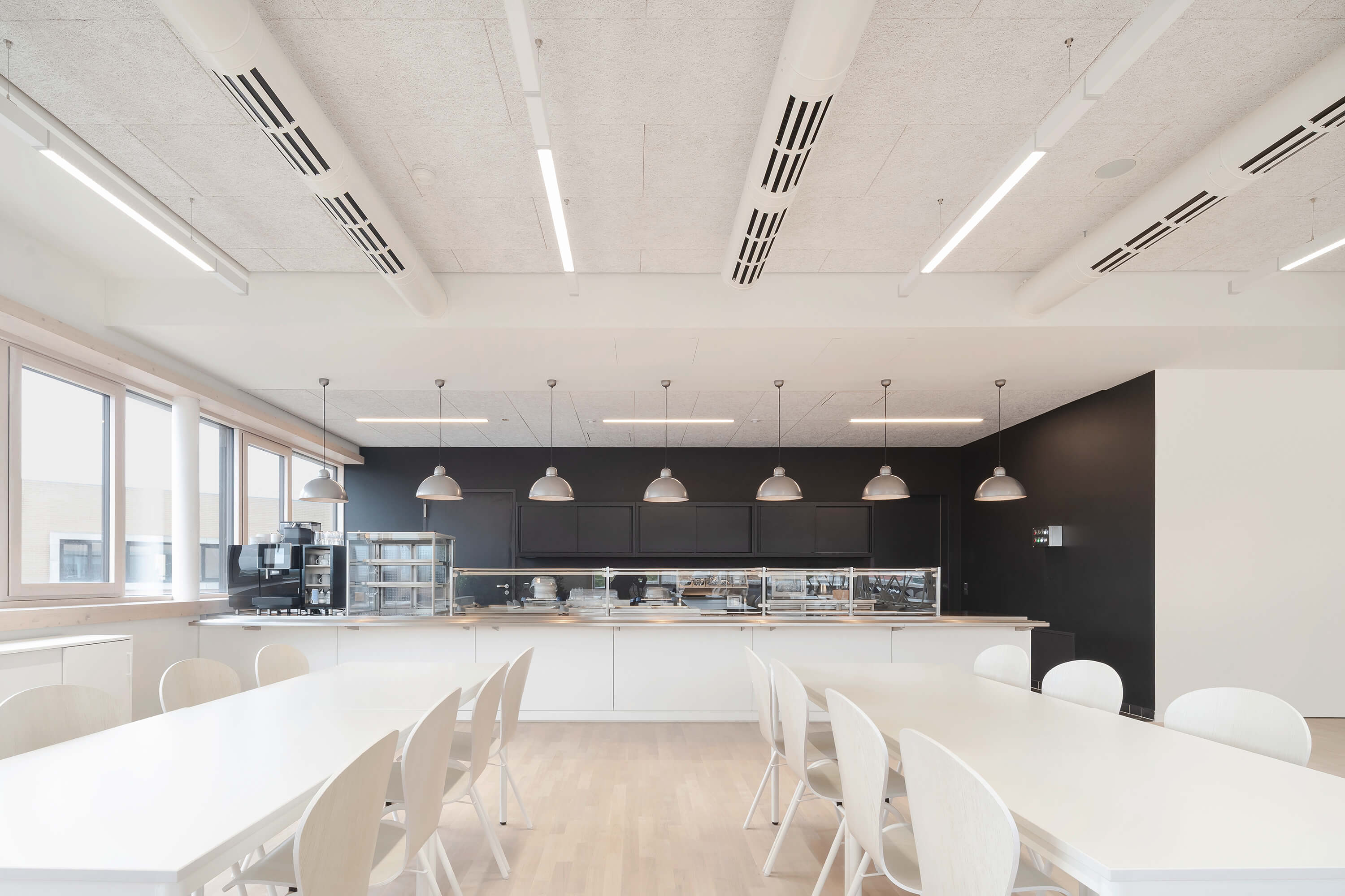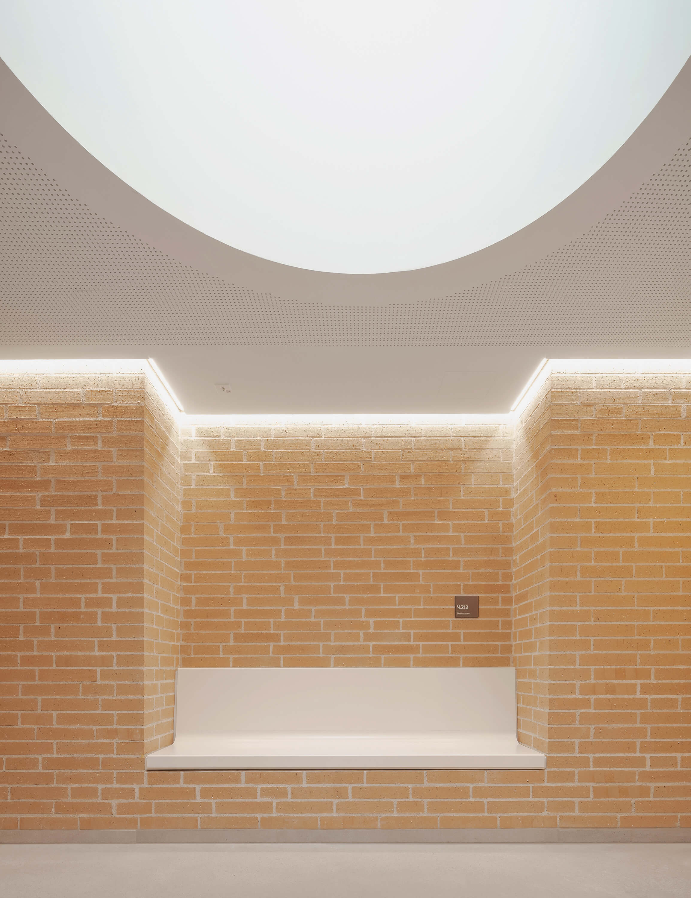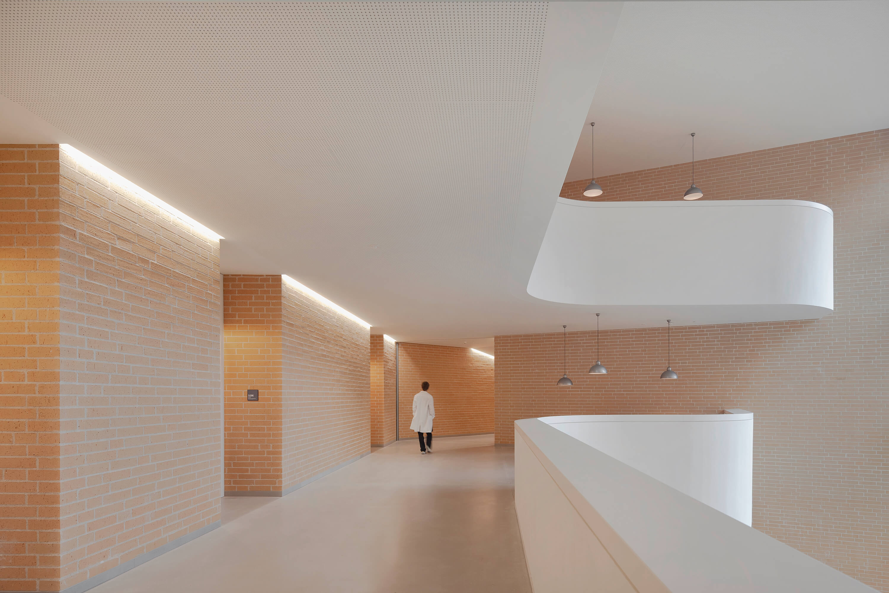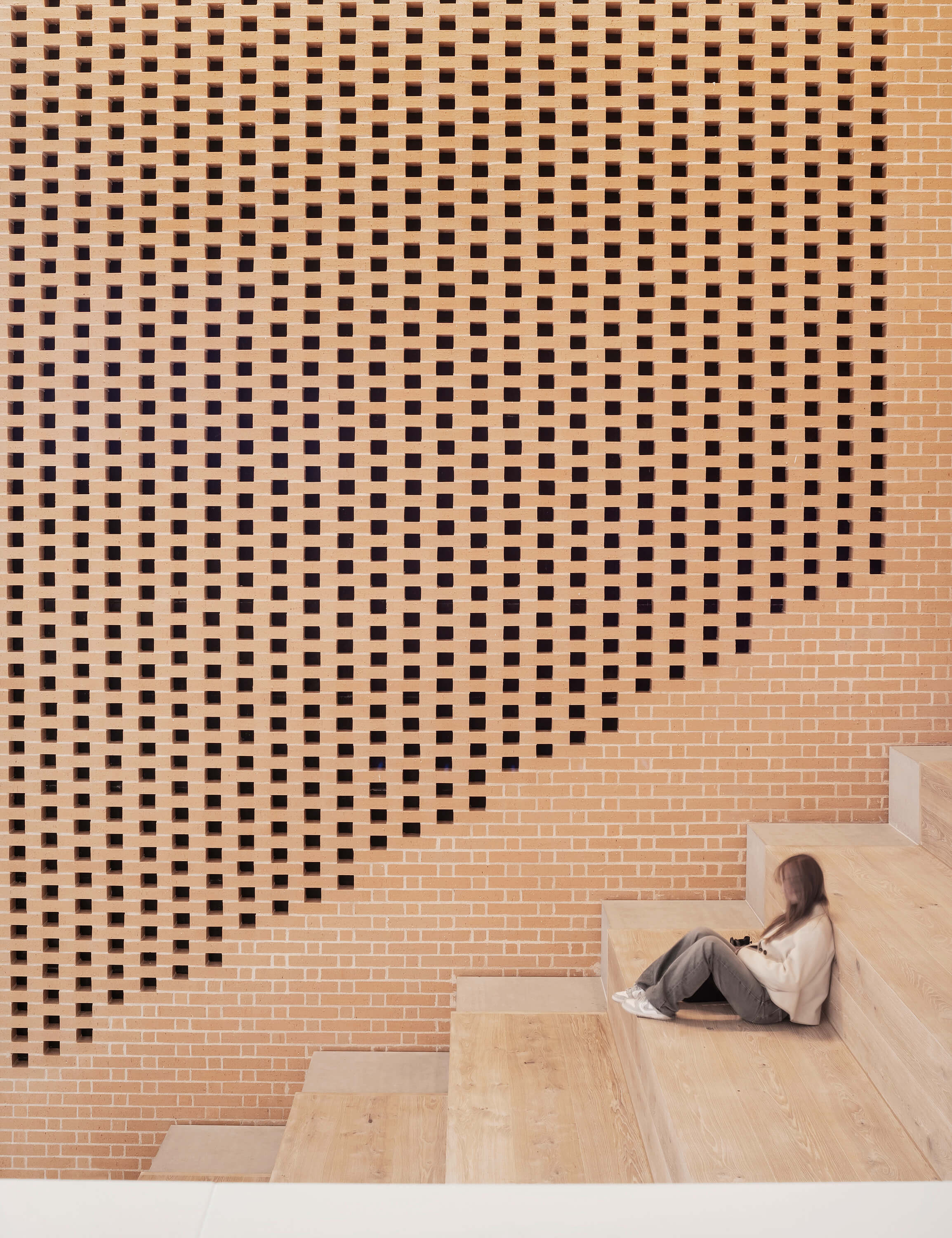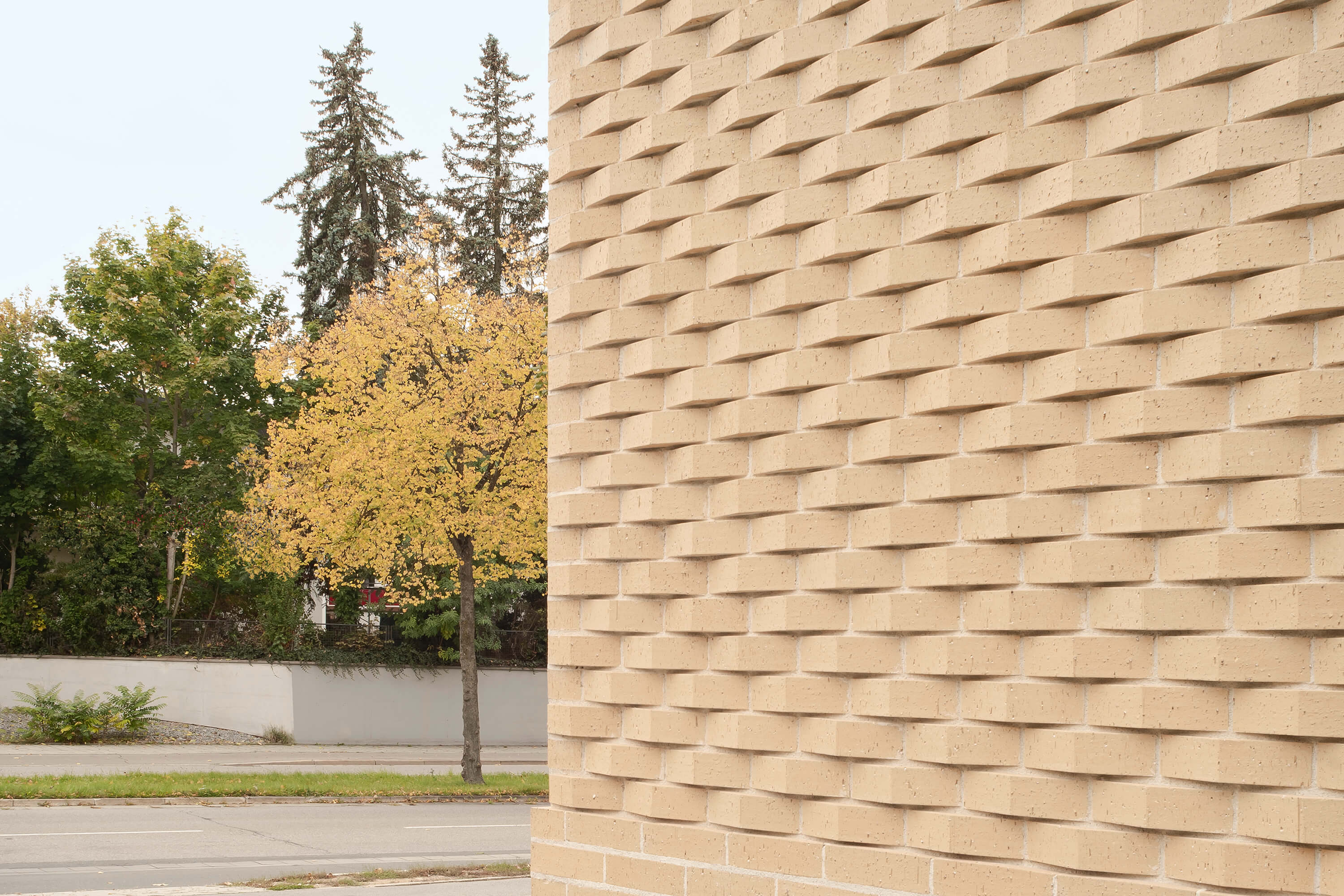 In terms of its materials, the new building ties in with the carefully detailed clinker brickwork of the existing building and develops this further. The pentagonal bricks, which were fired especially for the new building, were laid in layers offset against each other, creating a fine facade relief with an almost textile-like appearance. The sunlight conjures up a delicate play of light and shadow on the relief masonry. The exposed masonry of the facades is also continued inside. Here, the grazing light from the strip lights accentuates the handcrafted character of the masonry, creating a high-quality and robust atmosphere in the new vocational school.