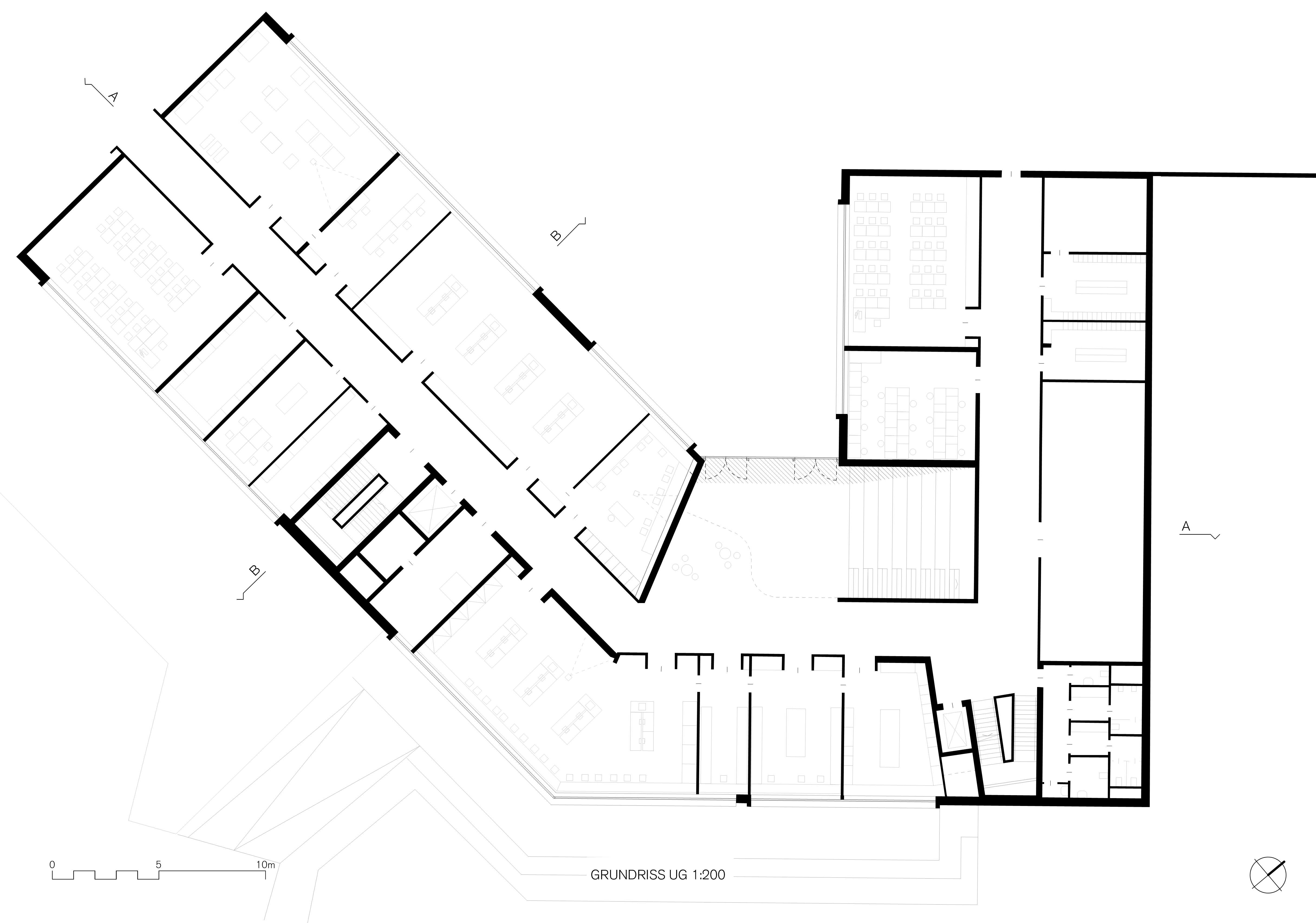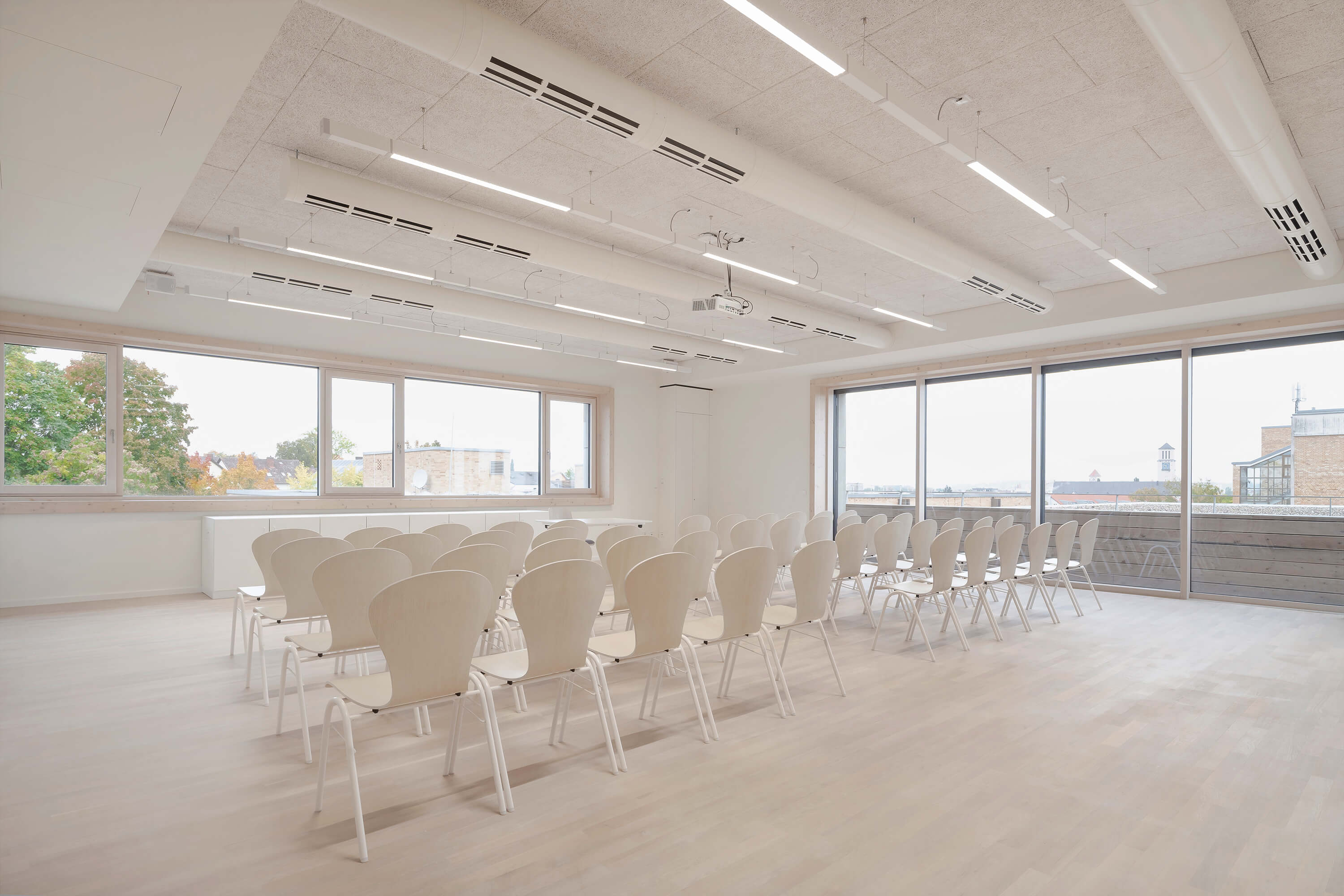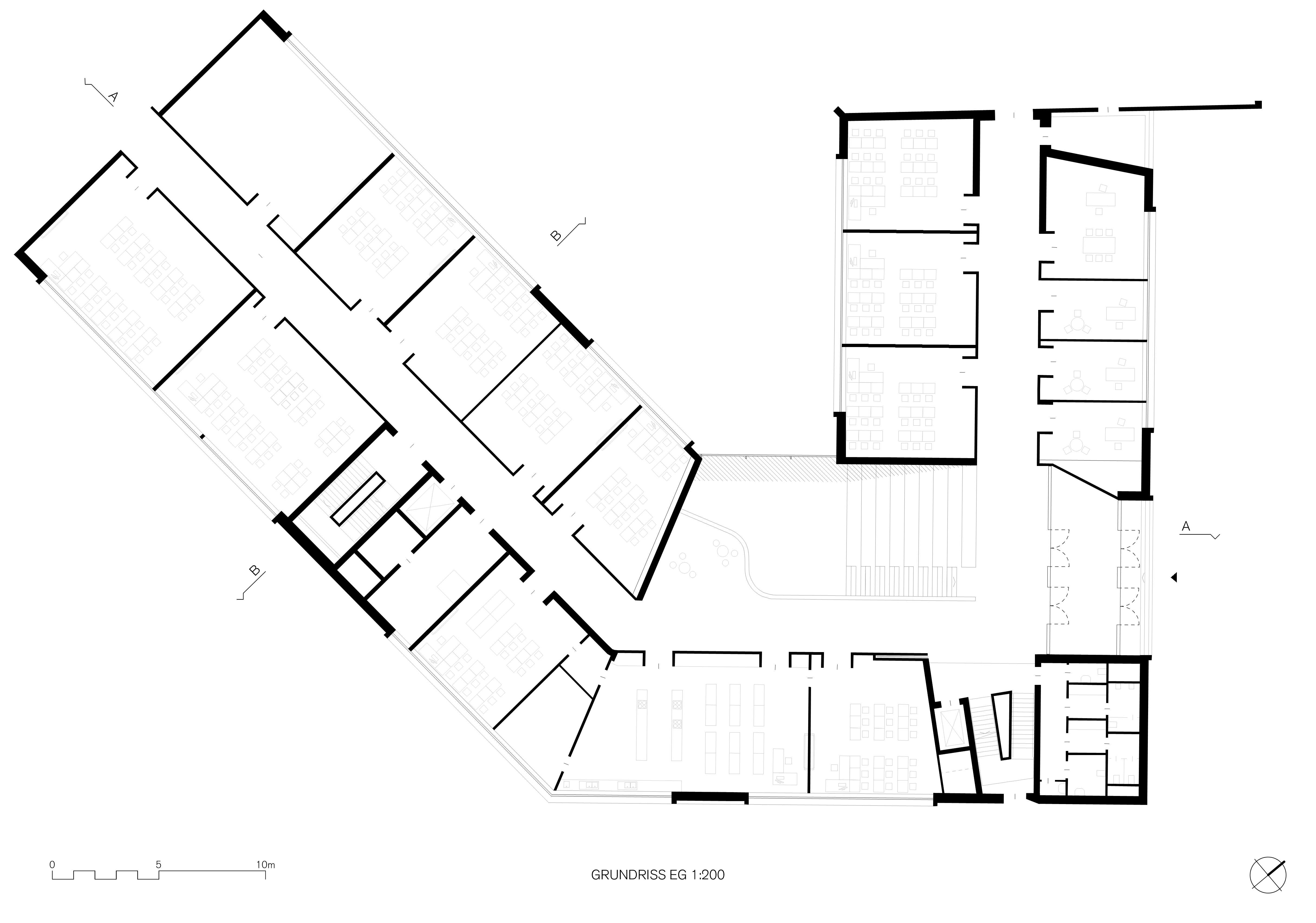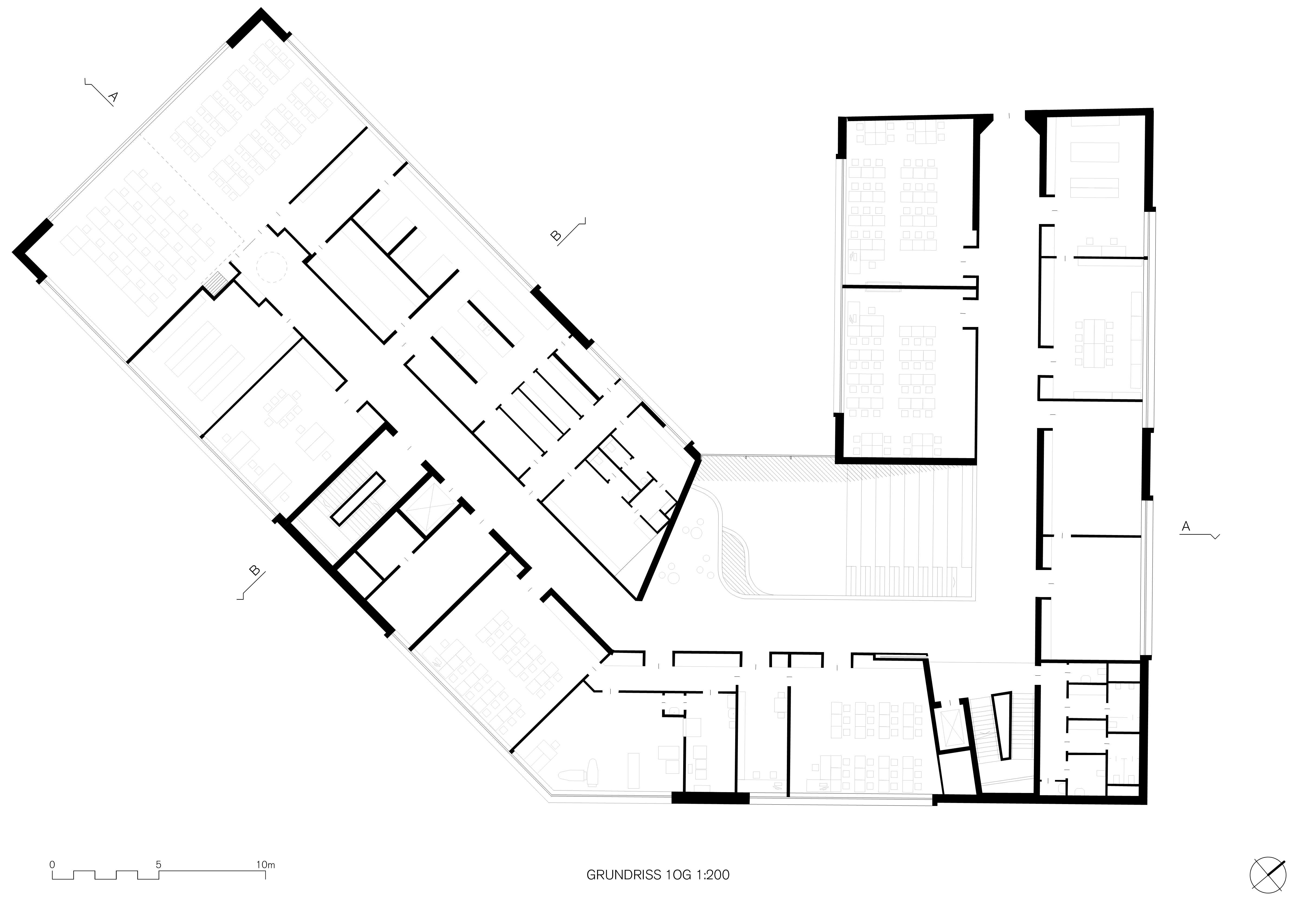 The extension to the vocational school ties in with the terraced existing building from the early 1980s in terms of urban planning and complements it with a distinctive building front at the southern end. The previous cul-de-sac situation has been converted into a ring road. Lettering cut from 20 cm thick raw steel plates marks the entrance to the school: Teachers and students are welcomed by a three-story hall, the communicative meeting place at the heart of the school. A seating staircase covered with oak planks creates a pleasant atmosphere; the curved galleries on the upper floors offer attractive views downwards. Daylight from the green inner courtyard falls into the school hall through the floor-to-ceiling glass façade.
