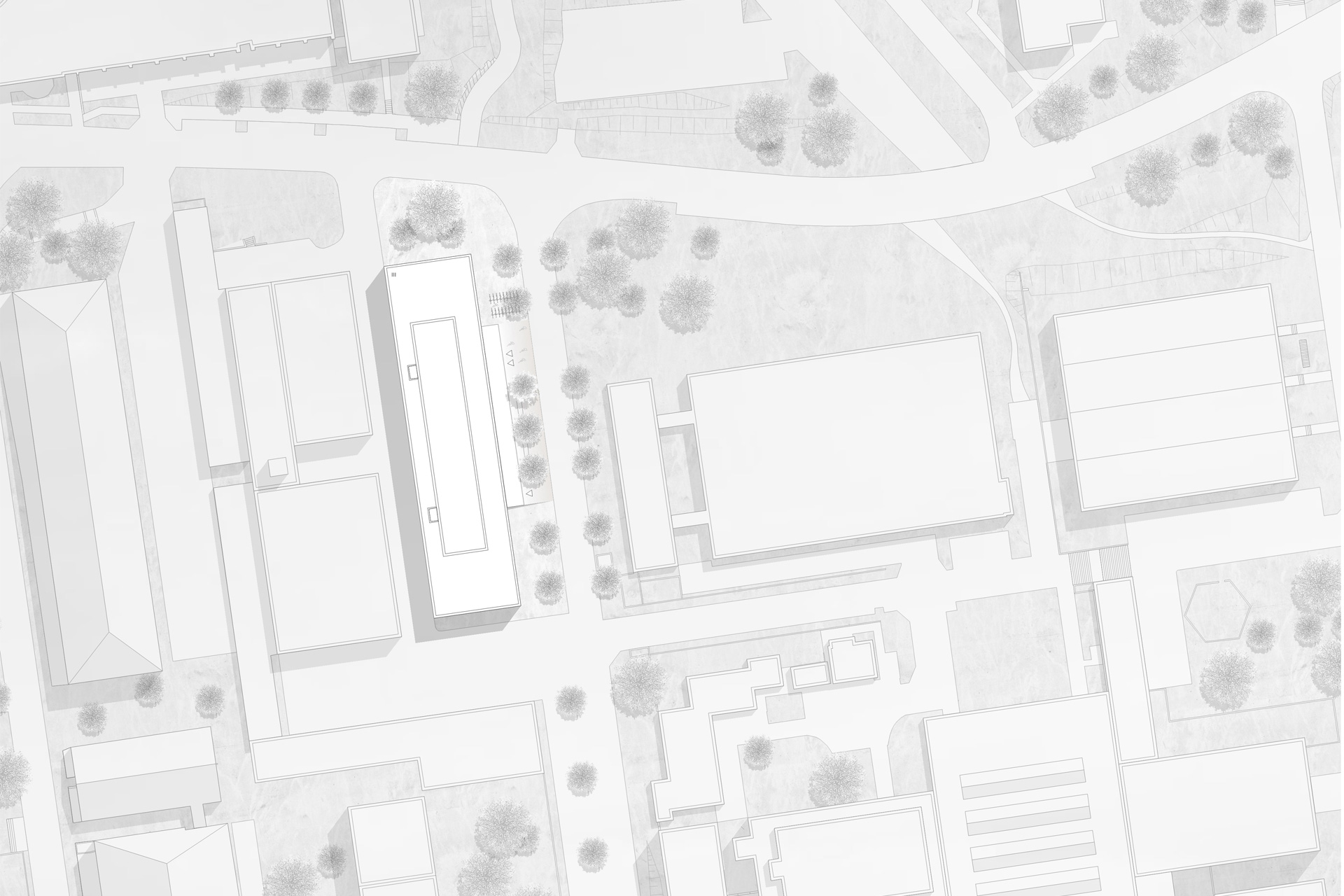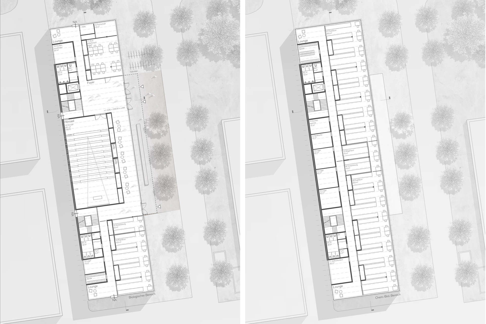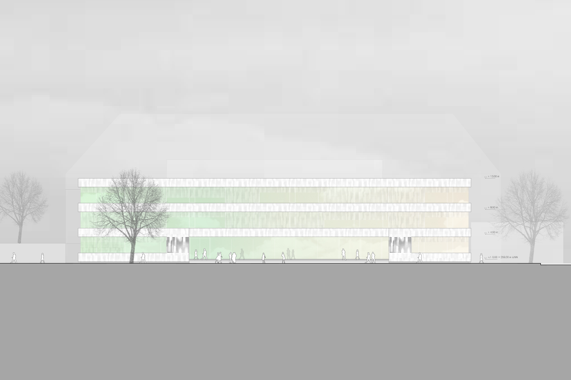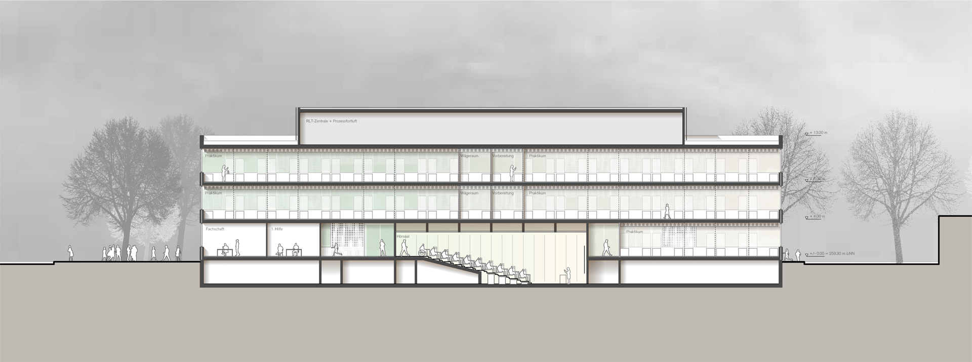 The new construction of the internship building will be placed in front of the western adjacent halls as a clearly defined head building. The urban planning situation will be rectified, and an inviting forecourt situation will be formulated for the east-facing Campusstraße. The ground floor houses the shared functions, while the two upper floors house the chemical and chemical-biological areas. The horizontally segmented white aluminum façade features a sequenced relief that was abstracted from a rasterized microscopic image of a cell structure, which is also printed on the textile sun protection. The rationally developed house is given an identity-creating form with simple means.