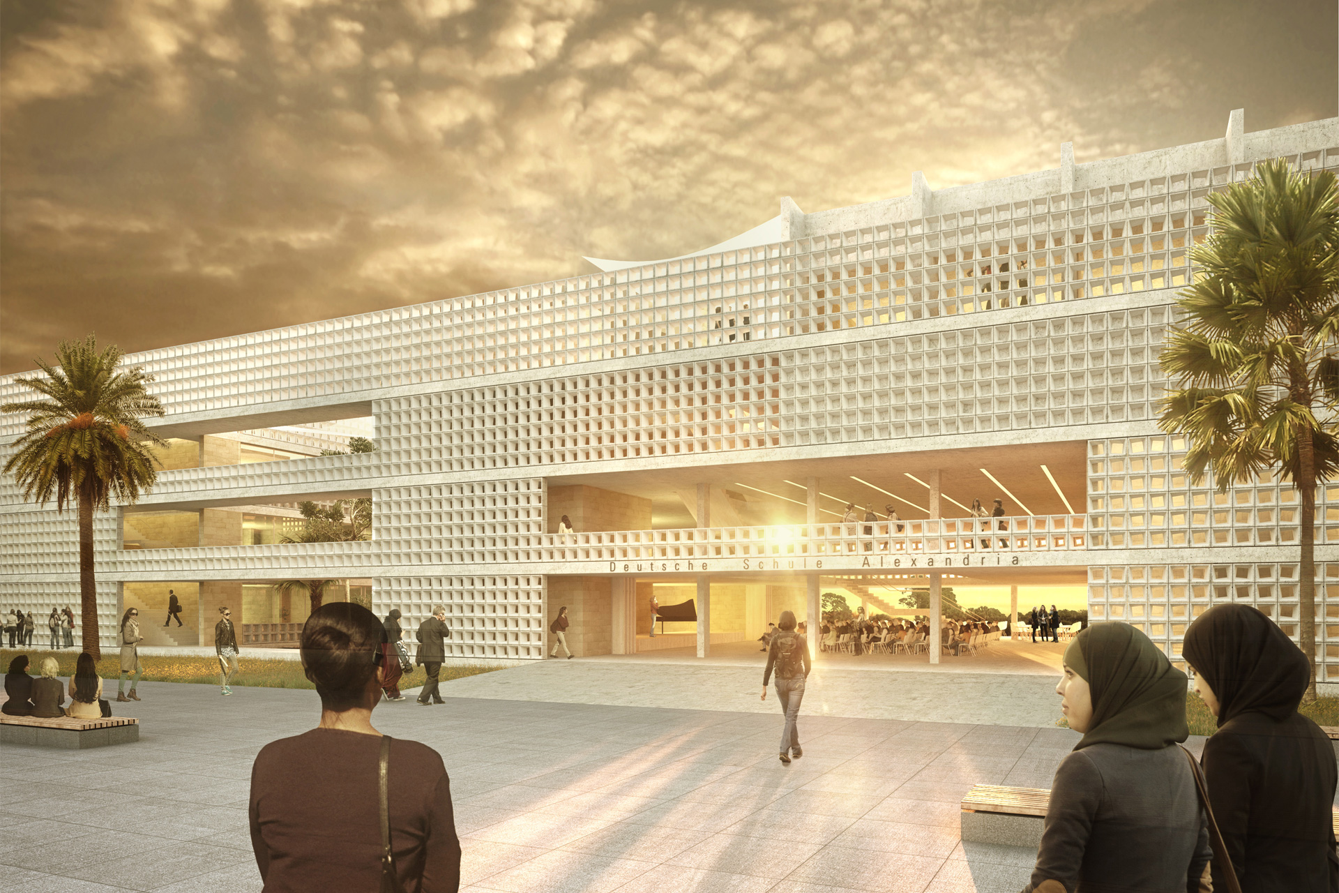 The elongated school building divides the site into two different areas. The northern apron serves to organize the arrival of pupils by bus. To the south of the school, the site staggers down a wide flight of steps to the break and sports areas. The building is made up of a rhythmic sequence of classrooms and inner courtyards, which are linked by a perimeter walkway. Higher-level functions (assembly hall, sports hall, congregation) are arranged at the two ends of the building. Thanks to the Egyptian climate, the building can be accessed entirely from the outside. The pergolas are protected from the sun and wind by a perforated filter layer that reinterprets the traditional Egyptian element of the colestra. The solar-powered ventilation concept combines a minimum of technical building equipment with a maximum of thermal comfort.