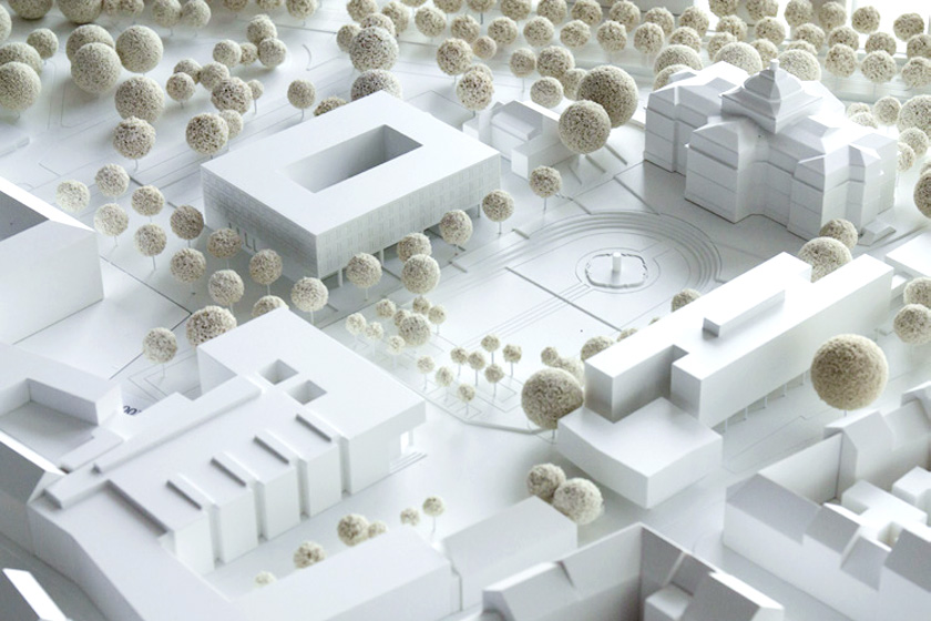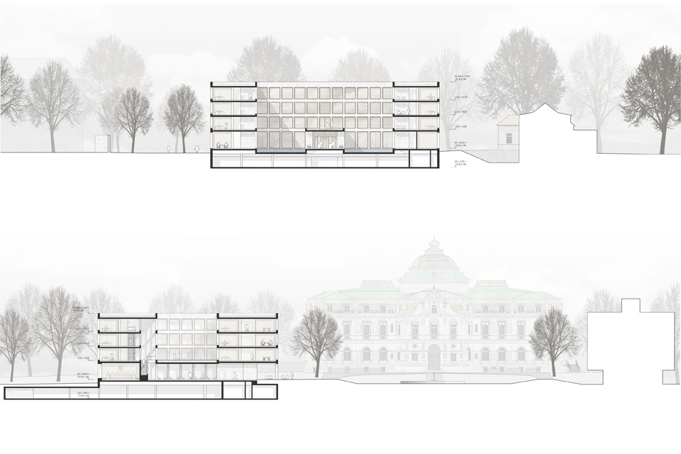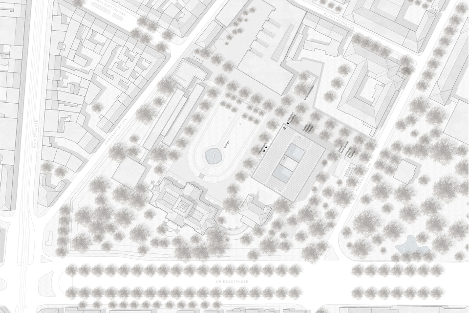 The new east building for the Federal Court of Justice is the keystone on the site of the former Hereditary Grand Ducal Palace. The building is seen as a counterpart to the Erich Schelling building opposite and completes the symmetrical spatial situation. The four-storey east building is divided into a first floor, which houses the higher-level functions, and three identical upper floors, each with two senates. Visitors reach the axially arranged main entrance via a flat ramp staircase along the eastern driveway. The water level of the two inner courtyards turns the foyer into a contemplative center of the building. In the extension of the foyer is the entrance to the courtrooms, which benefit from the view of the adjacent park. Finely bush-hammered white concrete elements combined with carefully detailed box windows in architectural bronze lend the east building a calm and classic appearance. The simple architectural appearance of the new building represents the importance of the Federal Court of Justice. The interest is not in the short-term or the contemporary aspect. Rather, the fundamental and universal aspects are of interest.