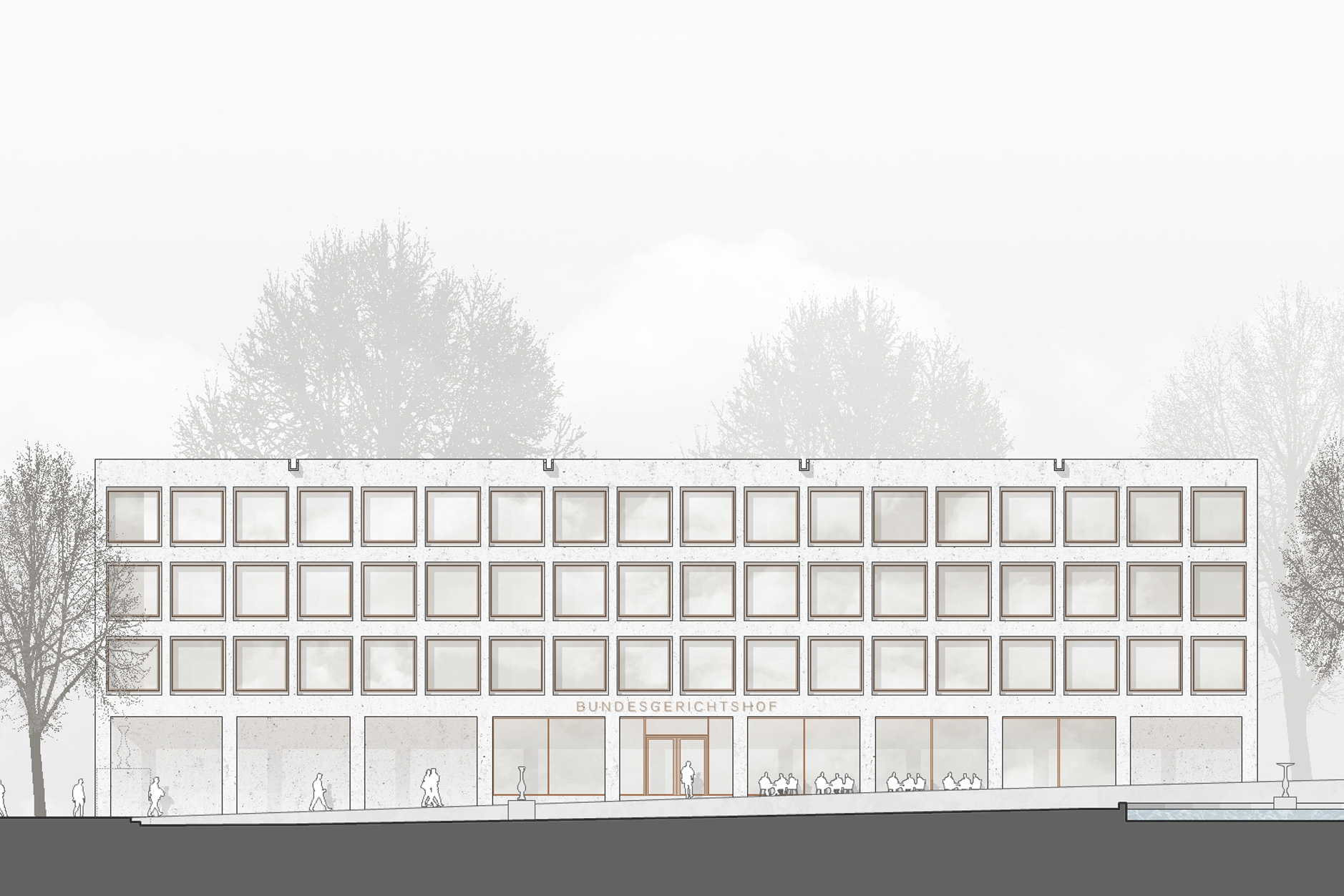 The new east building for the Federal Court of Justice is the keystone on the site of the former Hereditary Grand Ducal Palace. The building is seen as a counterpart to the Erich Schelling building opposite and completes the symmetrical spatial situation. The four-storey east building is divided into a first floor, which houses the higher-level functions, and three identical upper floors, each with two senates. Visitors reach the axially arranged main entrance via a flat ramp staircase along the eastern driveway. The water level of the two inner courtyards turns the foyer into a contemplative center of the building. In the extension of the foyer is the entrance to the courtrooms, which benefit from the view of the adjacent park. Finely bush-hammered white concrete elements combined with carefully detailed box windows in architectural bronze lend the east building a calm and classic appearance. The simple architectural appearance of the new building represents the importance of the Federal Court of Justice. The interest is not in the short-term or the contemporary aspect. Rather, the fundamental and universal aspects are of interest.