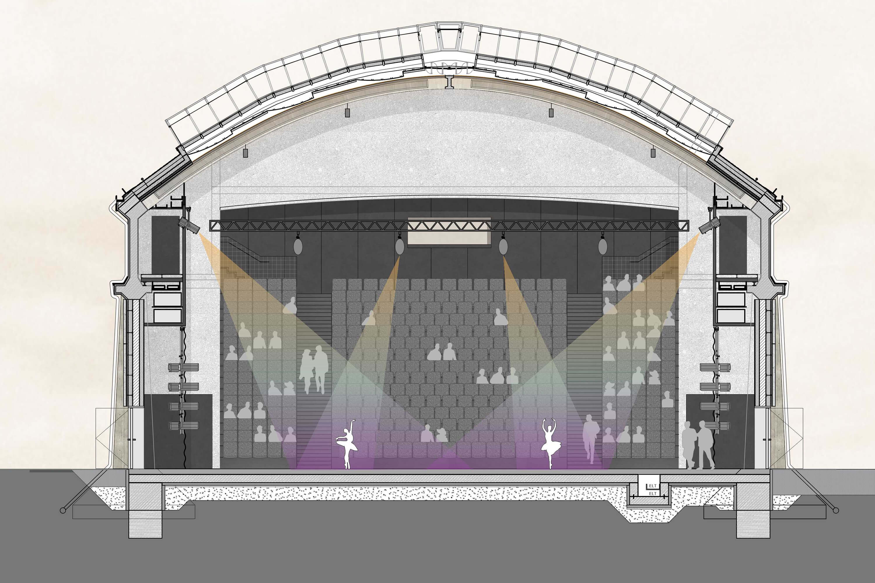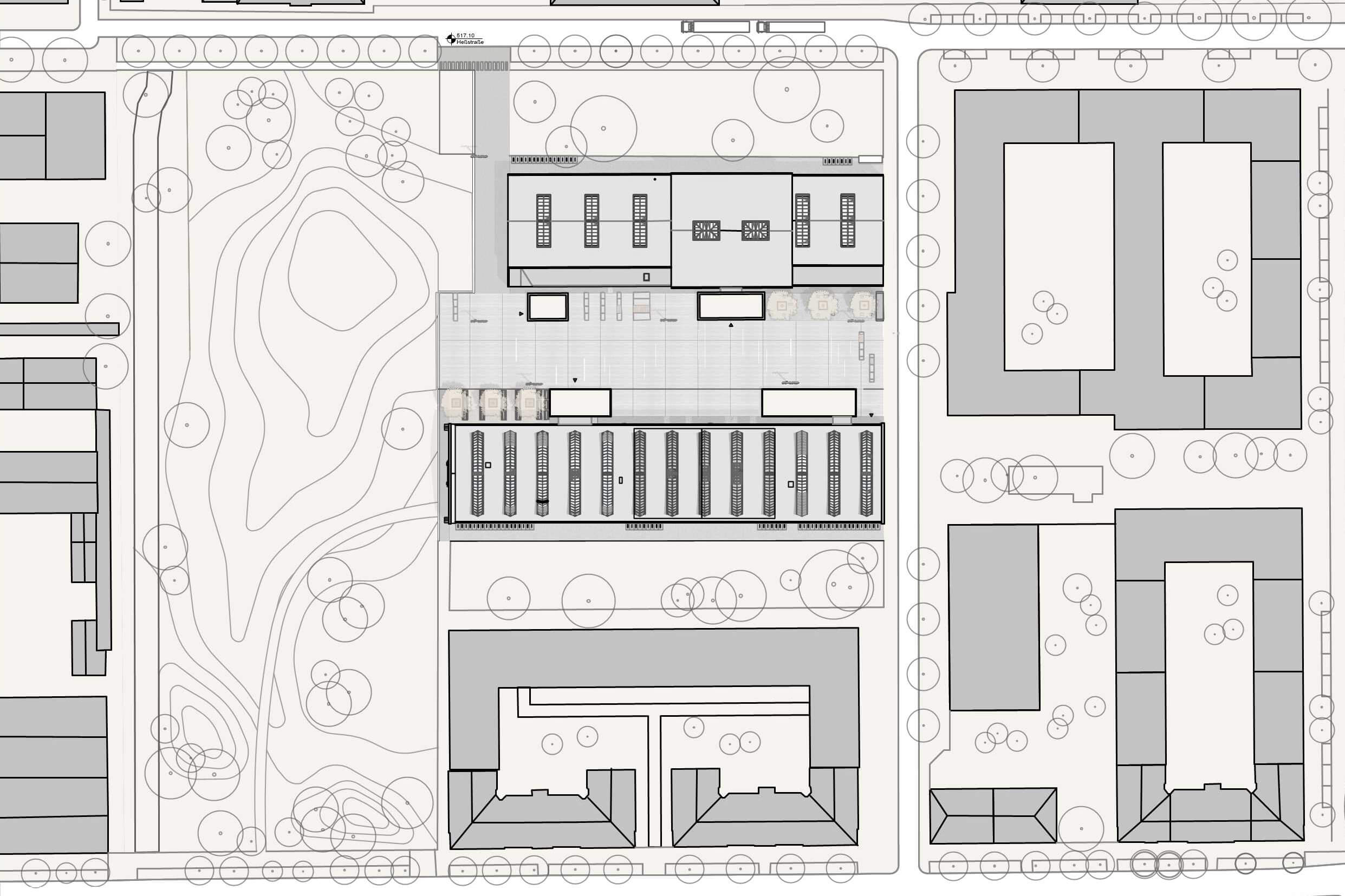 The future use of the two listed industrial halls built in 1926 forms the cultural focus in Munich's new creative quarter. The workshop character resulting from the conservation of the old building shells is to be revealed to the visitor not only in the exterior but also in the interior, which is why special importance is attached to the preservation of the load-bearing structures and the original surfaces and fixtures. Both halls will therefore be organized according to the house-in-house principle, in which the spaces between the historical shell and the new building parts serve as foyer and access areas. The filigree Tonnenhalle (barrel hall) with its band-like axial layout accommodates a large concert hall, smaller multi-purpose halls and catering areas. The rather sculptural Jutierhalle will be equipped with a modular system of connectable studio boxes, which will ensure that the spatial continuum of the hall can be experienced in the future. The result is coworking spaces that can be used in a variety of ways within, between and on the space modules.