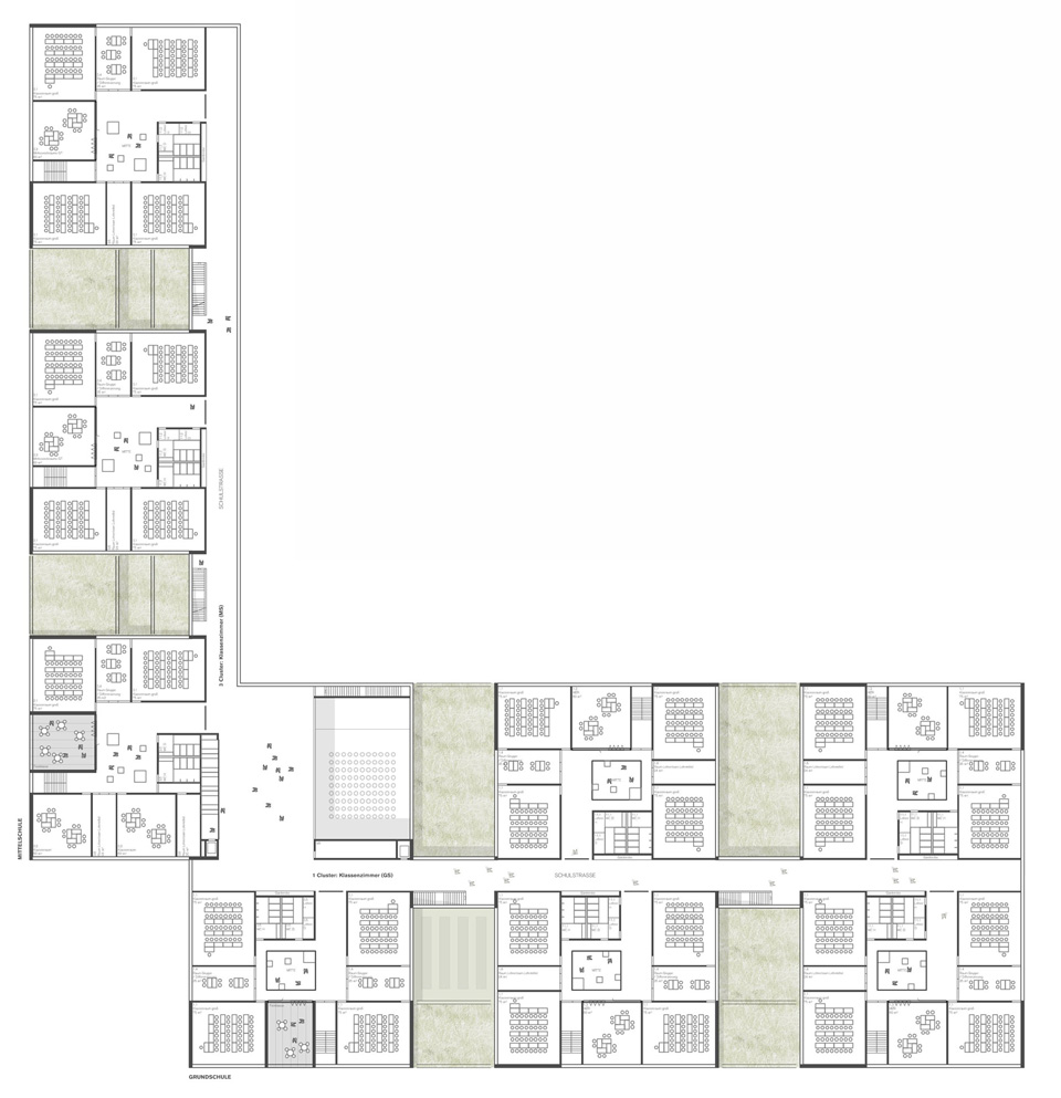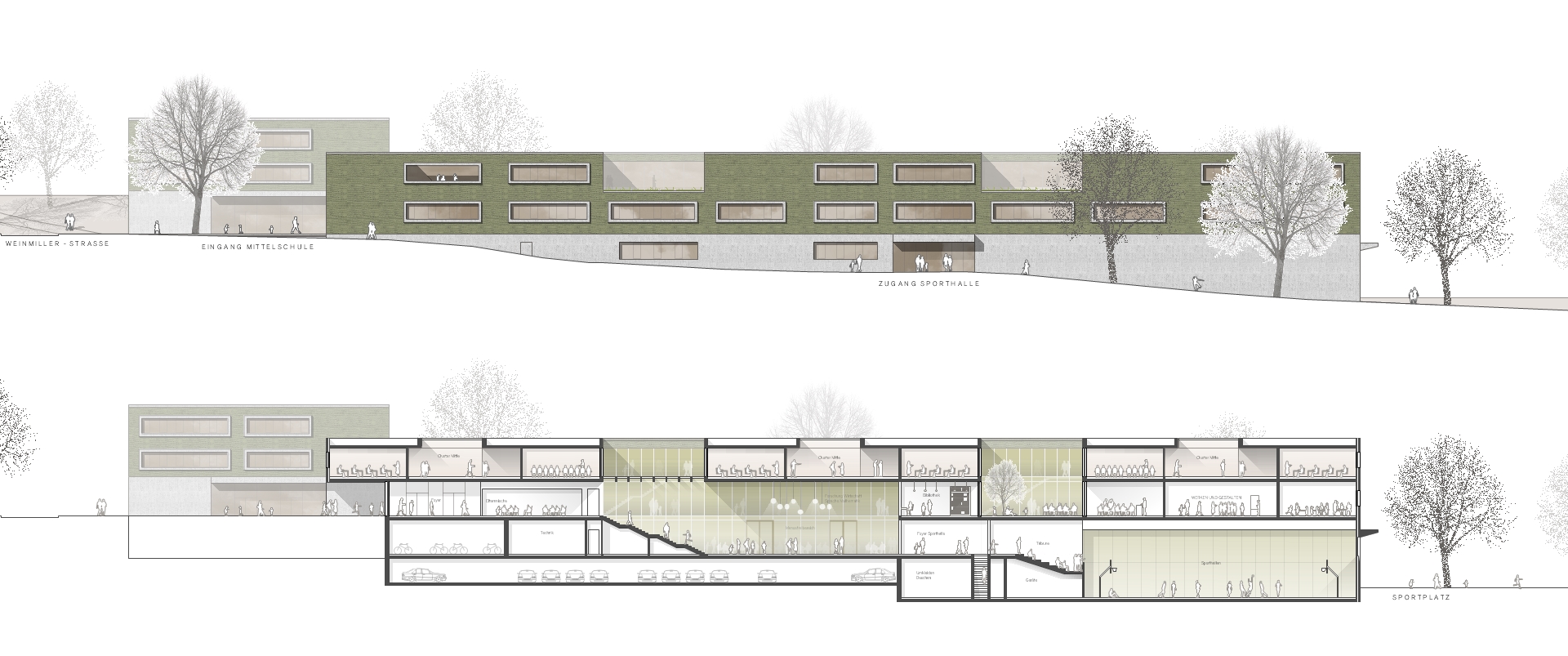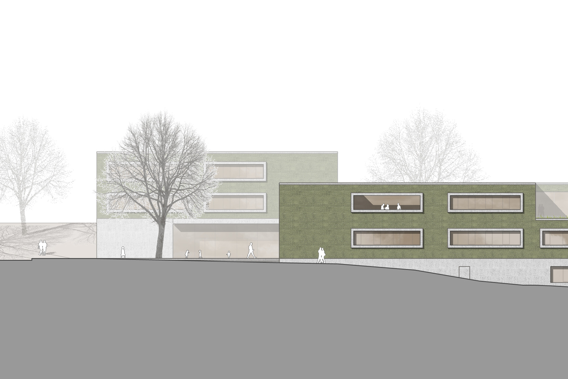 A forecourt will be created in the intersection area, which will become the common address for the schools in Steinpark. The middle school will be accessed from the square to the north and the elementary school to the east. Each school will have its own entrance and a dedicated foyer. The basic idea of the project lies in the intersection figure of the building, which transfers the functions into a clear order using the topography. A wide staircase leads down the slope to the canteen on the garden level. The sports hall forms the eastern end of the building. The class houses rise above the strong base, giving the new building an appropriate scale. Green plaster with a horizontal broom finish characterizes the class houses, whose windows are framed by precast concrete elements. The staggered heights of the building follow the contours of the terrain, so that the secondary school forms a powerful southern end to the Angers. Together, the schools enclose the tree-lined playground.