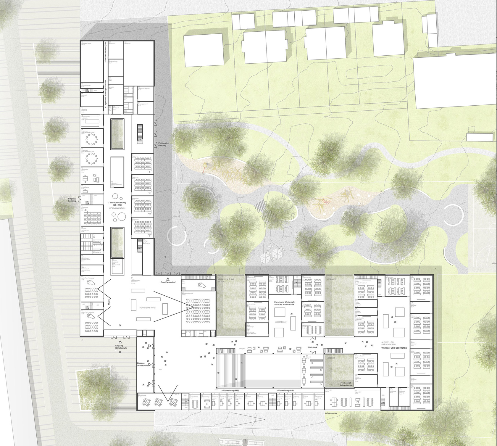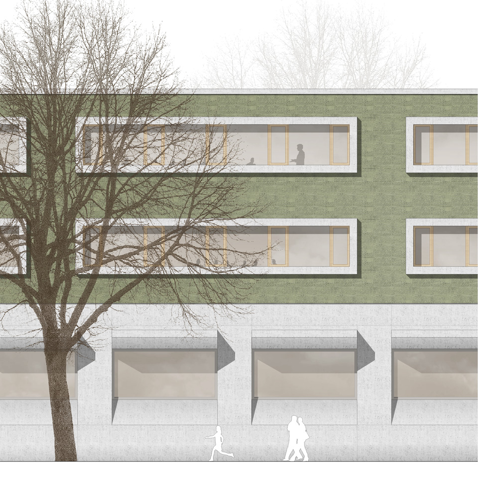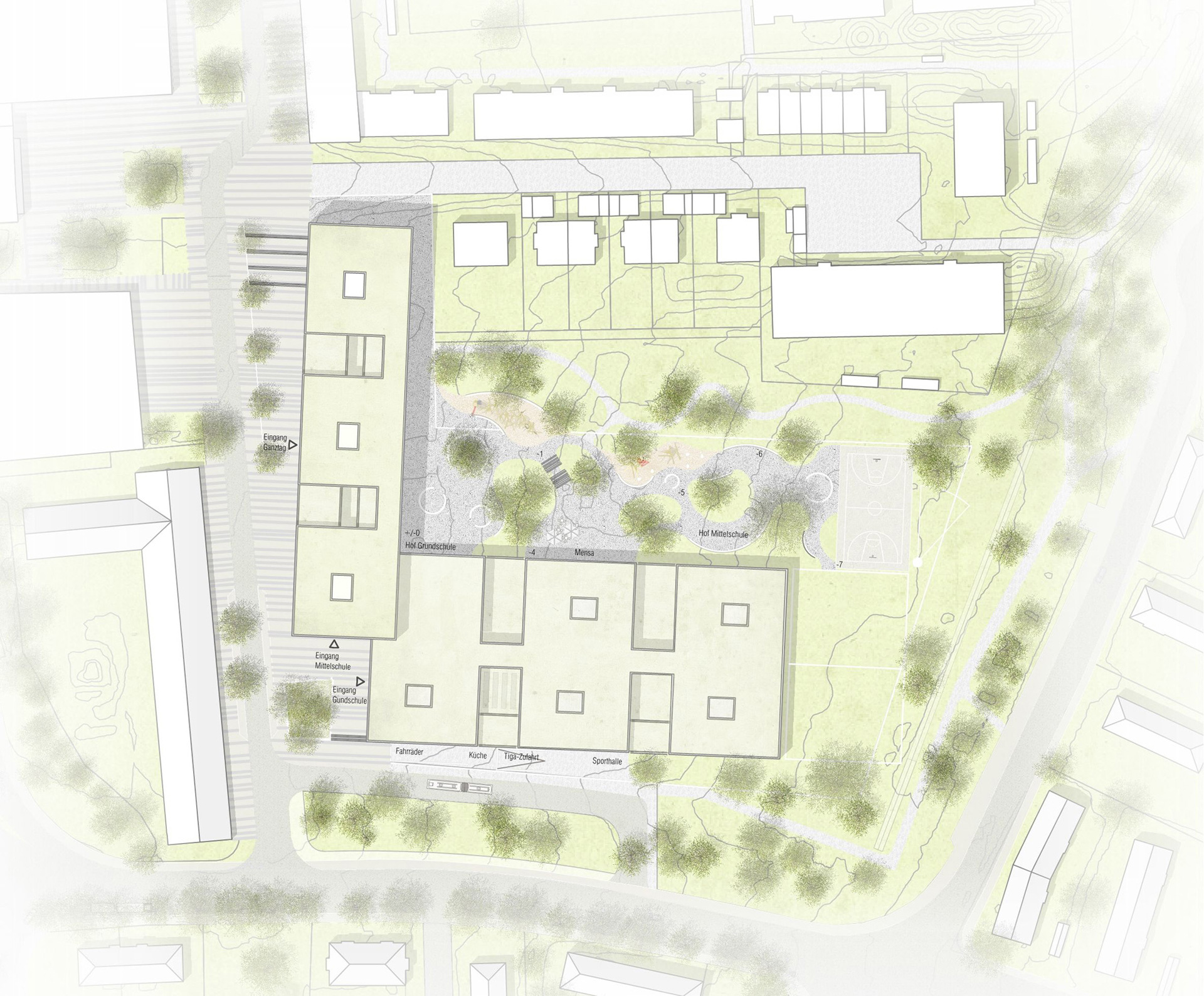 A forecourt will be created in the intersection area, which will become the common address for the schools in Steinpark. The middle school will be accessed from the square to the north and the elementary school to the east. Each school will have its own entrance and a dedicated foyer. The basic idea of the project lies in the intersection figure of the building, which transfers the functions into a clear order using the topography. A wide staircase leads down the slope to the canteen on the garden level. The sports hall forms the eastern end of the building. The class houses rise above the strong base, giving the new building an appropriate scale. Green plaster with a horizontal broom finish characterizes the class houses, whose windows are framed by precast concrete elements. The staggered heights of the building follow the contours of the terrain, so that the secondary school forms a powerful southern end to the Angers. Together, the schools enclose the tree-lined playground.